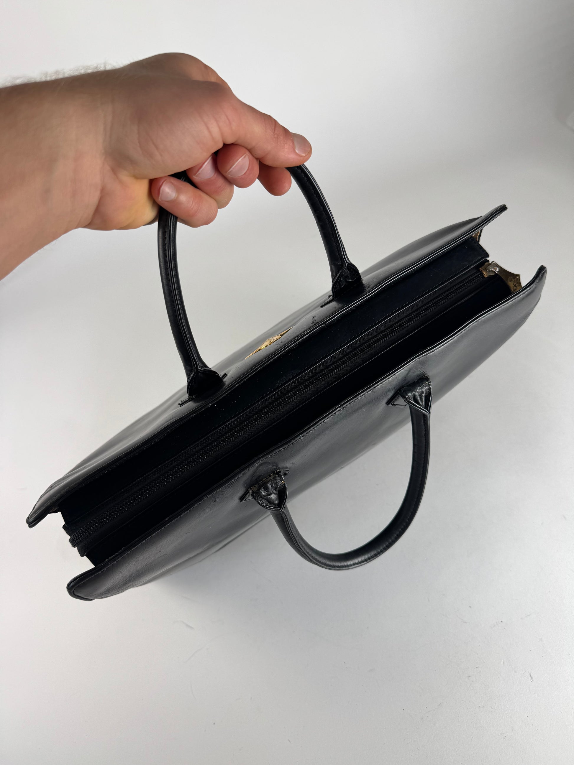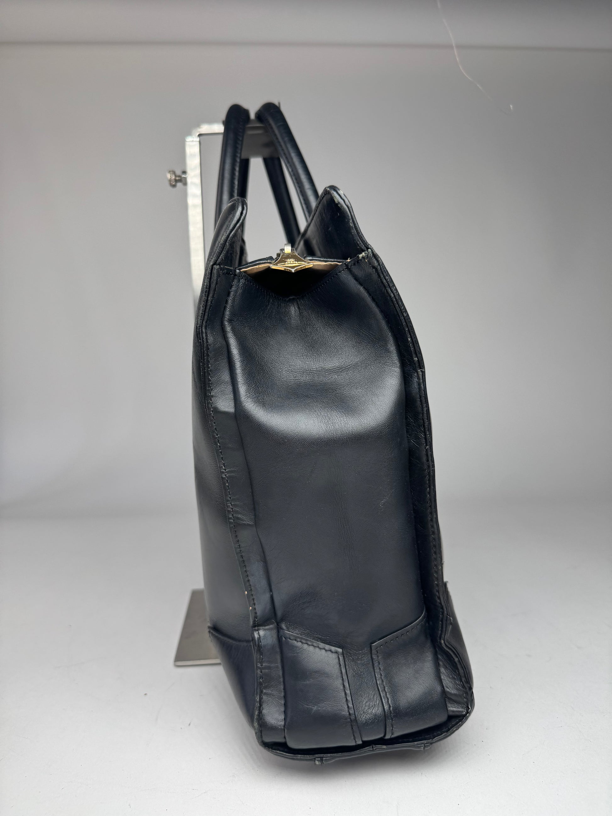 VIVIENNE WESTWOOD vintage handbag. This chic handbag is finely crafted of smooth black leather. The handbag features two short top handles and a top zipper closure. The bag opens to a beige canvas interior with Saturn logos.