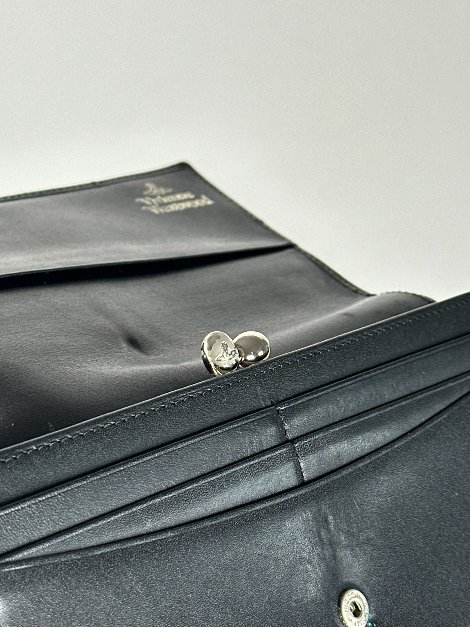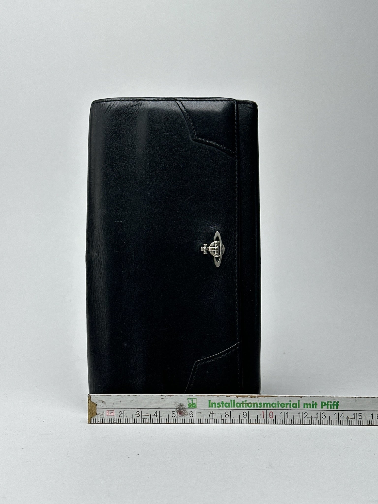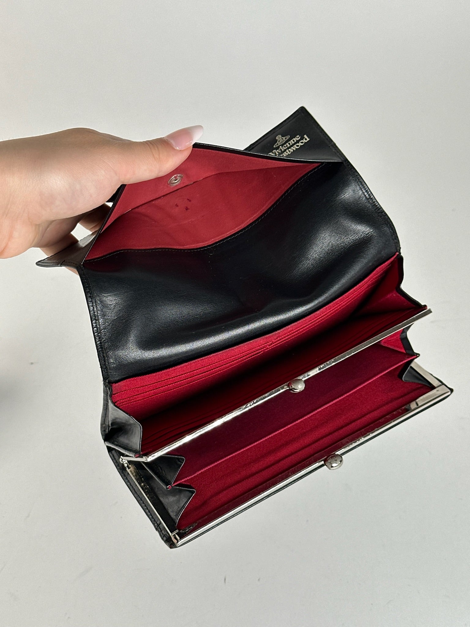 VIVIENNE WESTWOOD Vintage Black Leather Wallet. This rare vintage wallet is crafted entirely from smooth black leather and features the iconic Vivienne Westwood Saturn Orb logo in silver-tone steel on the front. It closes with both a snap button and a fold-over flap. The interior is lined in bold red canvas. The Saturn Orb logo, introduced in the late 1980s, blends royal British symbolism with a planetary ring—representing Vivienne Westwood's vision of uniting heritage with futurism.