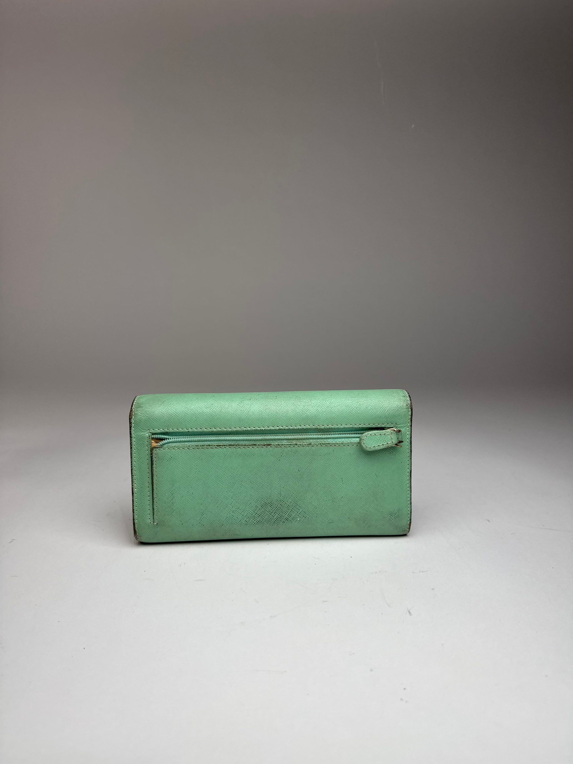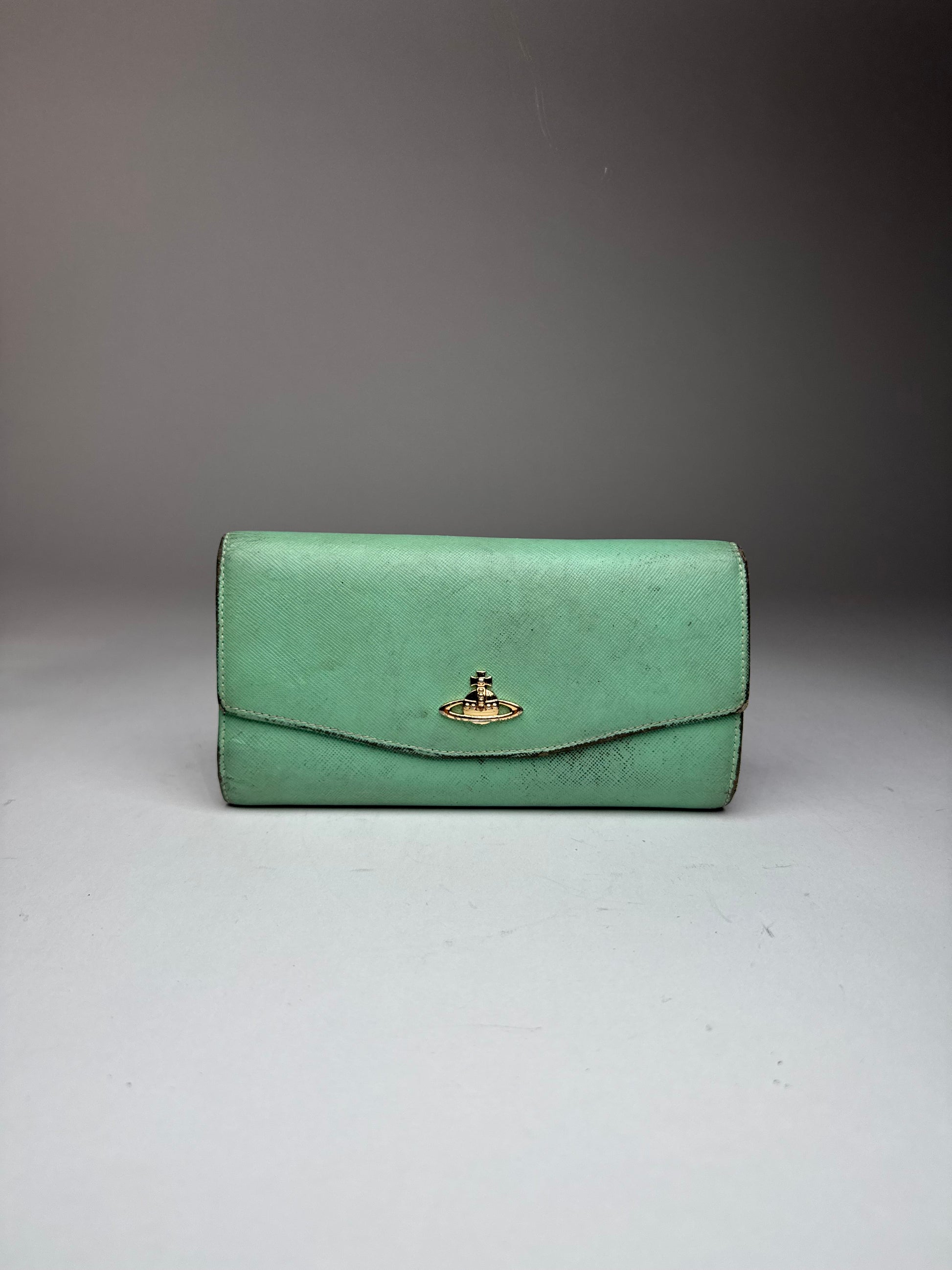VIVIENNE WESTWOOD Vintage Wallet. This stylish vintage wallet from Vivienne Westwood is crafted from mint green leather , offering a fresh and elegant look. The iconic Vivienne Westwood Saturn logo is prominently displayed on the front, adding a signature touch. The interior is lined with beige leather , providing a refined contrast. Made in Italy , this wallet is a perfect blend of style and functionality.