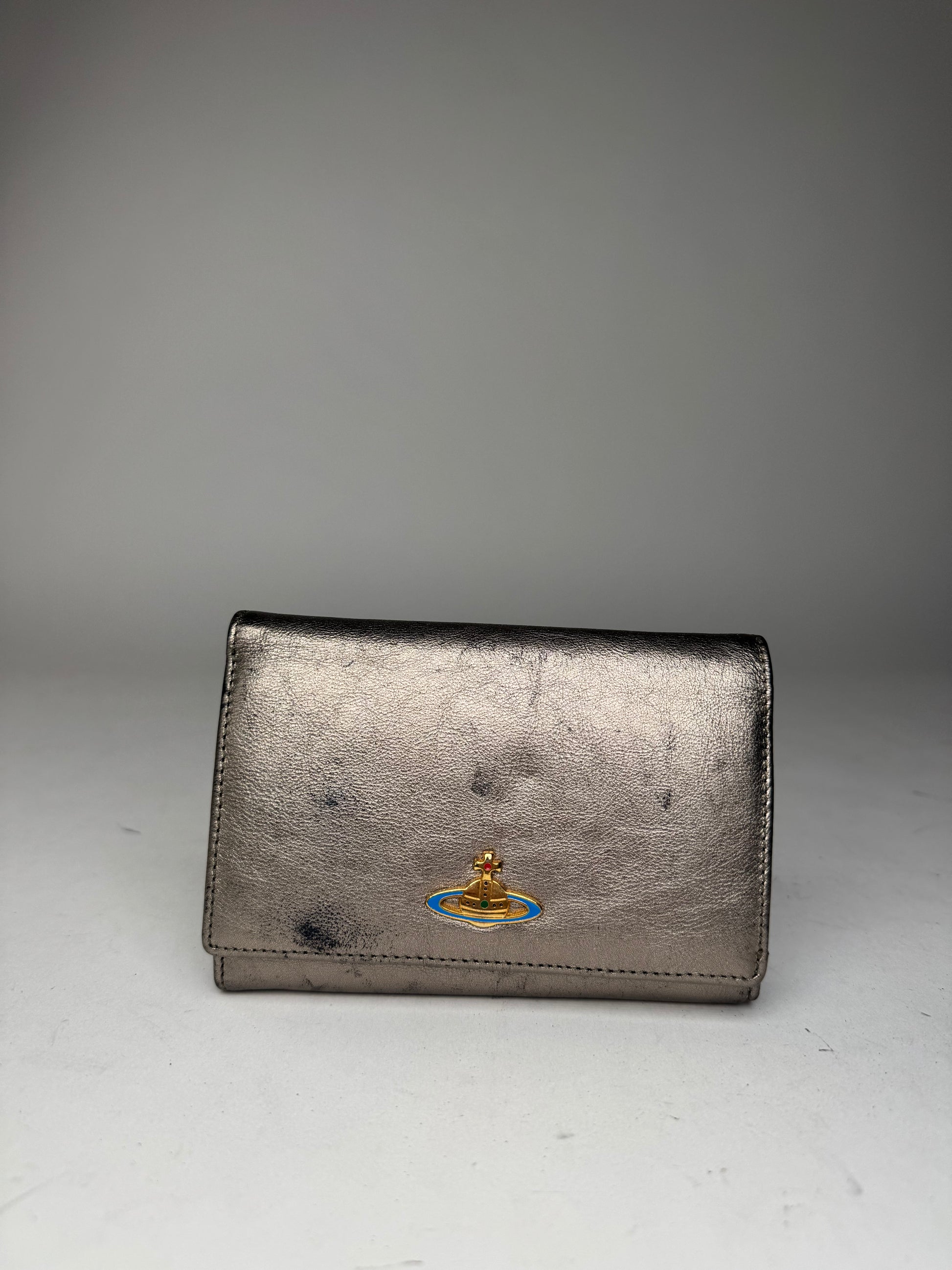 VIVIENNE WESTWOOD Vintage Silver Leather Wallet. This striking vintage piece is finely crafted of silver leather and features the iconic Vivienne Westwood Saturn Orb logo in gold and blue-tone steel on the front. A distinctive design that reflects the brand's bold British heritage.