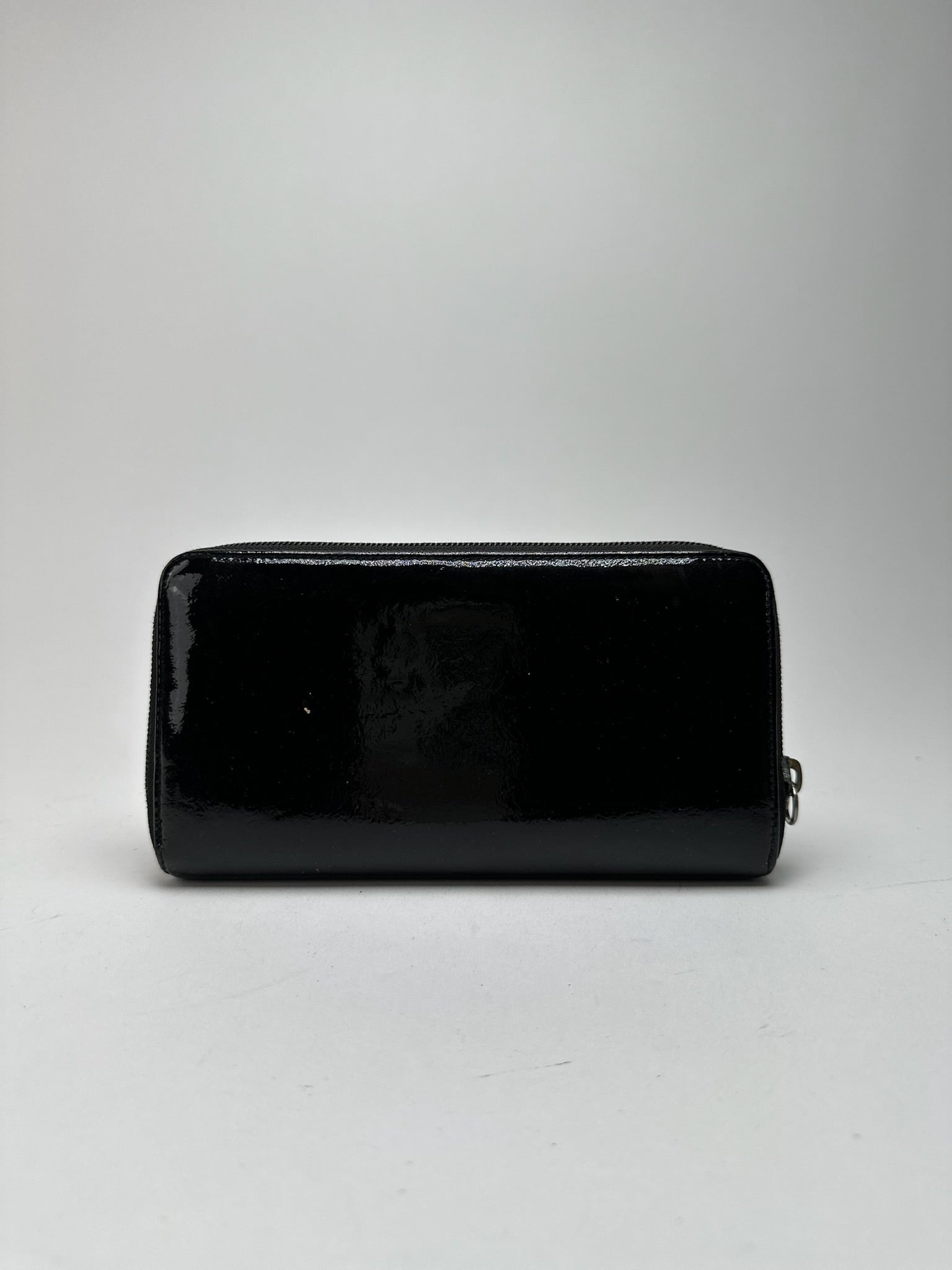 Condition Details: The zipper pull is missing. The wallet shows minor stains and scratches but remains in very good overall condition.