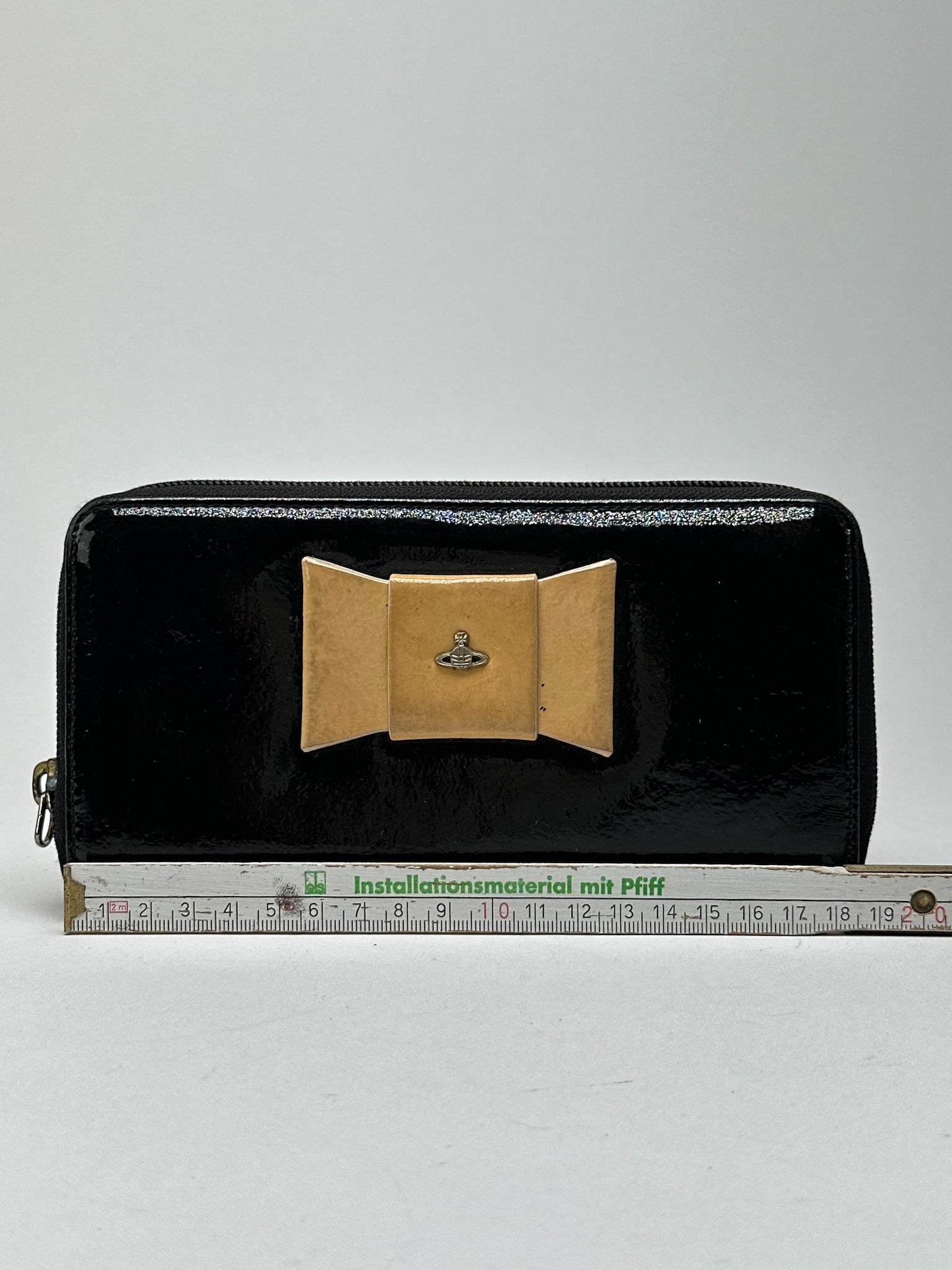 VIVIENNE WESTWOOD Vintage Black Patent Leather Wallet. This striking vintage wallet is crafted from glossy black patent leather and features a beige patent leather bow appliqué on the front. The iconic Saturn Orb logo in silver-tone steel decorates the front. The wallet is lined in black leather and includes a zip compartment, although the zipper pull is missing. Made in Italy. Introduced in the late 1980s, the Saturn Orb logo blends royal British heritage with a futuristic planetary ring—symbolizing Vivienne Westwood's vision of tradition reimagined through rebellion.