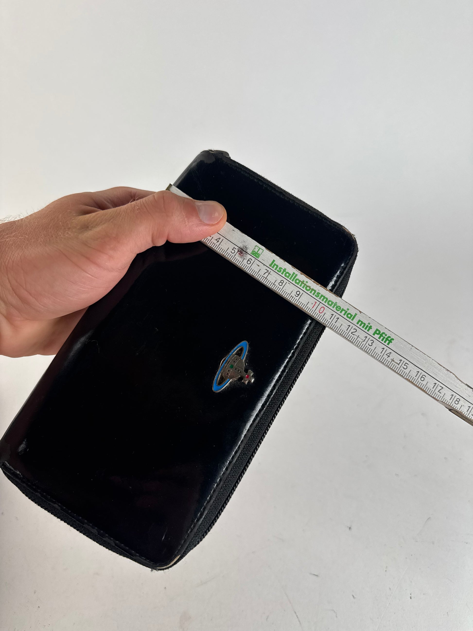 VIVIENNE WESTWOOD Vintage Patent Wallet. This vintage wallet is finely crafted of black patent leather, featuring the signature Saturn orb logo in silver-toned steel, hand-painted in blue, red, and green. The wallet secures with a top zipper closure.