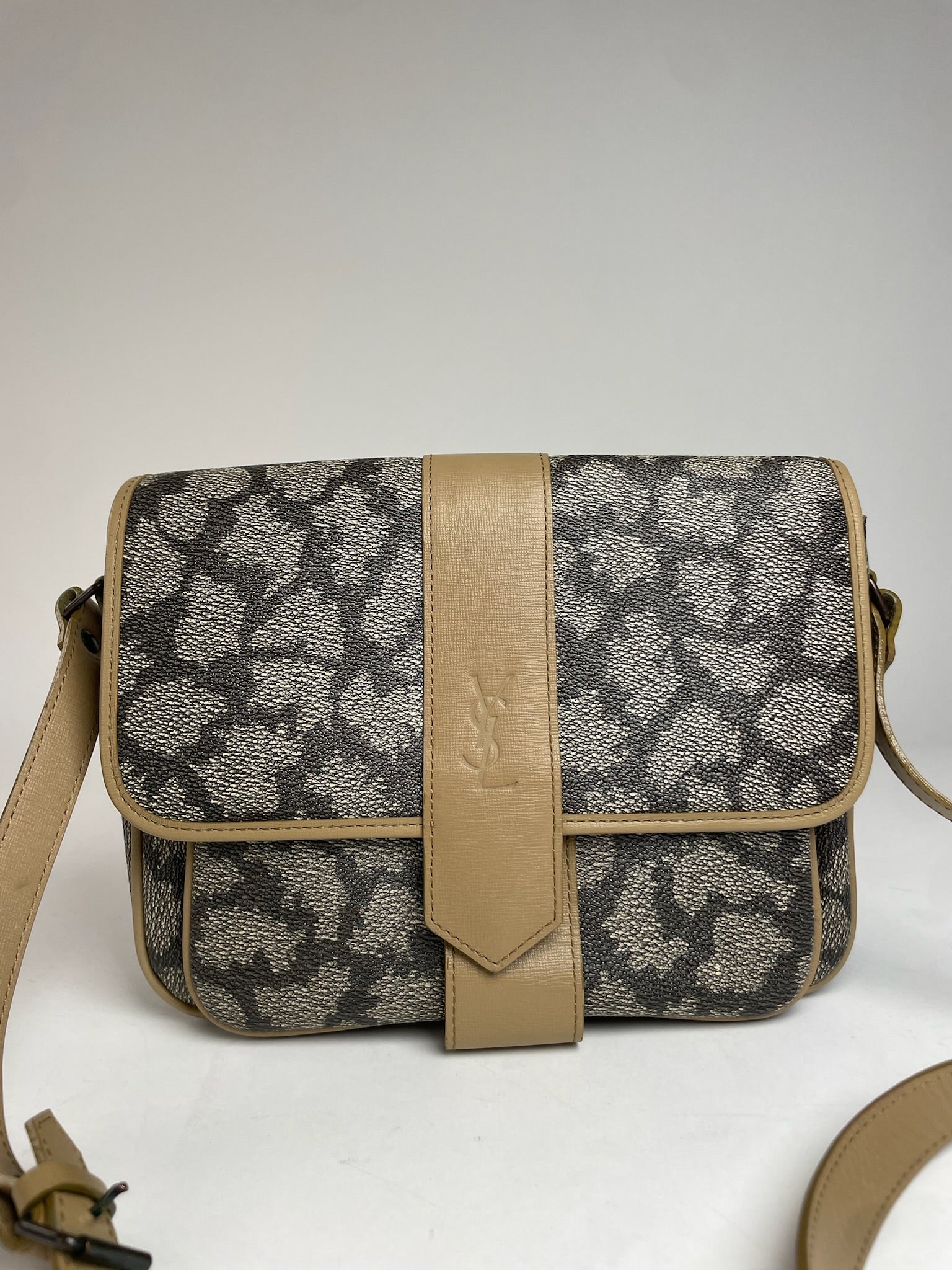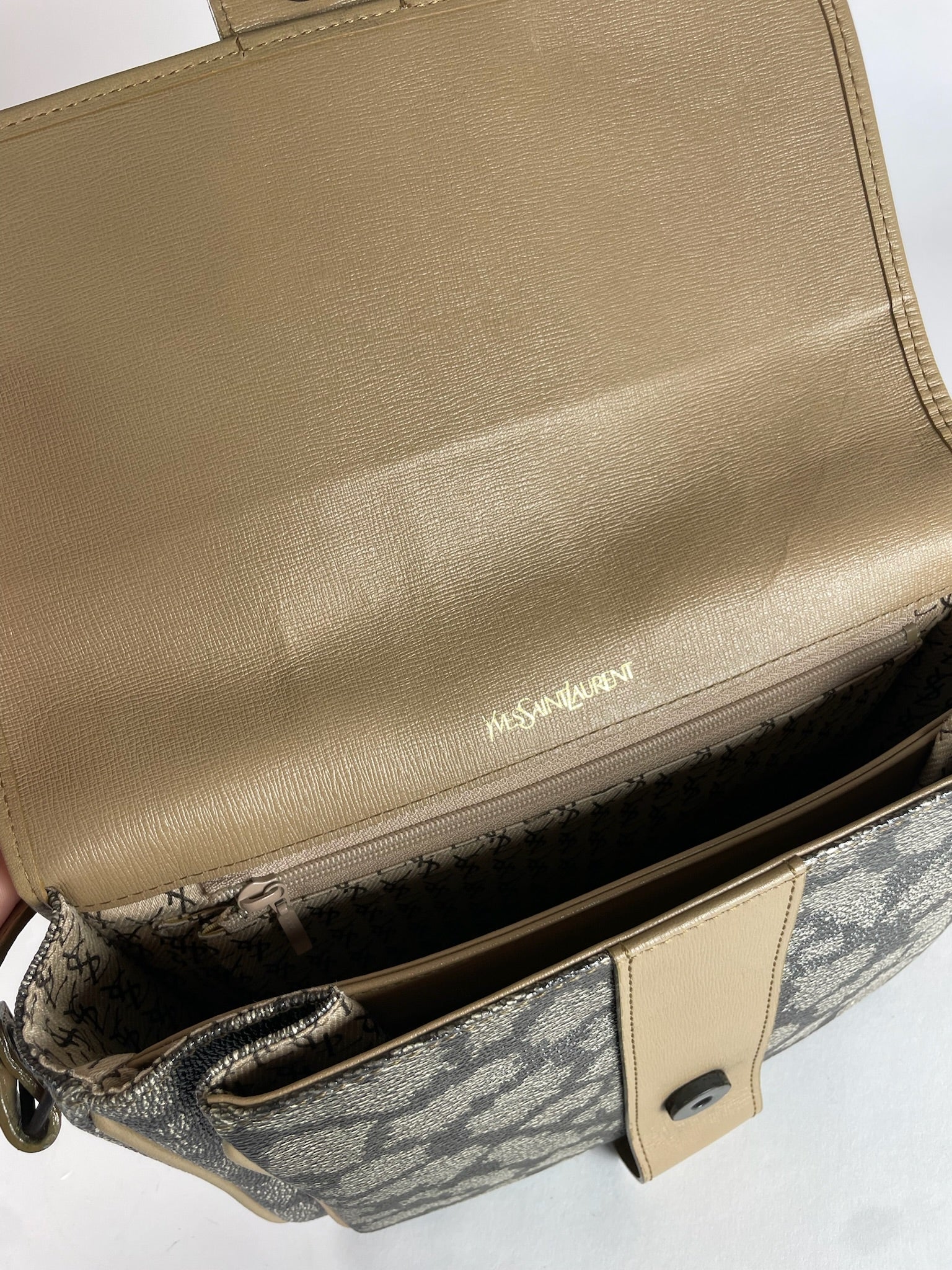 YVES SAINT LAURENT Vintage Shoulder / Crossbody Bag. This elegant vintage shoulder or crossbody bag is crafted of grey stone-effect patterned leather, complemented by beige-brown leather details. The bag features an adjustable shoulder strap, anthracite-tone steel hardware, and a magnetic closure. The Yves Saint Laurent logo is embossed on the front. The interior opens to a matching leather lining. Likely from the 1980s.