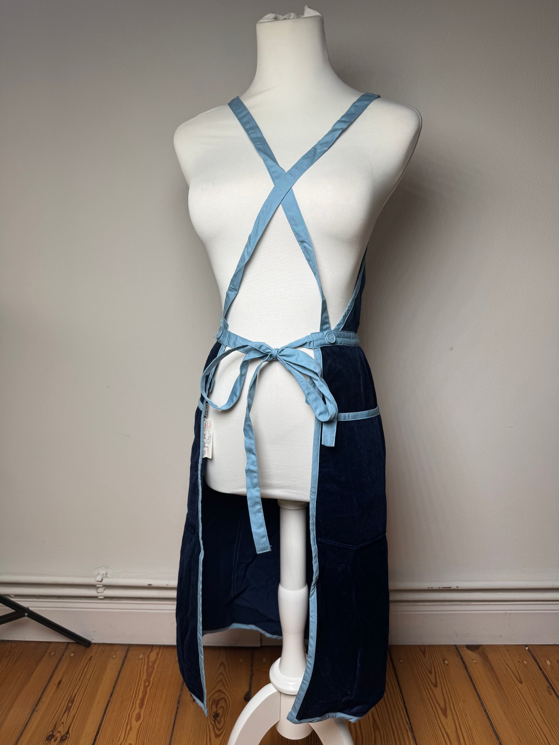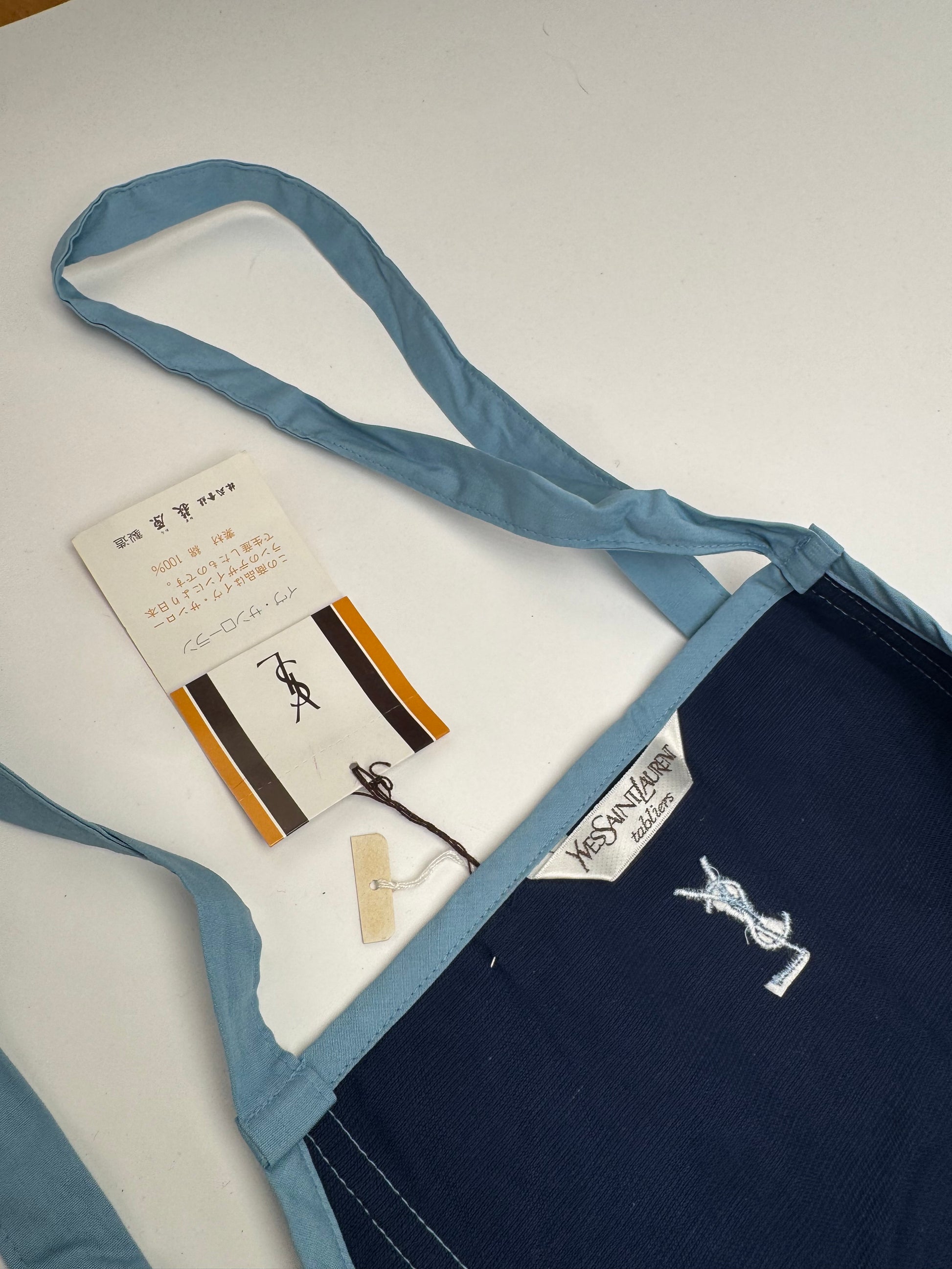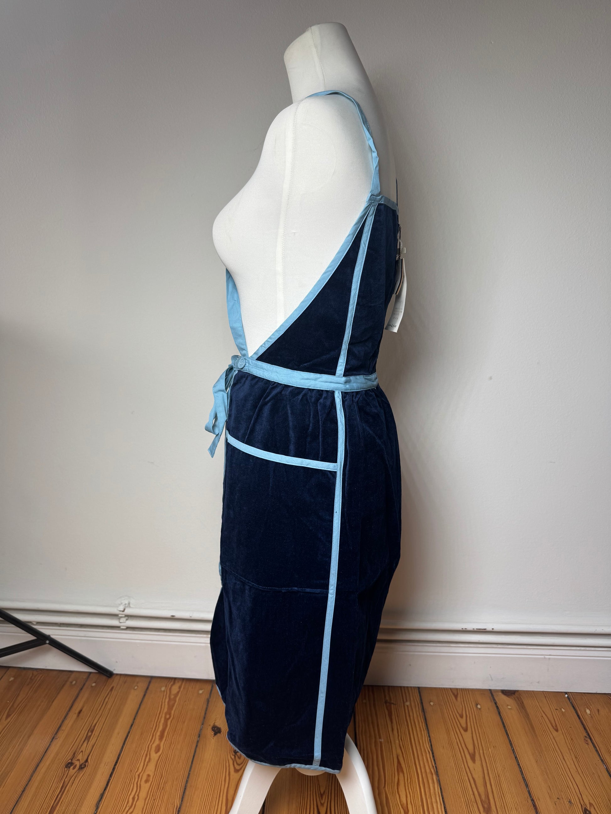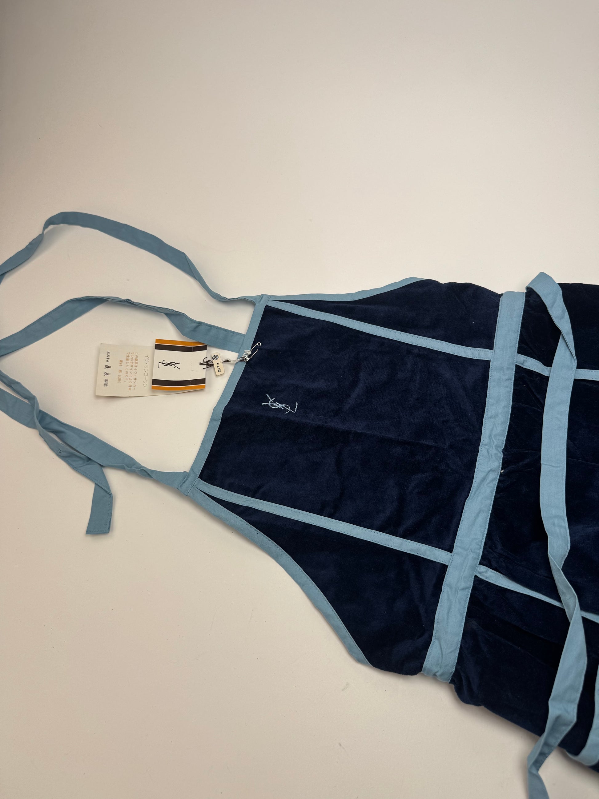 YVES SAINT LAURENT Vintage Dress / Apron. This distinctive vintage piece is crafted of rich navy velour combined with blue canvas. The design features turquoise plastic buttons and a turquoise Yves Saint Laurent YSL logo applied on the back, adding a bold signature accent. The mannequin in the photos is size 38 / M.