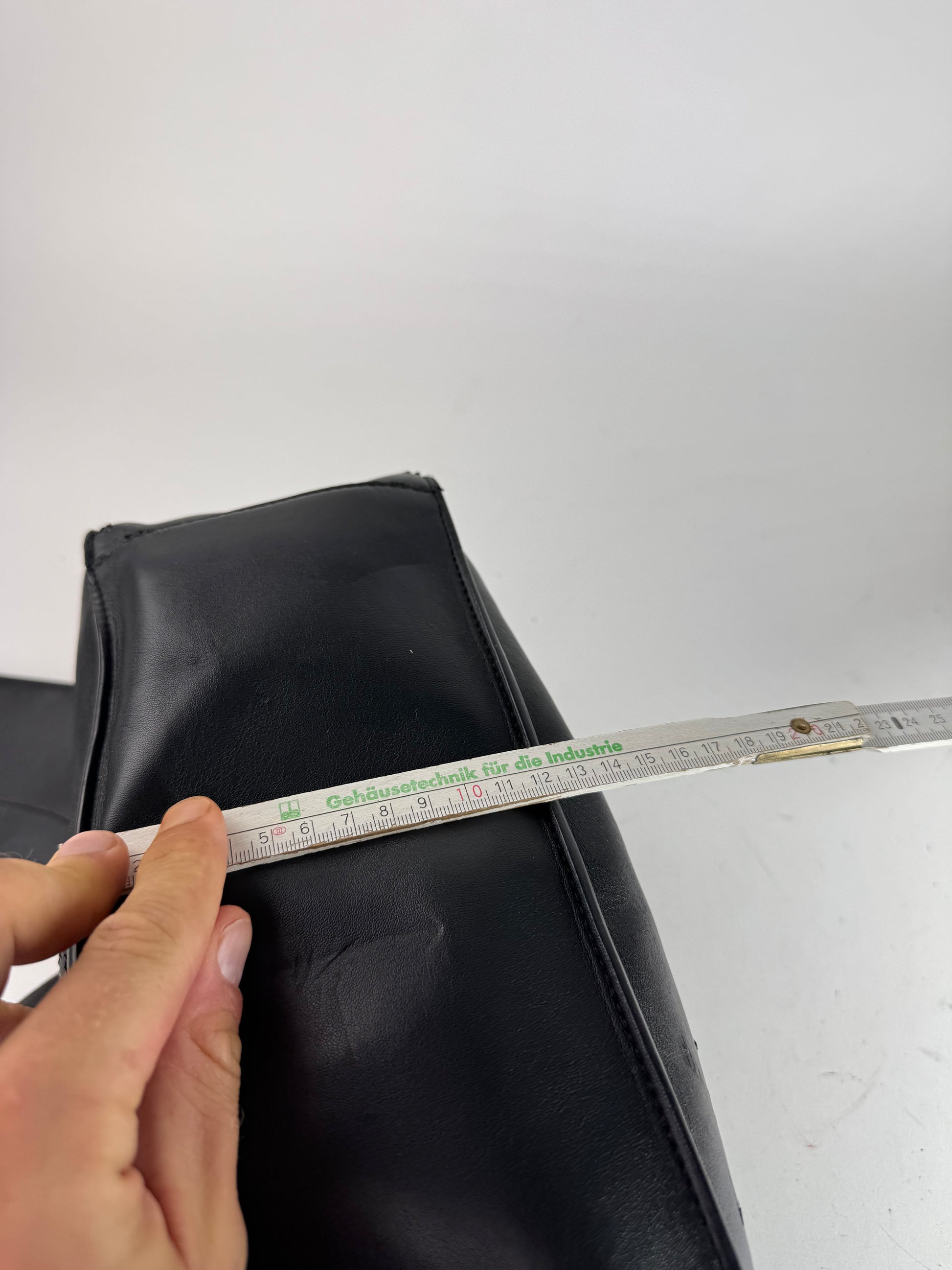 État : L'extérieur en cuir vegan est propre, avec quelques traces d'usure sur les poignées et le logo. Les finitions sont brillantes et présentent de légères rayures. La doublure intérieure en daim est bien conservée et présente peu de traces d'utilisation.