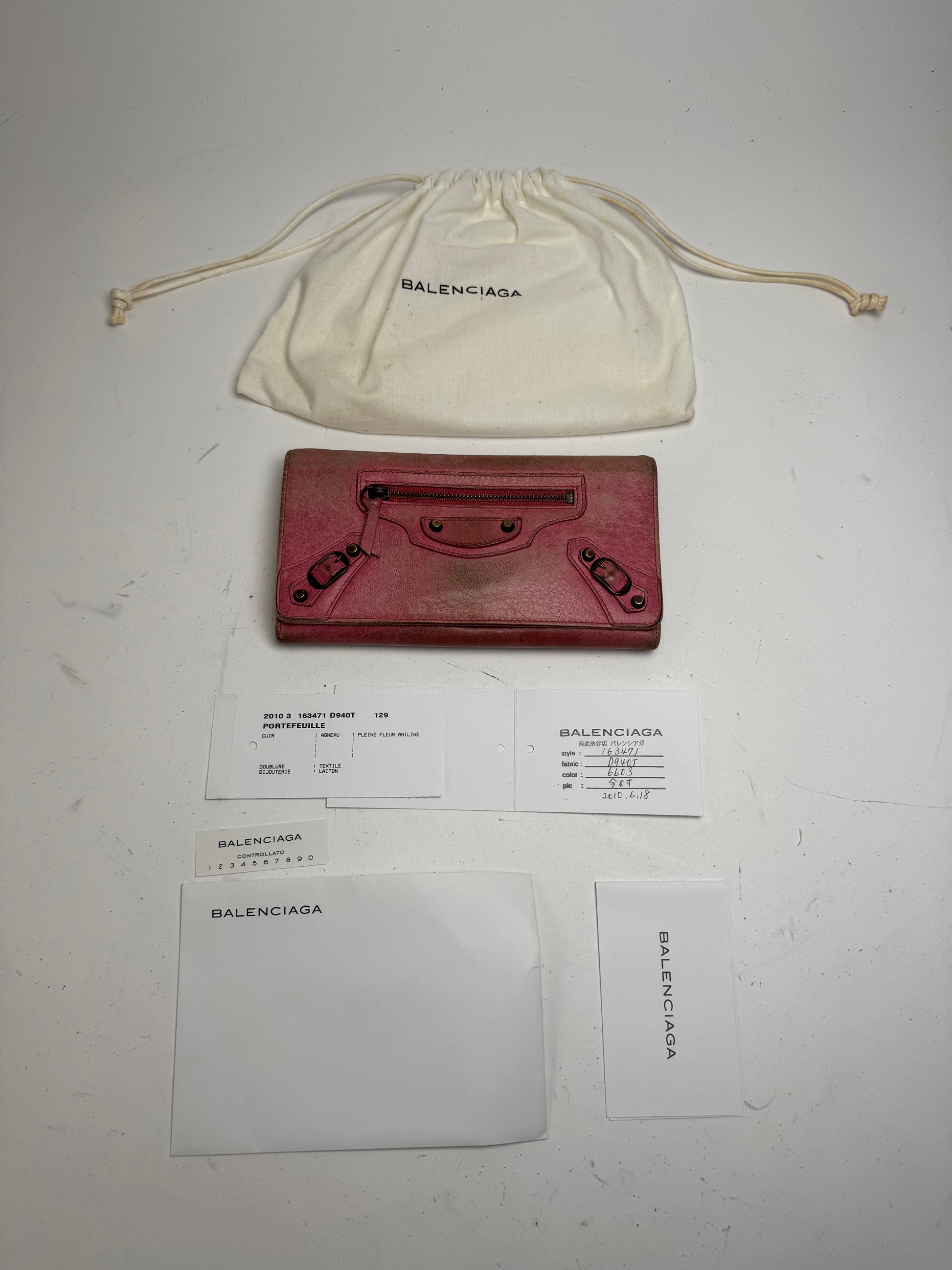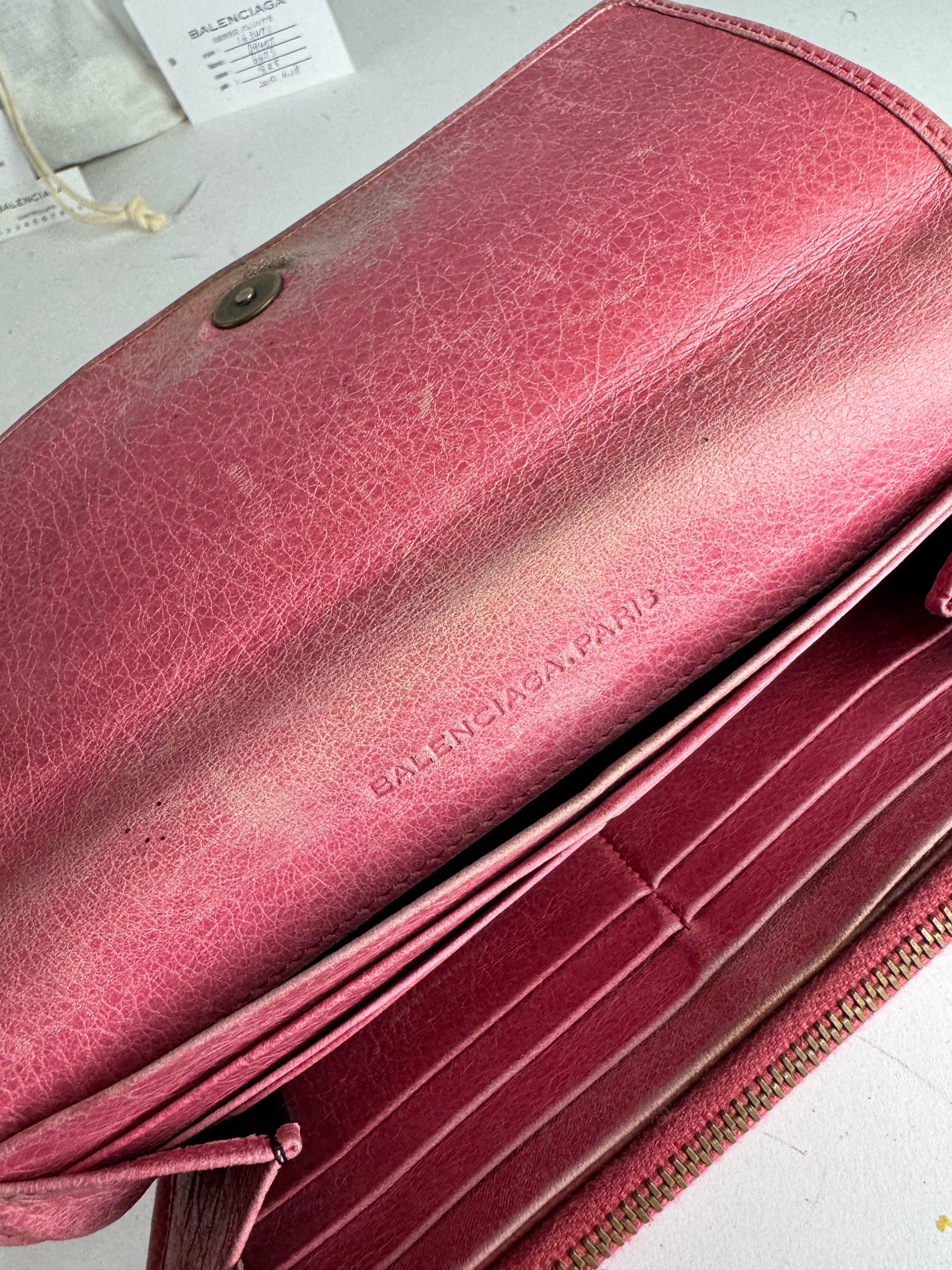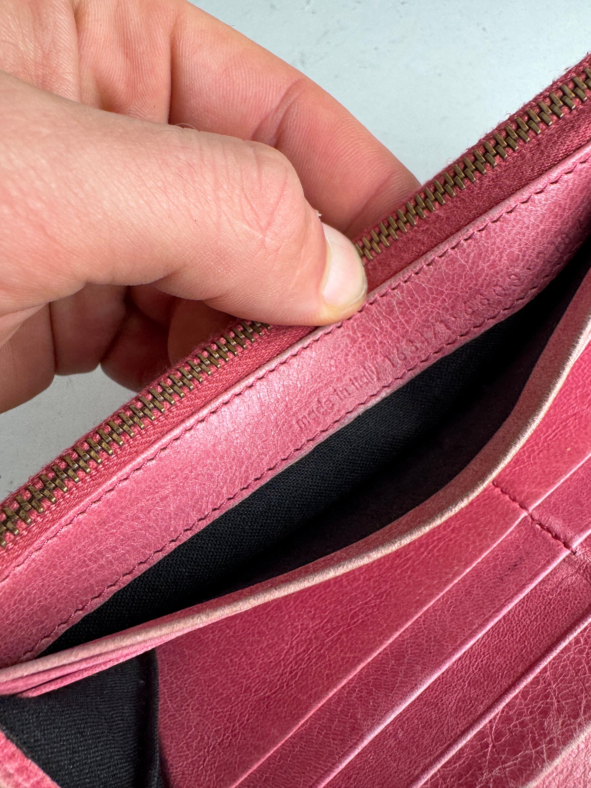 This stylish wallet is finely crafted of pink leather in the iconic City Bag design — a hallmark of Balenciaga’s early 2000s collection that became a symbol of effortless Parisian cool. Renowned for its edgy hardware and soft distressed leather, the City line remains one of the house’s most beloved creations.