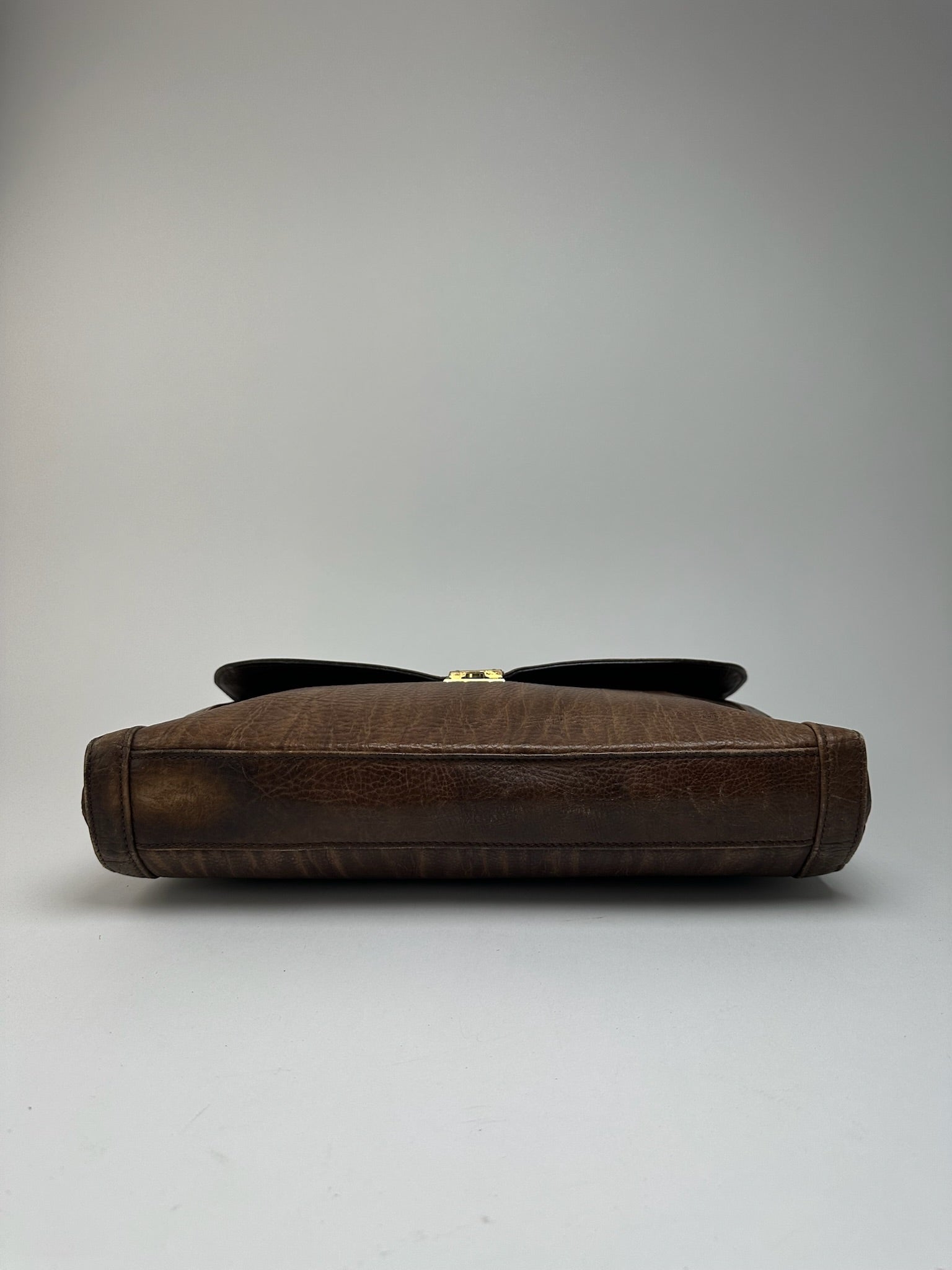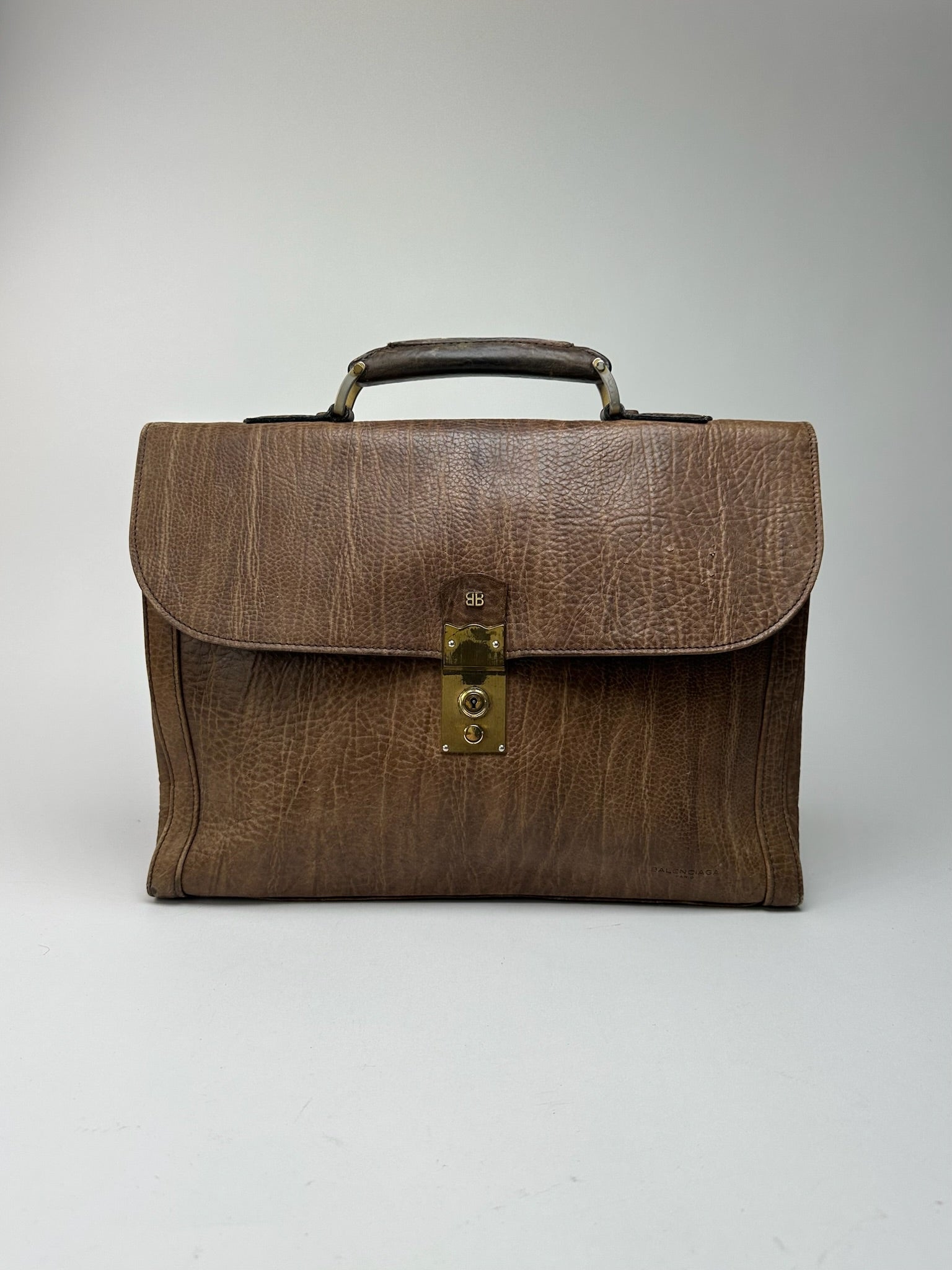 Serviette vintage BALENCIAGA. Cette serviette structurée, finement confectionnée en cuir texturé marron, est dotée d'un rabat avant avec fermoir à clé en acier doré. Le devant est estampé du logo BALENCIAGA classique. Le sac est doté d'une poignée supérieure robuste et d'une poche extérieure zippée à l'arrière pour plus de fonctionnalité.