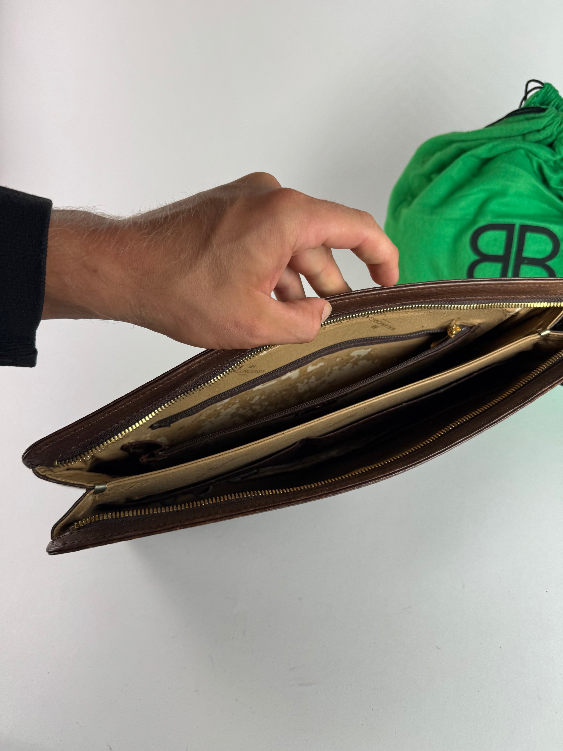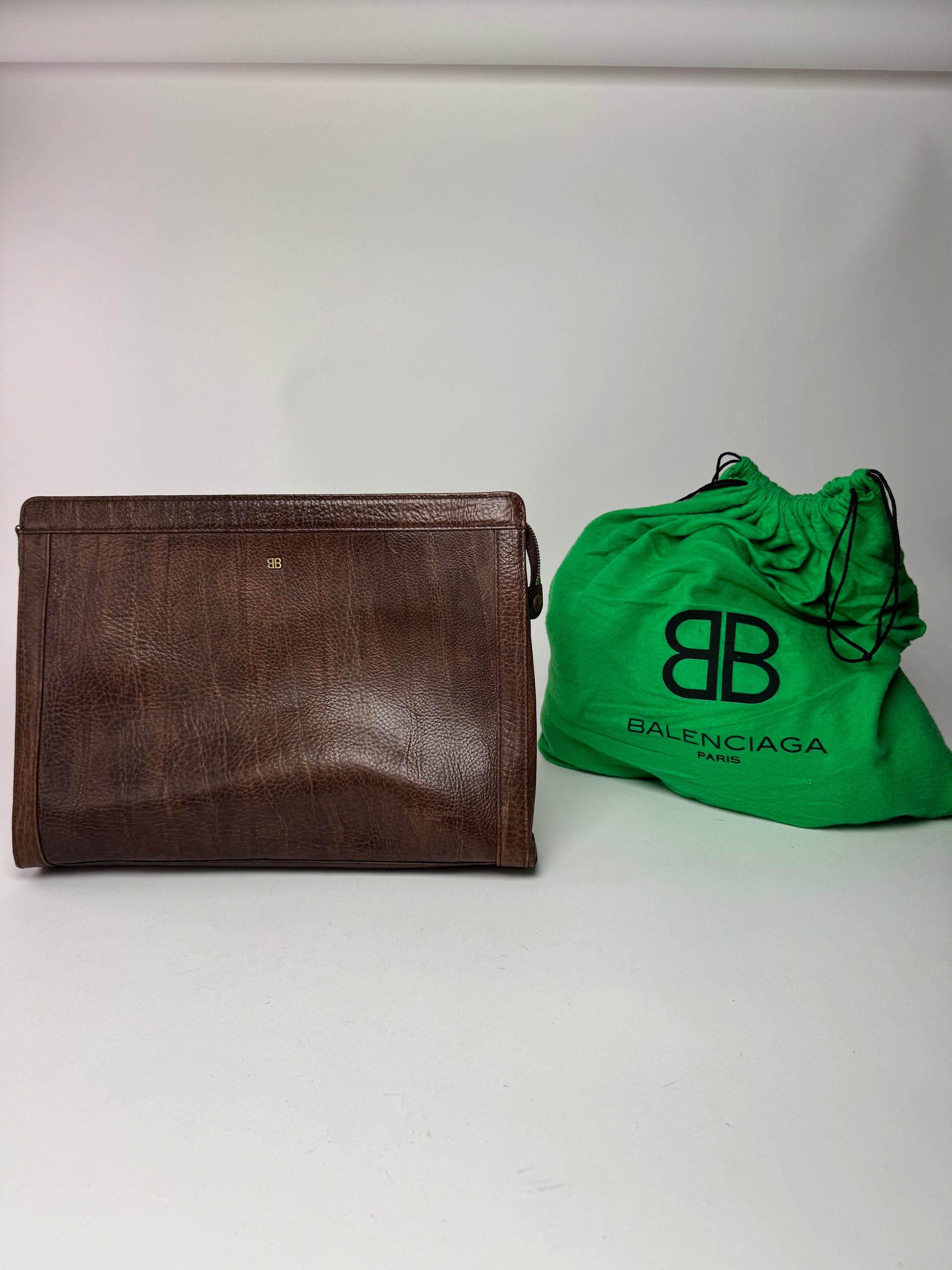 Cette pochette vintage signée Balenciaga est confectionnée en cuir marron intense et arbore l'emblématique logo BB en acier doré poli sur le devant. Une signature Balenciaga subtilement embossée sublime la pièce. Elle s'ouvre par une fermeture éclair sur le dessus et s'ouvre sur un intérieur en toile enduite beige-marron, orné du lettrage Balenciaga répété. Attention : le revêtement intérieur s'écaille et doit idéalement être nettoyé soigneusement ou remplacé. Malgré cela, cette pochette reste une pièce vintage remarquable.