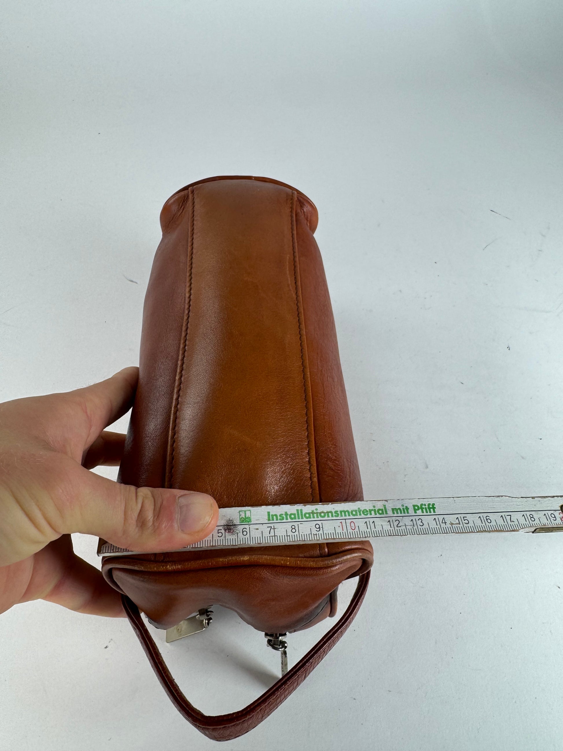 Cette pochette vintage chic est finement confectionnée en cuir marron orangé. Elle comporte deux compartiments zippés et une bandoulière en cuir latérale pour une fixation facile. L'intérieur est doublé de toile rayée noire et grise.