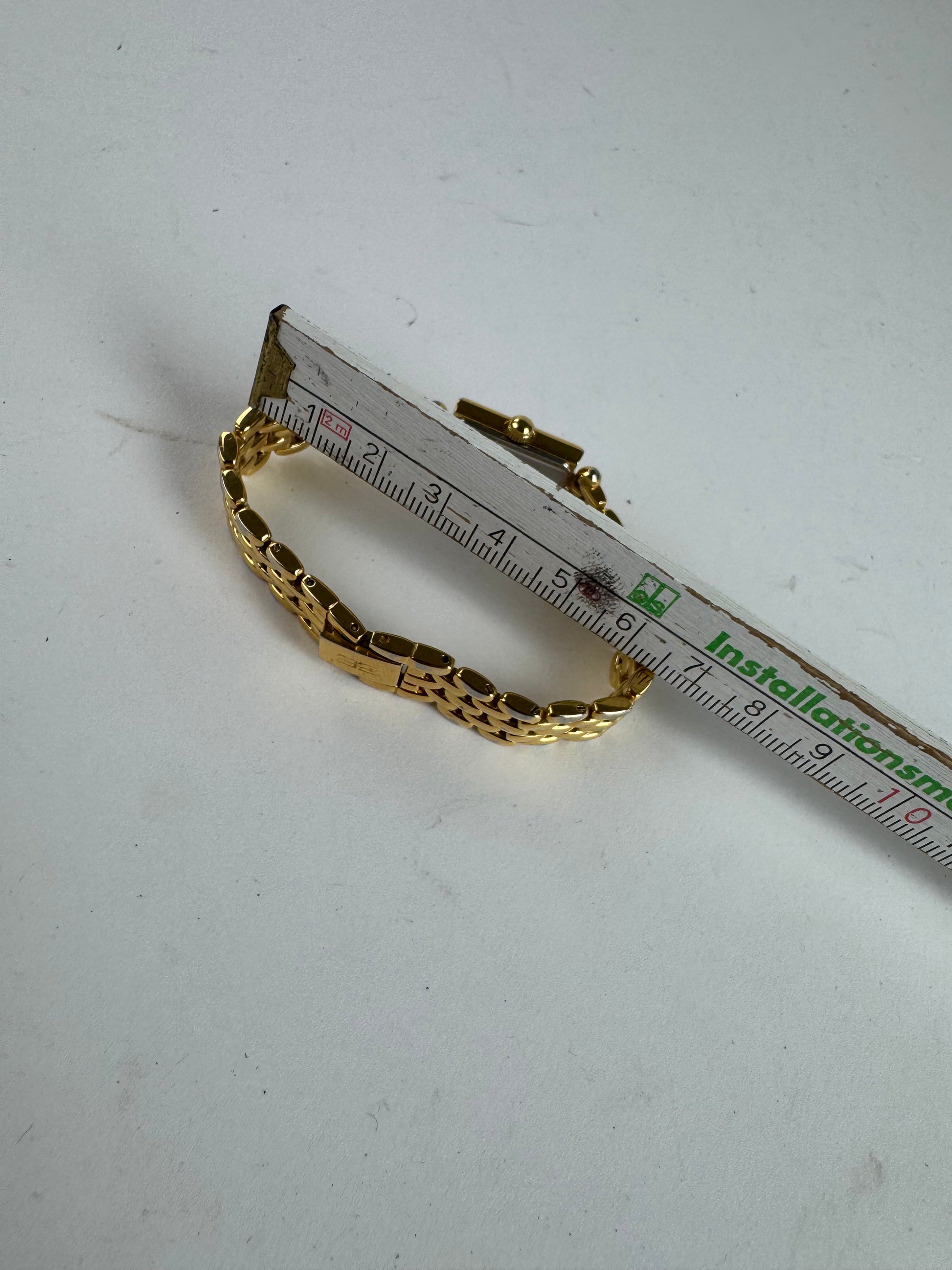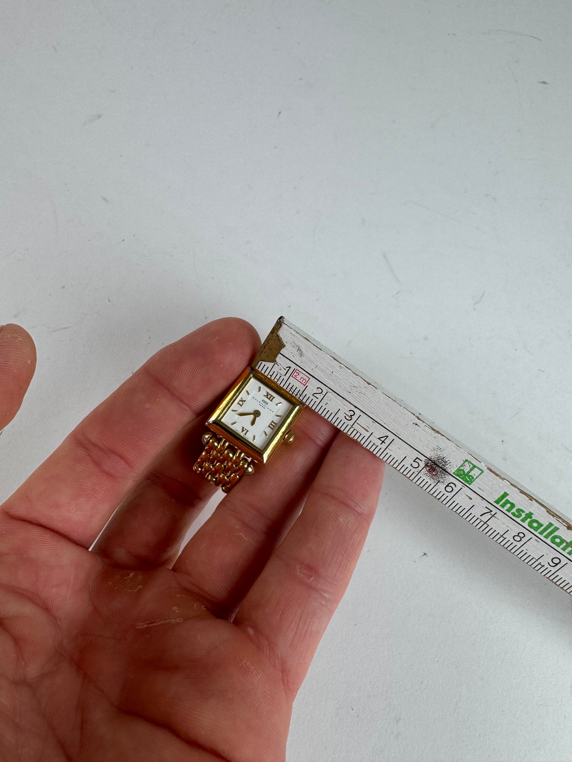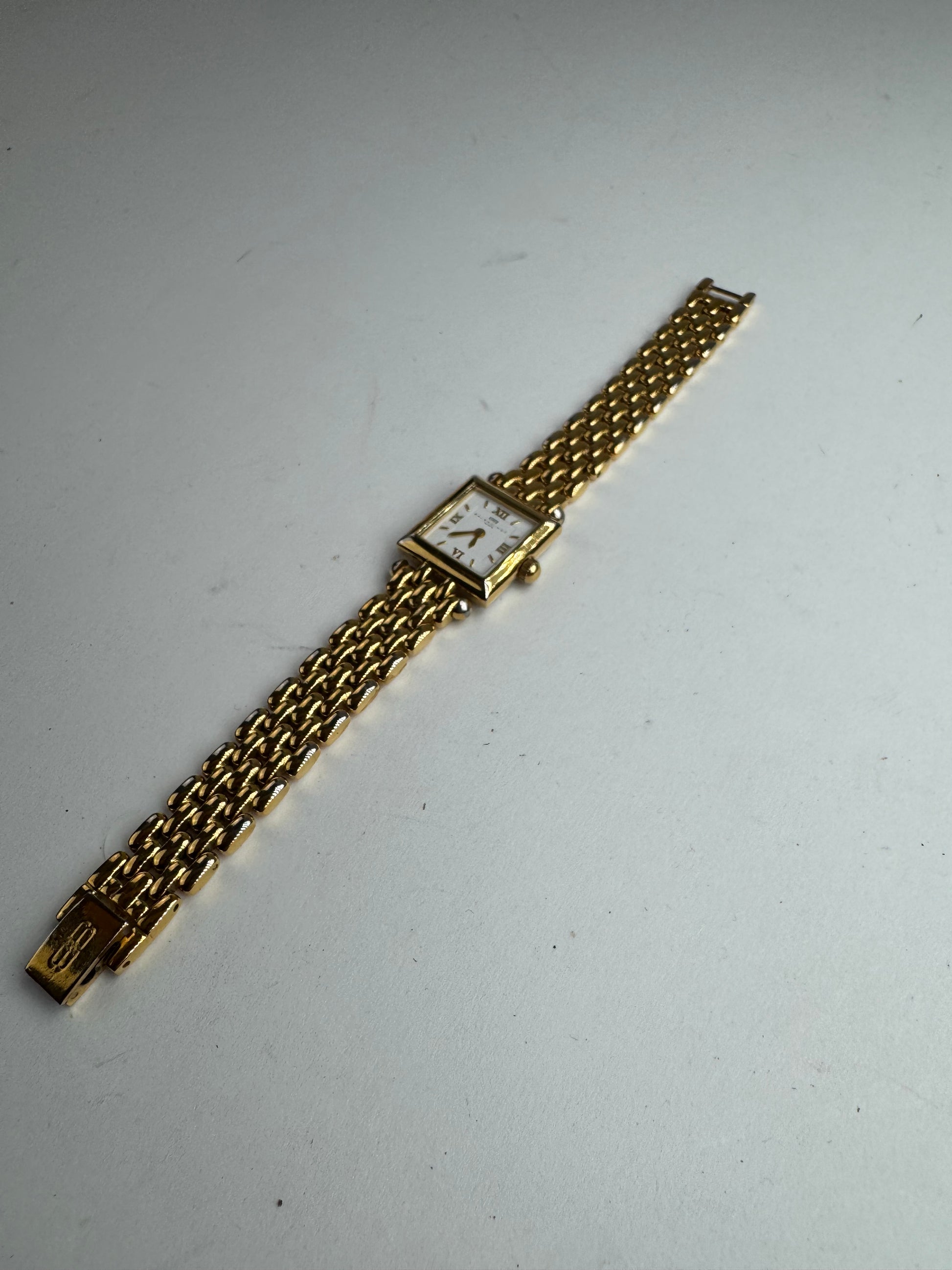 État : La montre présente de légères rayures et une décoloration de sa finition dorée, mais elle reste globalement en très bon état. La pile est neuve et parfaitement fonctionnelle.