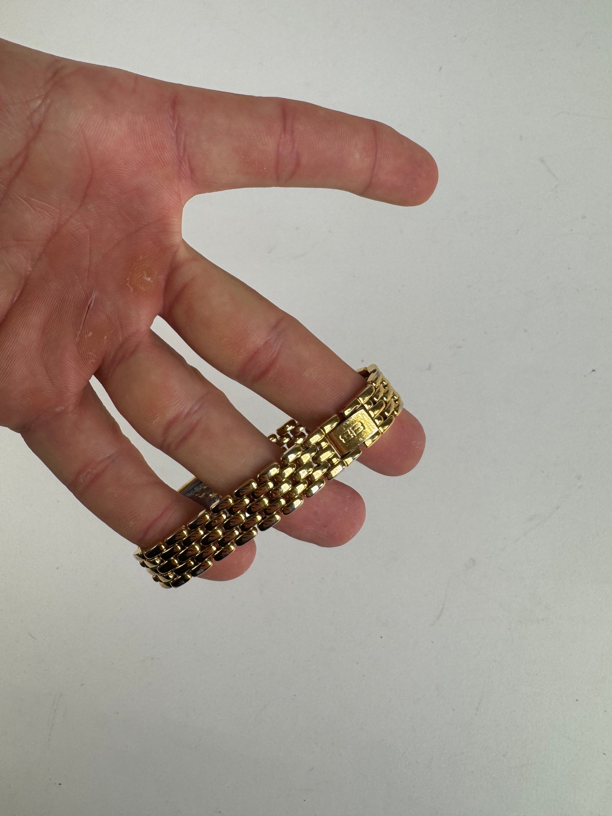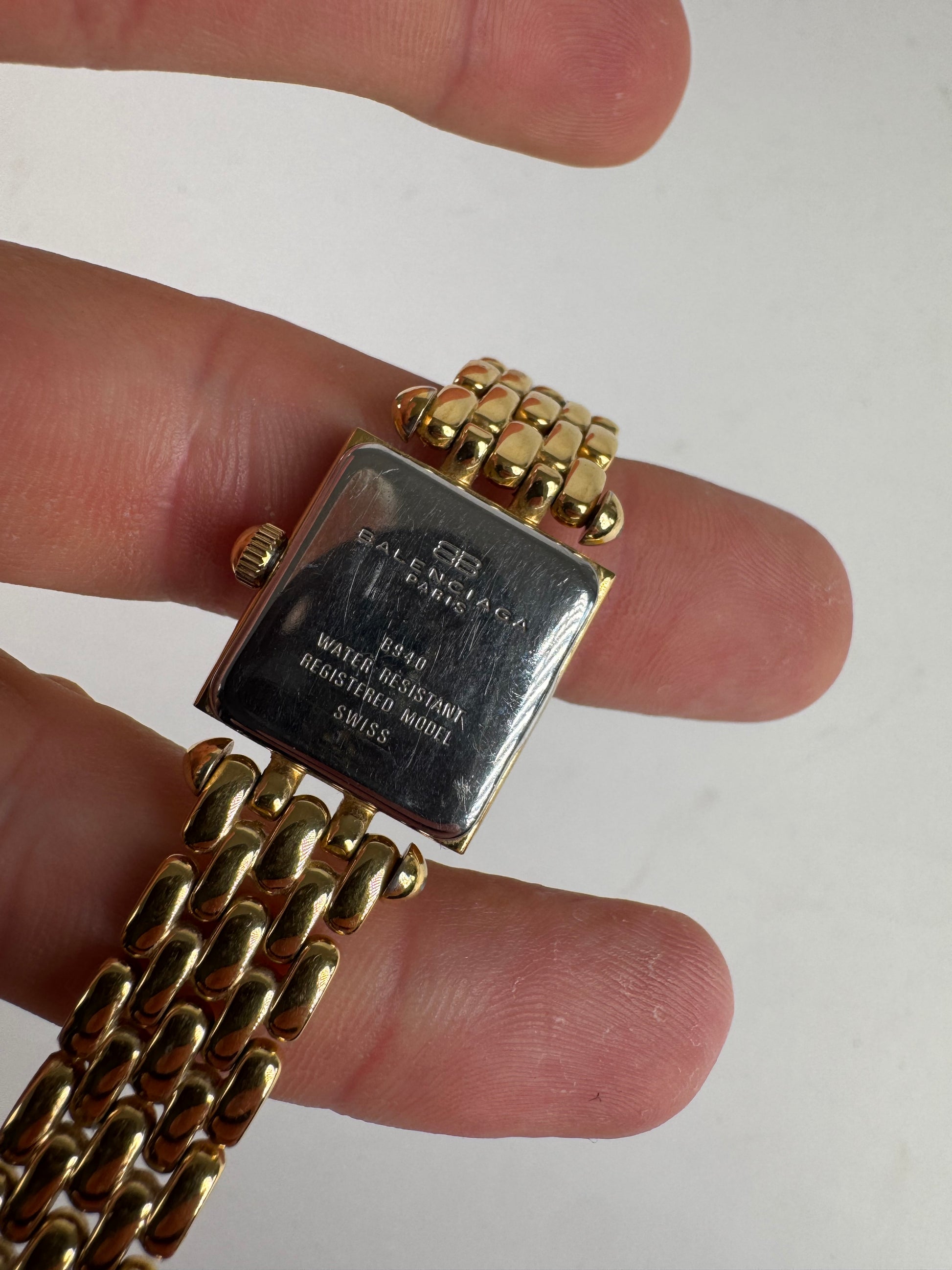 Montre à quartz vintage BALENCIAGA. Cette montre unisexe raffinée est fabriquée en acier doré et arbore un cadran blanc avec des aiguilles dorées assorties. Son bracelet style chaîne est étanche. Elle est animée par un mouvement à quartz avec une pile récemment remplacée.