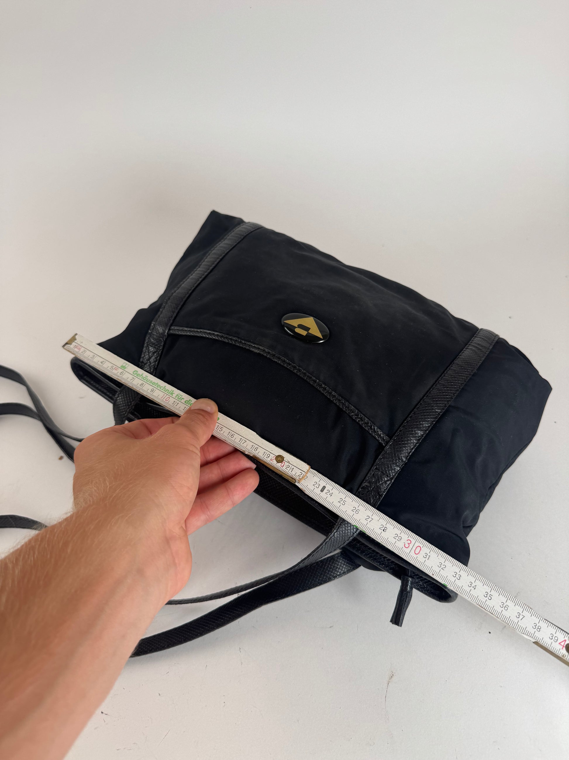 Sac bandoulière vintage BOTTEGA VENETA en cuir et toile. Ce sac à main original est finement confectionné en cuir noir effet peau de serpent associé à de la toile noire. Le devant est orné d'une plaque logo BV noire et jaune en plastique. Doté de longues anses, il se porte facilement à l'épaule et se ferme par une fermeture éclair sur le dessus.