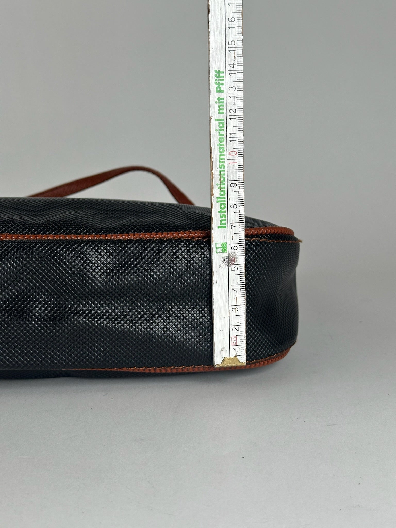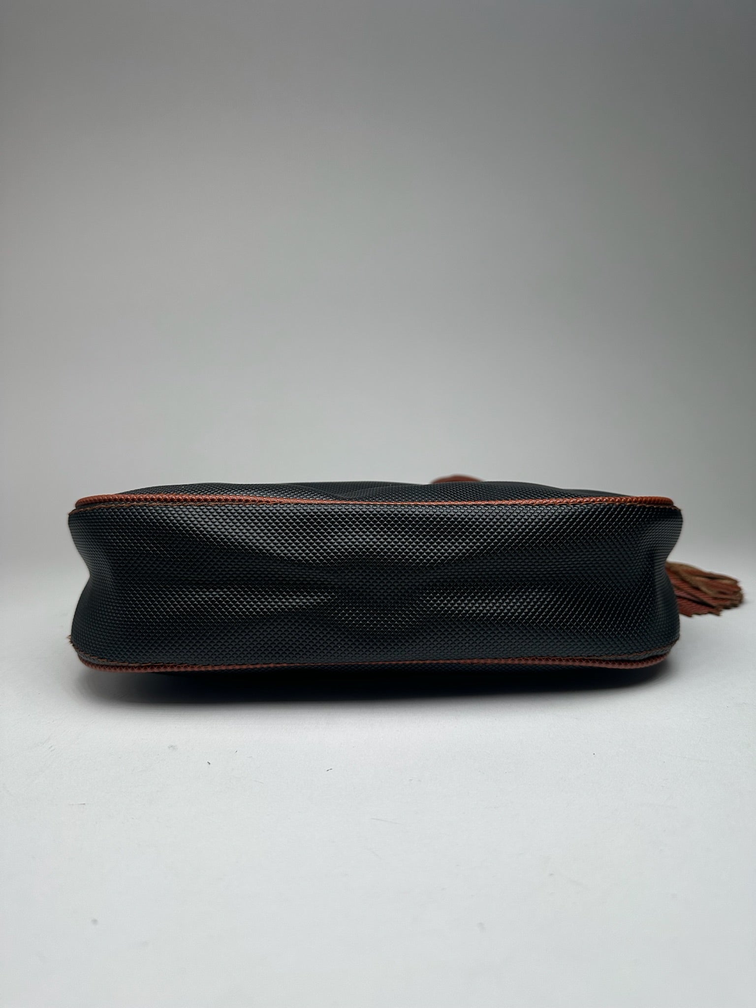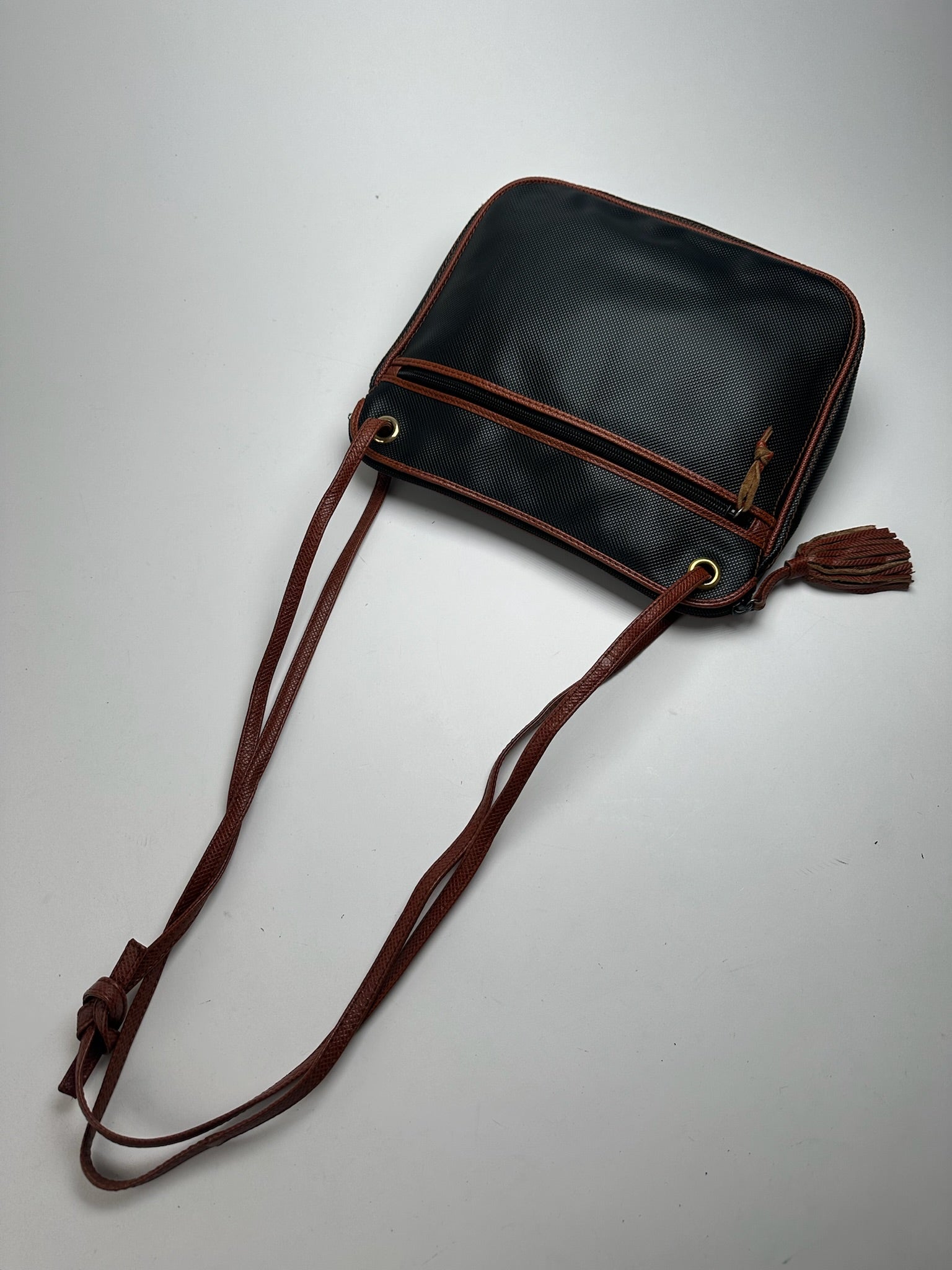 Ce sac à main raffiné est finement confectionné en cuir marron et noir, avec des finitions en acier doré. Il est doté de deux longues anses qui peuvent être portées en bandoulière ou en bandoulière. Un pompon en cuir tressé fait office de tirette de fermeture éclair distinctive.