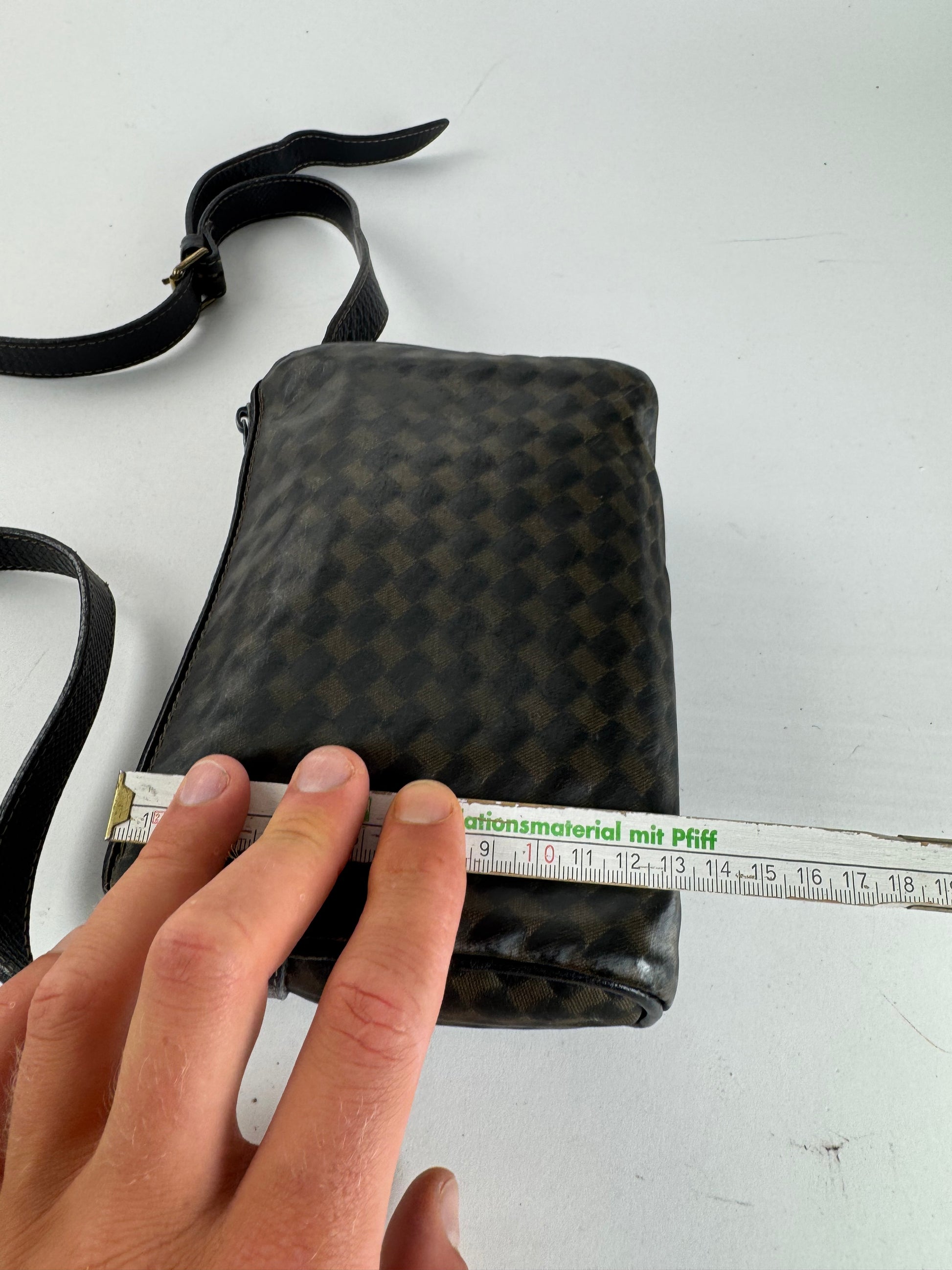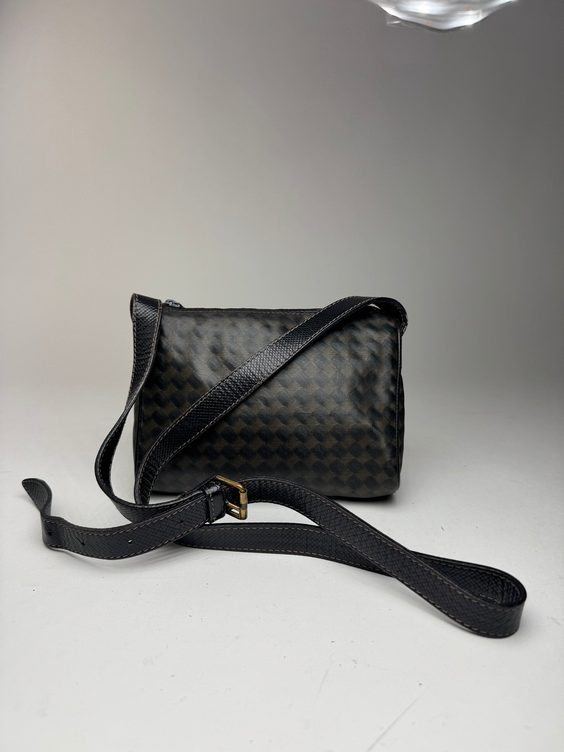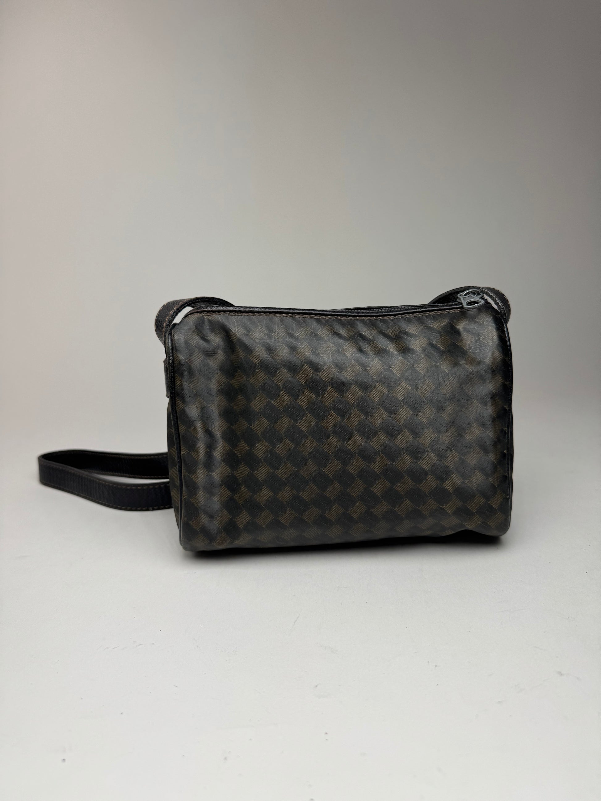 Sac vintage BOTTEGA VENETA en cuir à damier noir et marron. Ce sac vintage distinctif est confectionné en cuir à damier noir et marron et doté d'une fermeture zippée sur le dessus. Il est doté d'une bandoulière réglable et d'accessoires en acier noir à l'extérieur, avec des détails en acier doré à l'intérieur. L'intérieur est doublé de cuir noir. Fabriqué en Italie, ce modèle compact et structuré reflète l'héritage de Bottega Veneta, synonyme de luxe discret et de maroquinerie maroquinière magistrale.