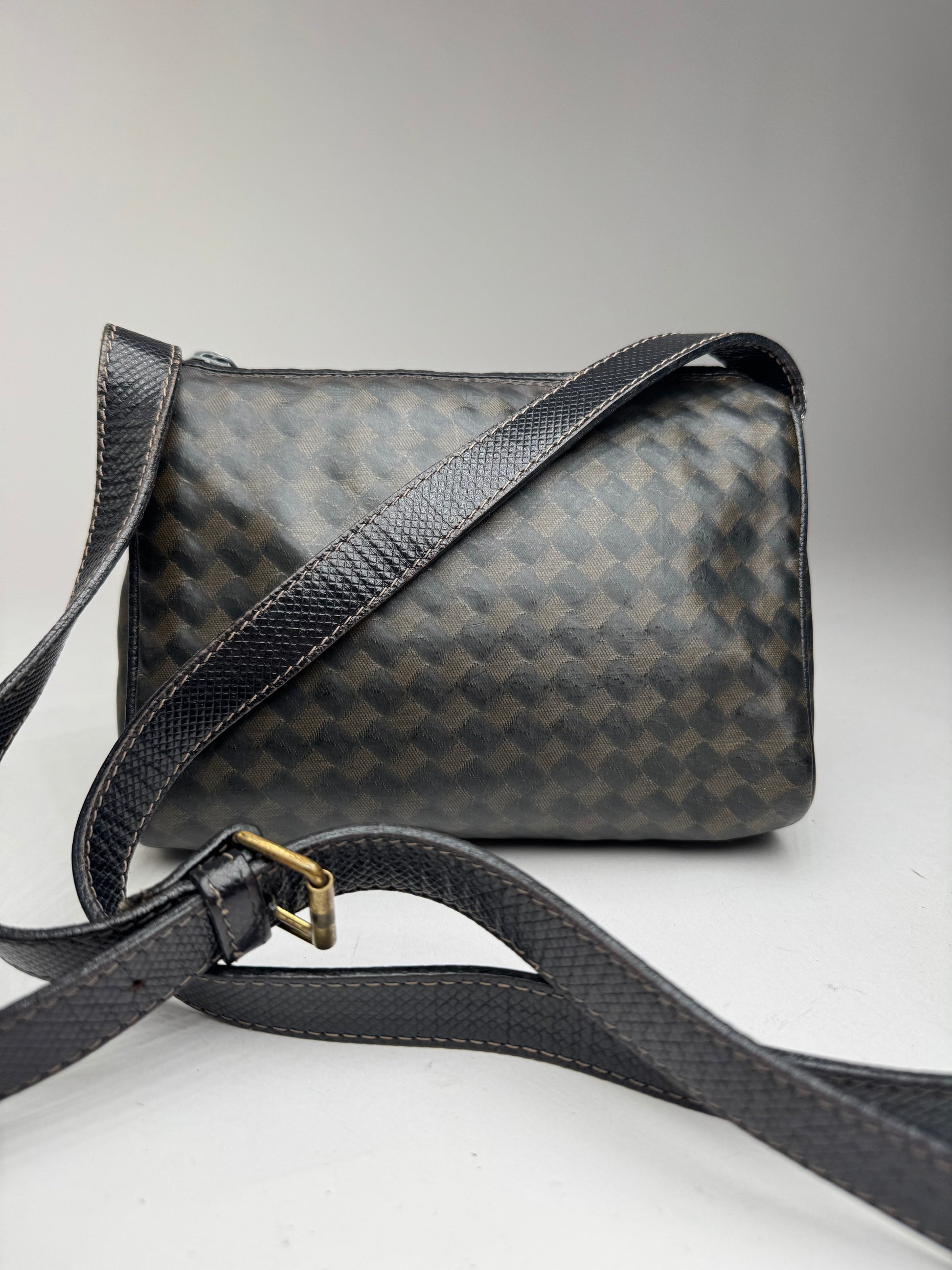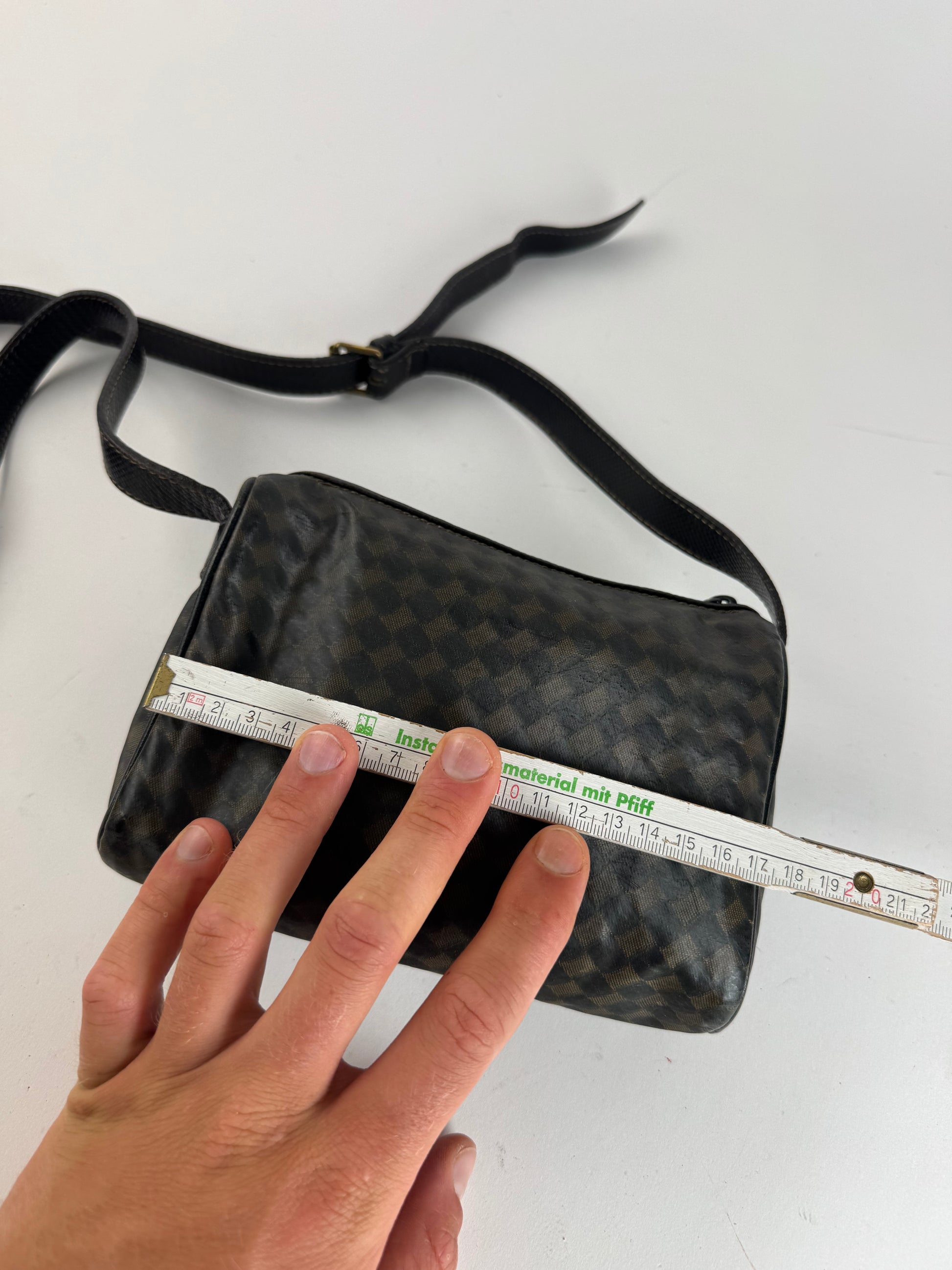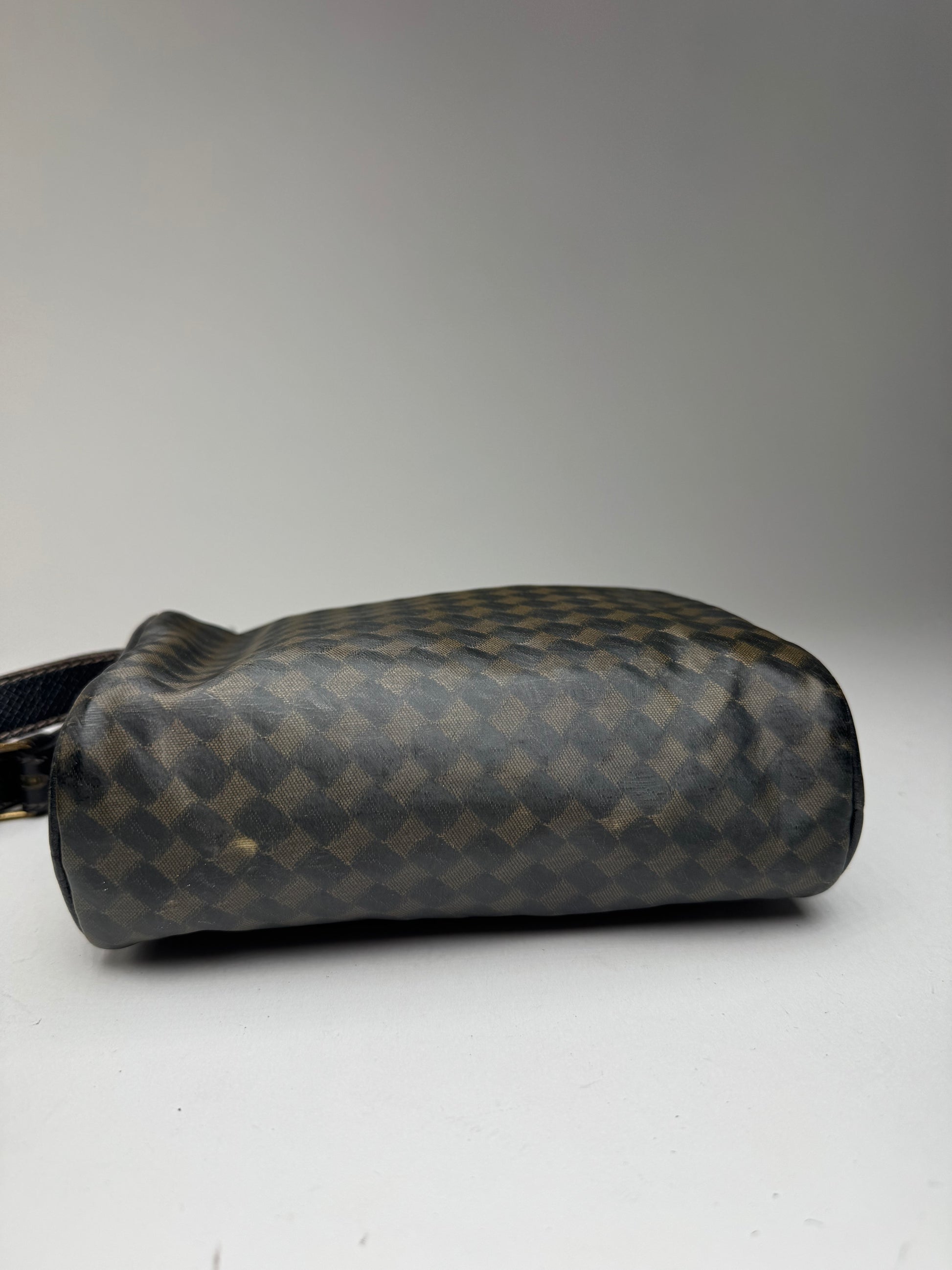 Sac vintage BOTTEGA VENETA en cuir à damier noir et marron. Ce sac vintage distinctif est confectionné en cuir à damier noir et marron et doté d'une fermeture zippée sur le dessus. Il est doté d'une bandoulière réglable et d'accessoires en acier noir à l'extérieur, avec des détails en acier doré à l'intérieur. L'intérieur est doublé de cuir noir. Fabriqué en Italie, ce modèle compact et structuré reflète l'héritage de Bottega Veneta, synonyme de luxe discret et de maroquinerie maroquinière magistrale.