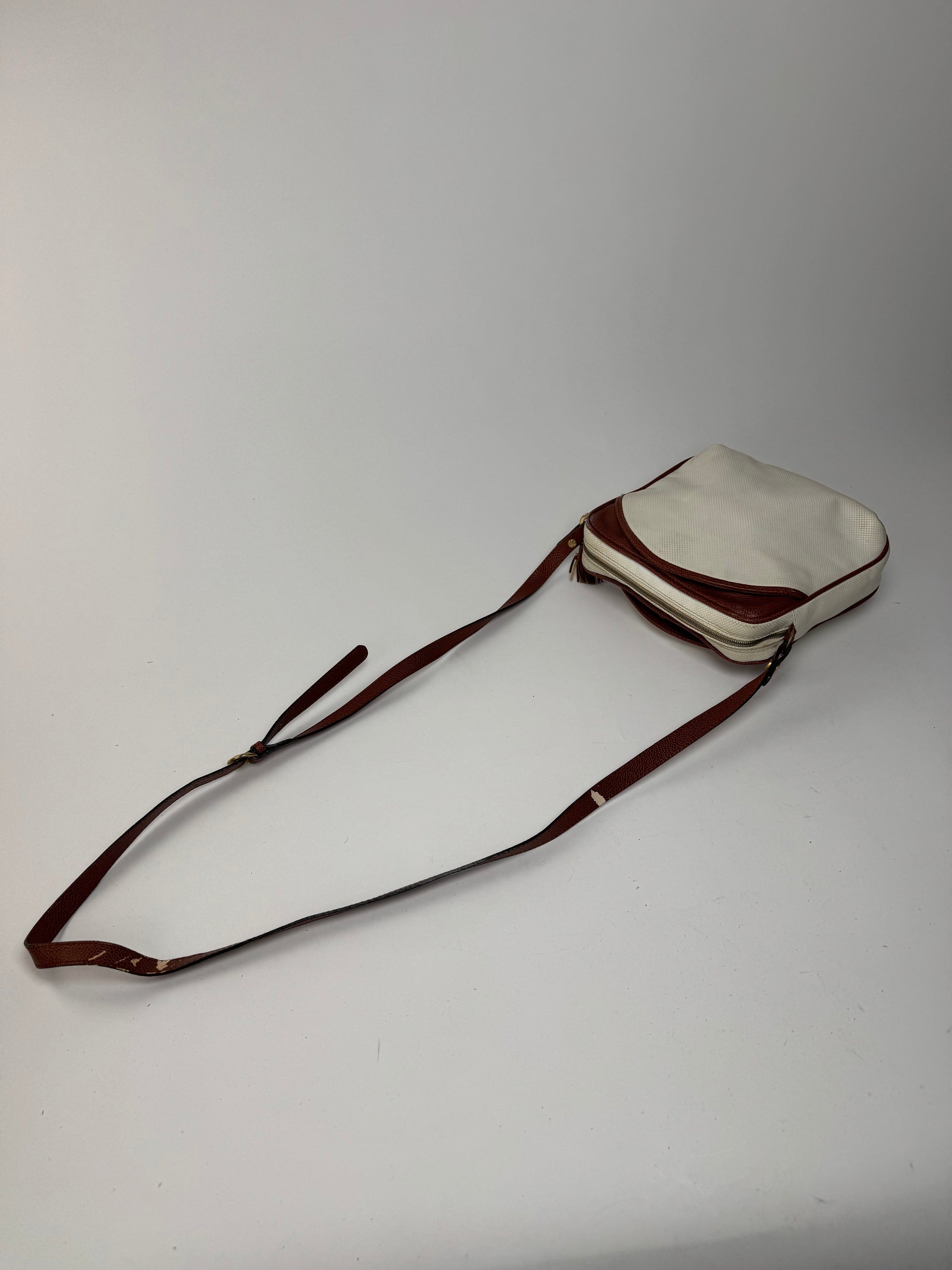 Ce sac à main chic est finement confectionné en cuir blanc et marron fauve. Il comporte deux compartiments à fermeture magnétique et un grand compartiment principal zippé. La tirette est ornée d'une languette en cuir marron. Sa bandoulière réglable permet un porté polyvalent et ses finitions sont en acier doré.