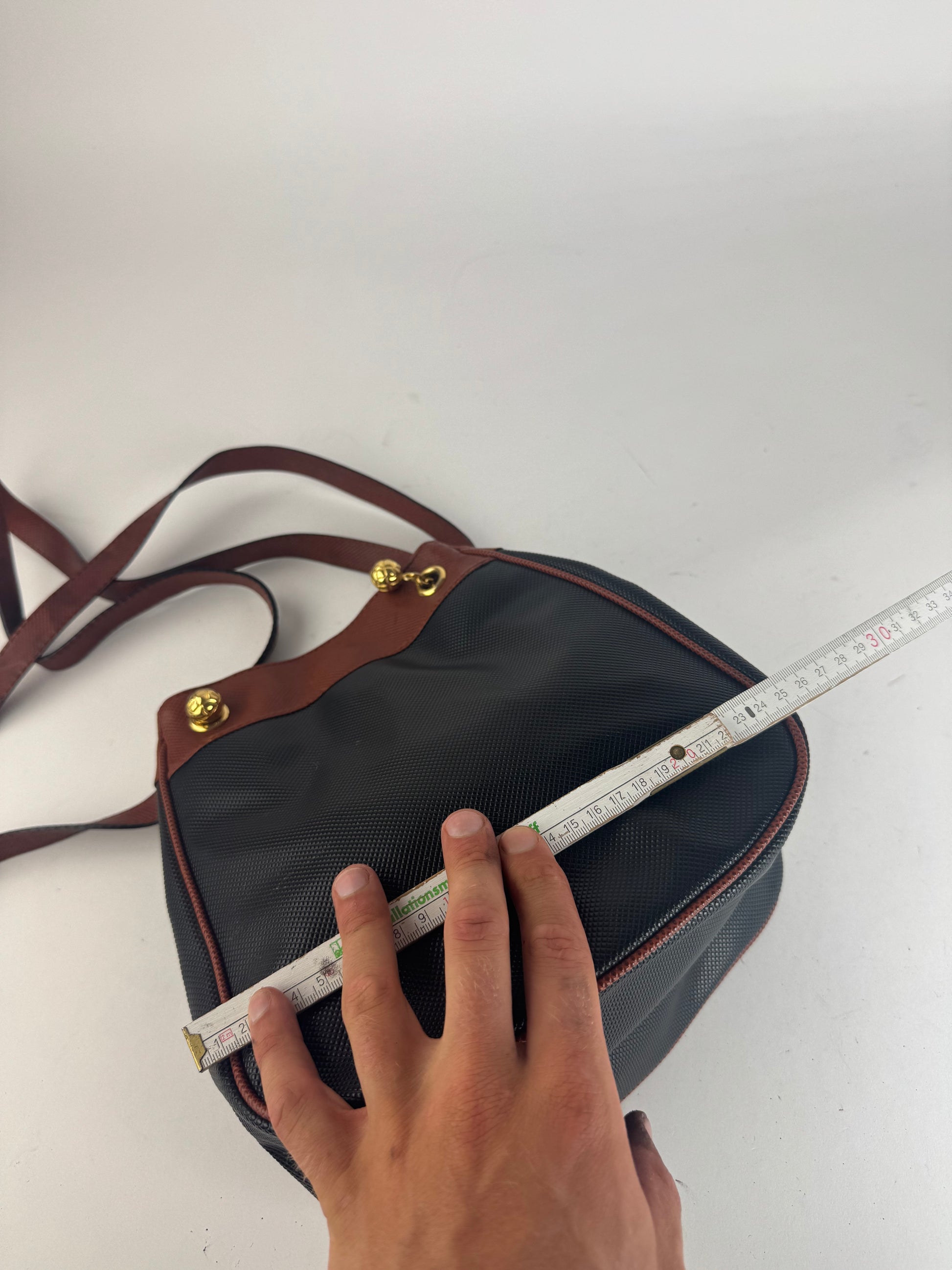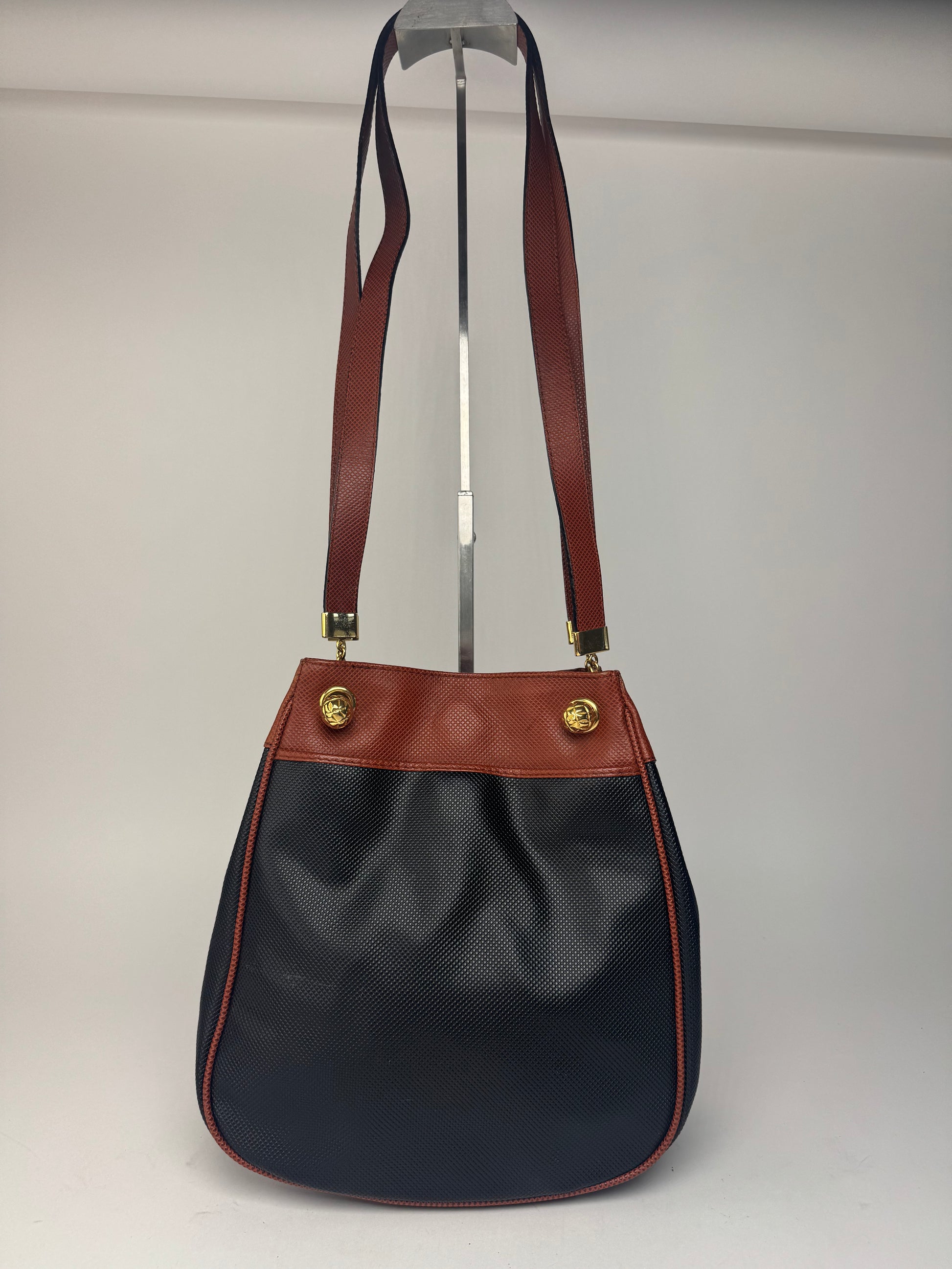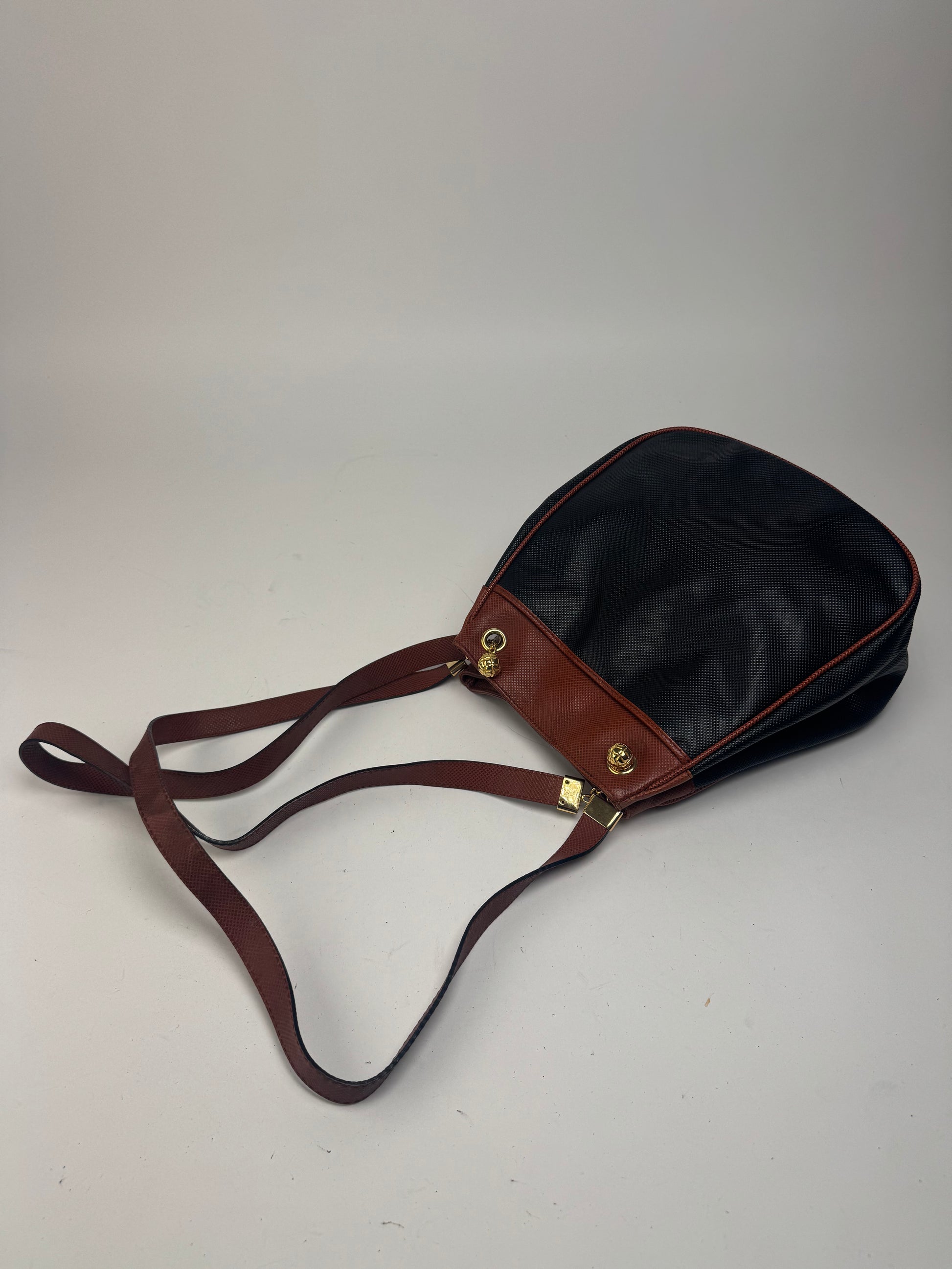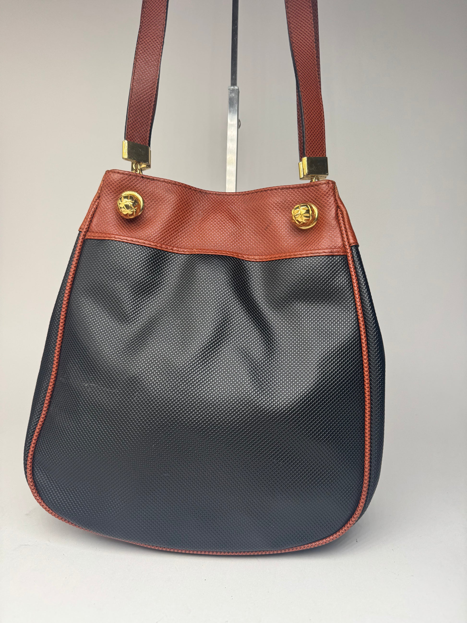 Sac seau vintage BOTTEGA VENETA. Cet élégant sac seau vintage est confectionné en cuir marron et noir avec des finitions en acier doré. Ses deux anses sont suffisamment longues pour un porté épaule confortable. Probablement datant des années 1980, ce sac est doté d'une fermeture magnétique et d'une forme seau spacieuse. L'intérieur est doublé de toile enduite noire, qui présente un fort pelage et nécessiterait un brossage ou un remplacement.