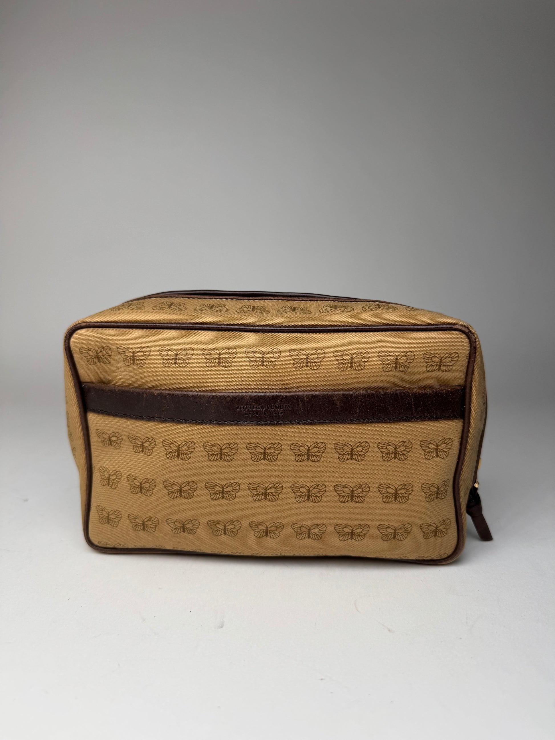 BOTTEGA VENETA Pochette / Sac à cosmétiques vintage en toile moutarde et cuir marron.