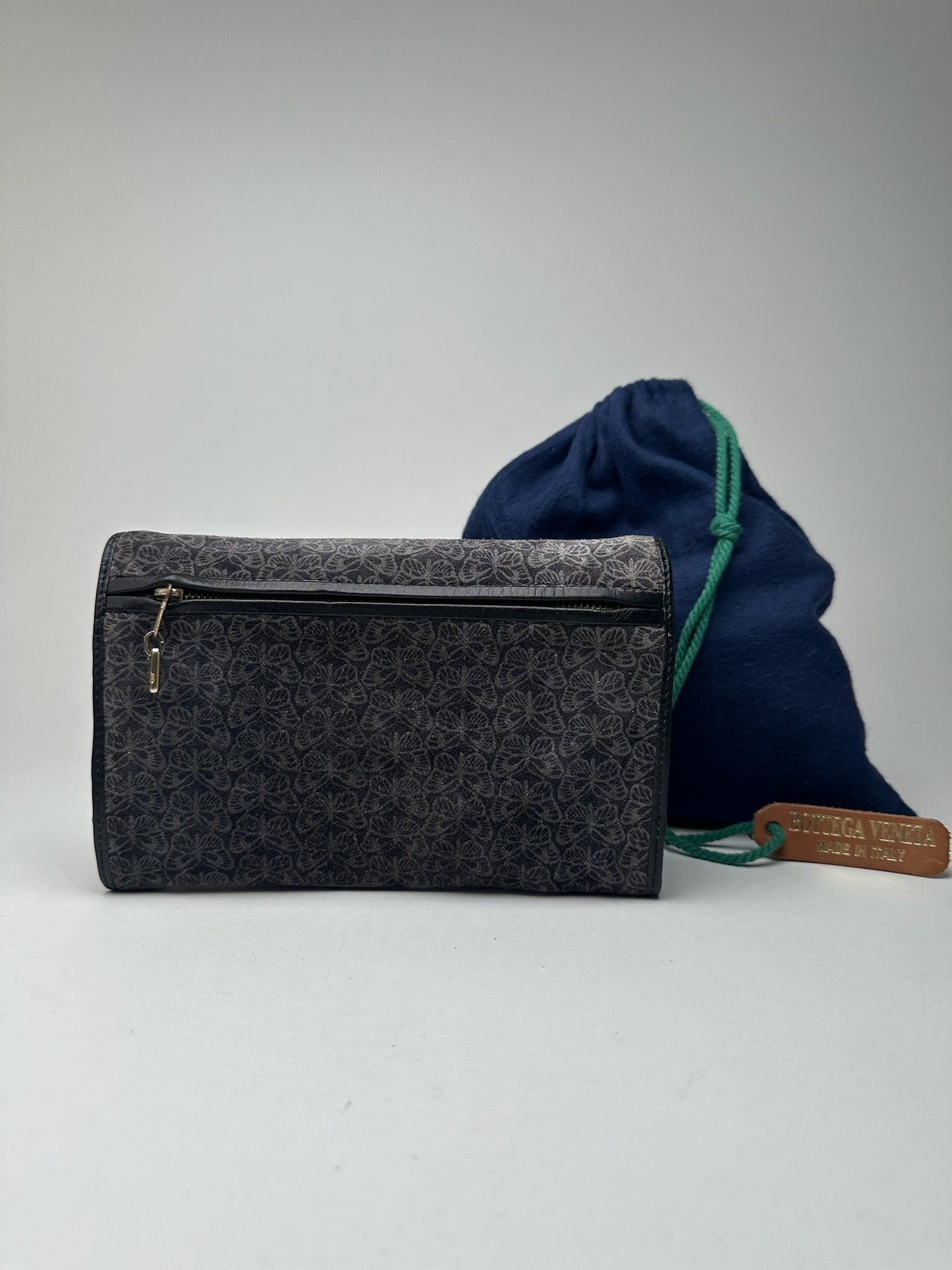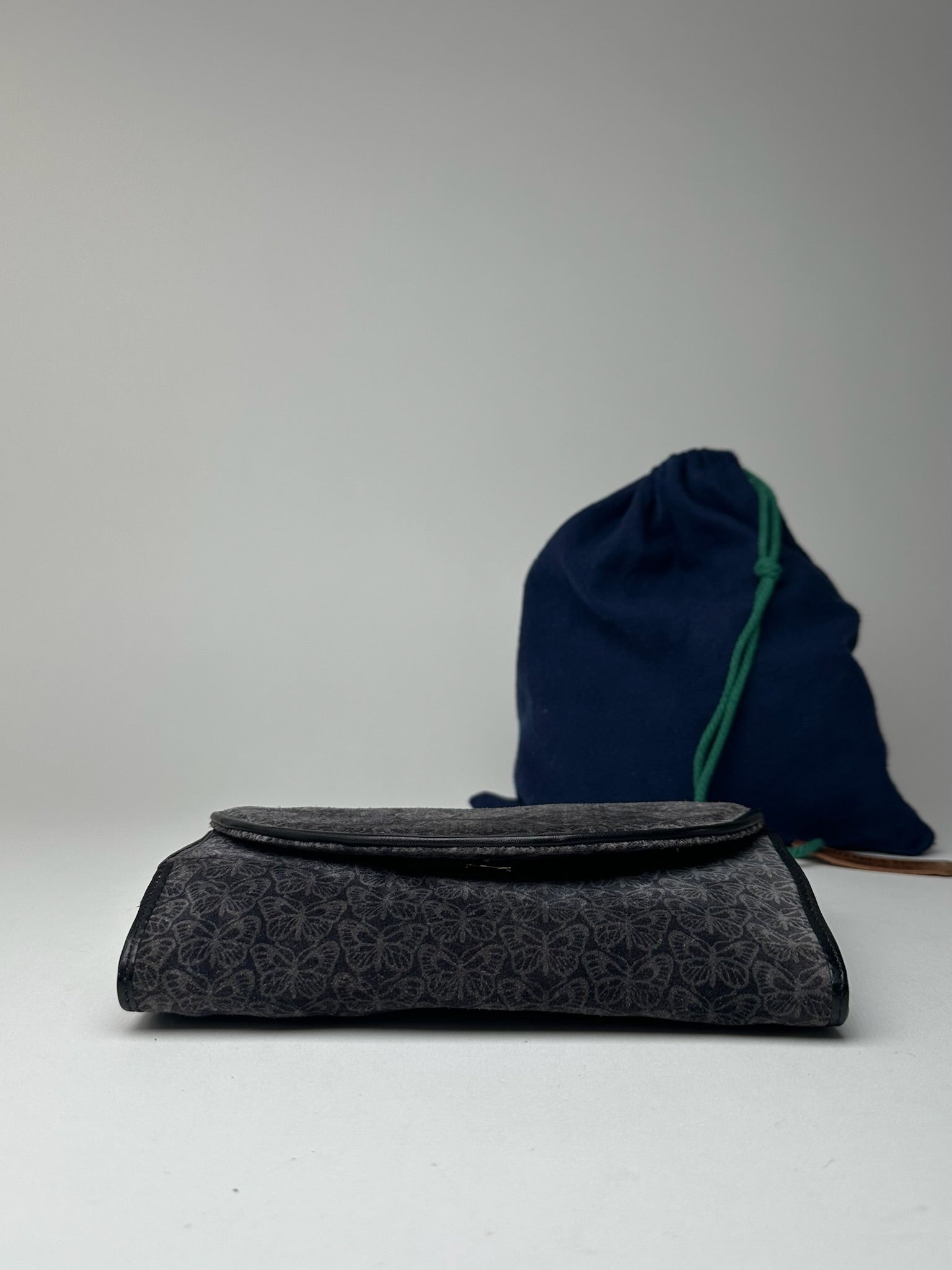 Pochette BOTTEGA VENETA Vintage Monogram Papillon. Cette pochette chic est confectionnée en laine bleu marine et grise, avec un motif monogramme papillon. Elle est dotée d'une poche arrière zippée et d'une fermeture à bouton-pression, toutes deux en acier doré. L'intérieur est doublé de toile bleu marine avec des finitions en cuir noir.