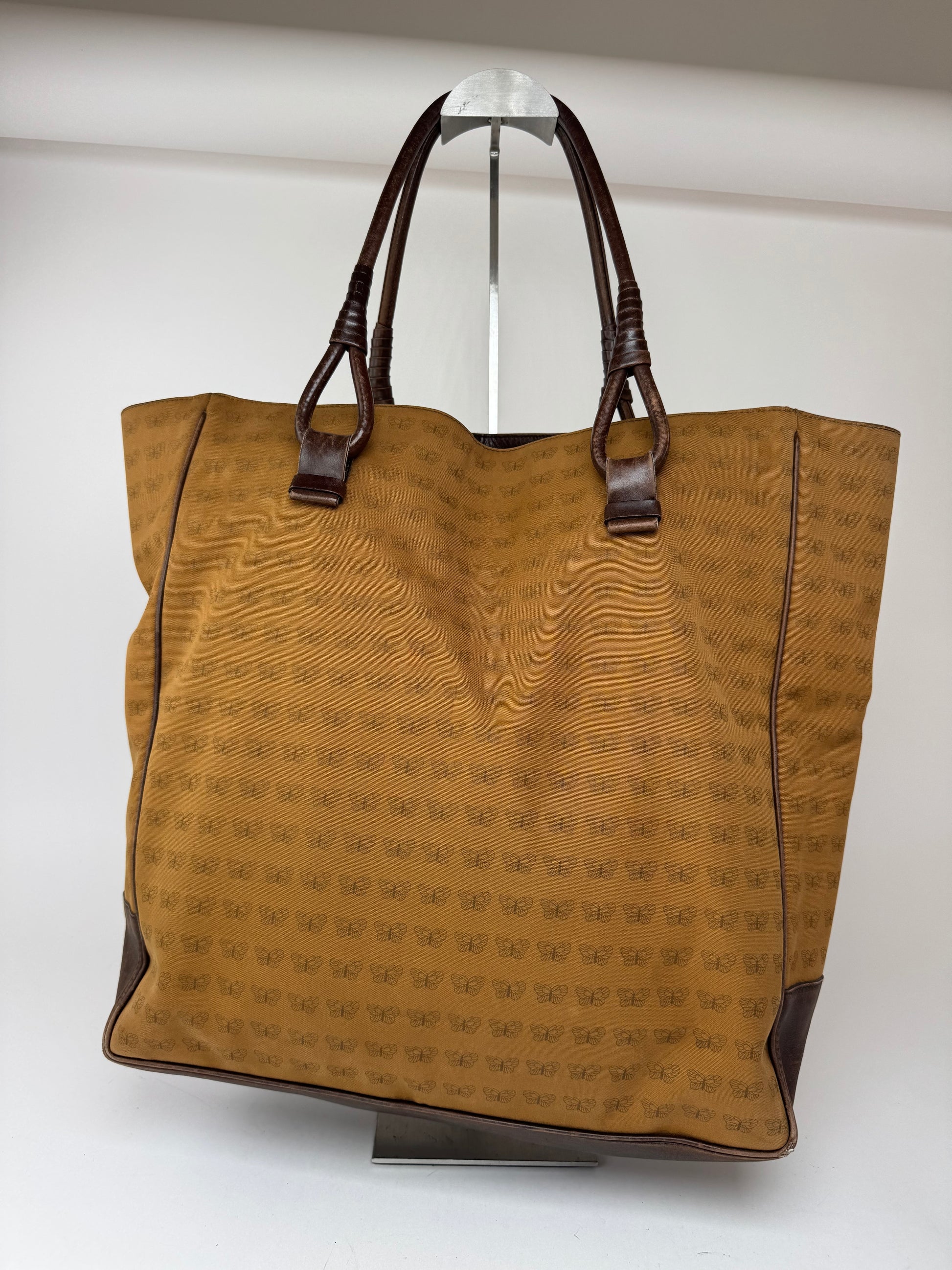 Sac cabas vintage BOTTEGA VENETA. Ce spacieux cabas vintage est confectionné en cuir embossé couleur camel, orné d'un monogramme papillon marron et de poignées en cuir marron. L'intérieur est doublé en toile marron ornée d'un monogramme papillon noir et comprend une petite poche zippée. Fabriqué en Italie, il est orné de finitions en acier doré.