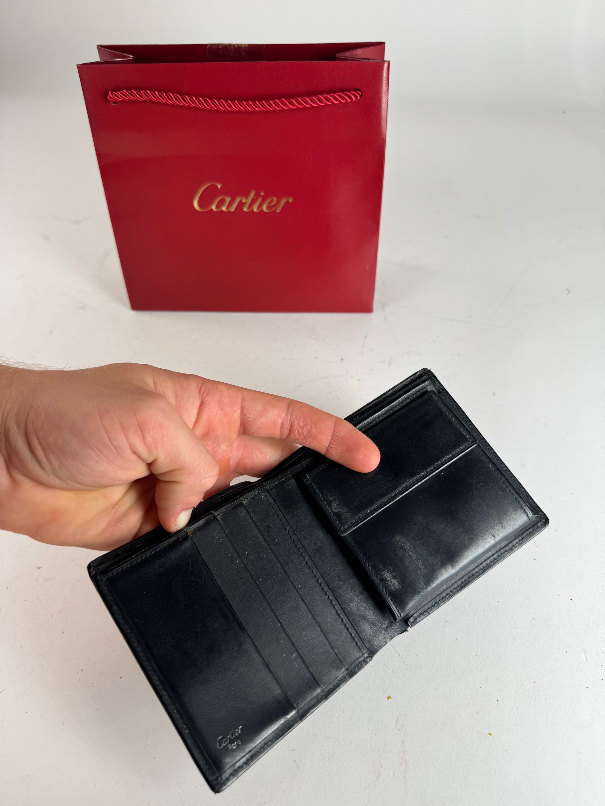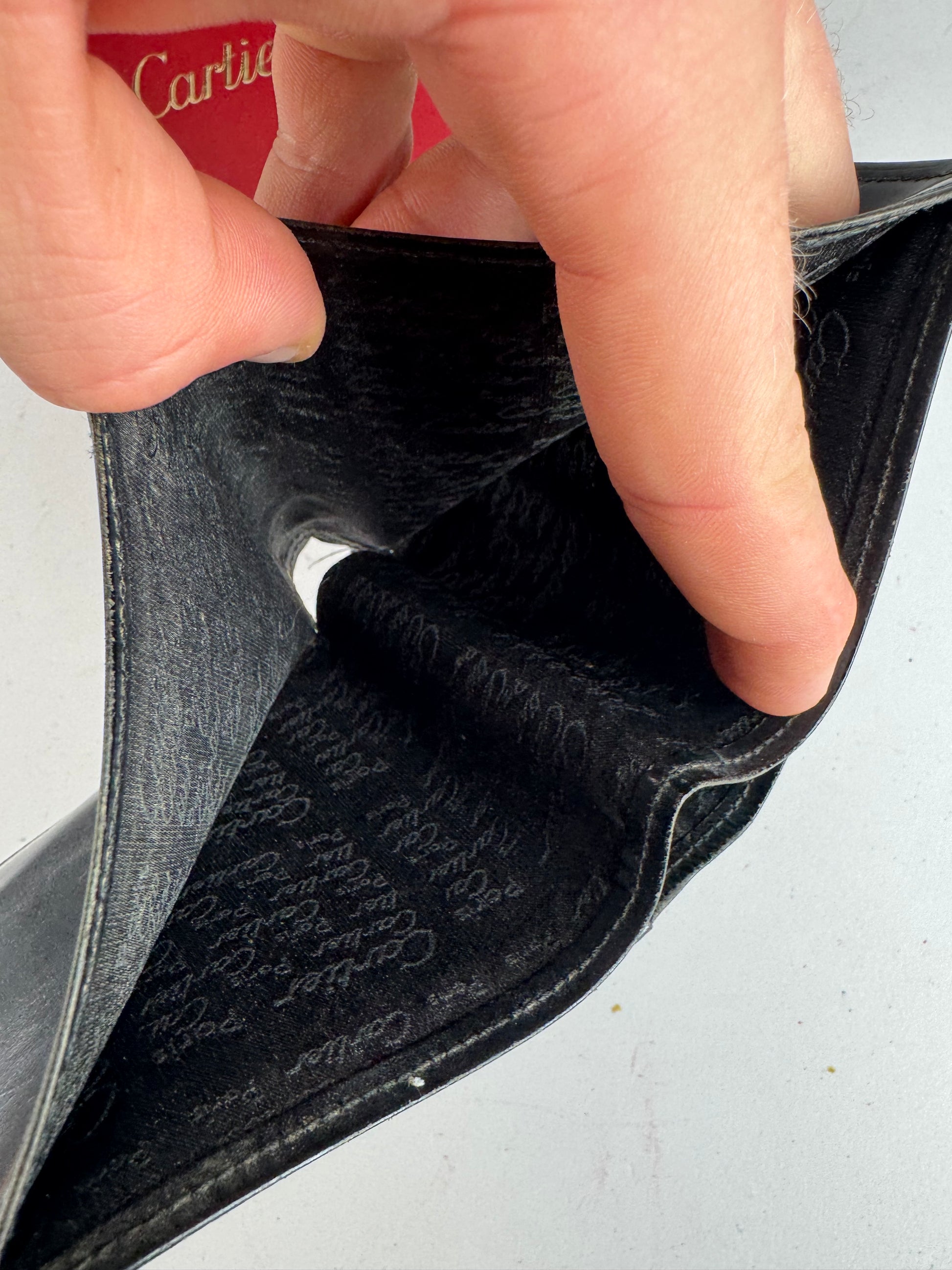 This vintage Cartier wallet is crafted in glossy black patent leather and features a subtle silver-tone steel Cartier logo at the lower right front corner. The foldable design opens to a black leather interior, with a black canvas lining printed with Cartier script. A refined and understated luxury piece. Comes with a Cartier card.