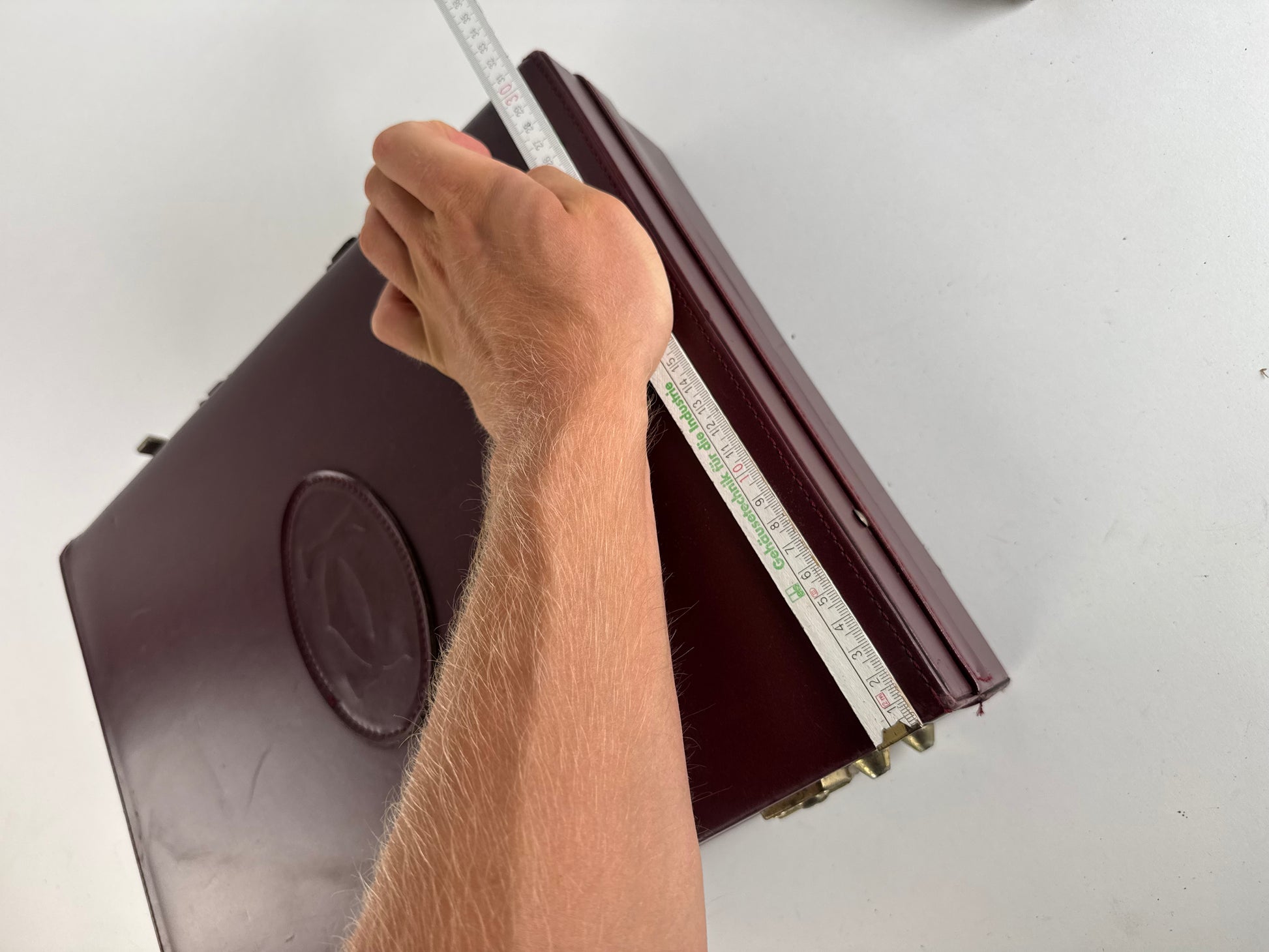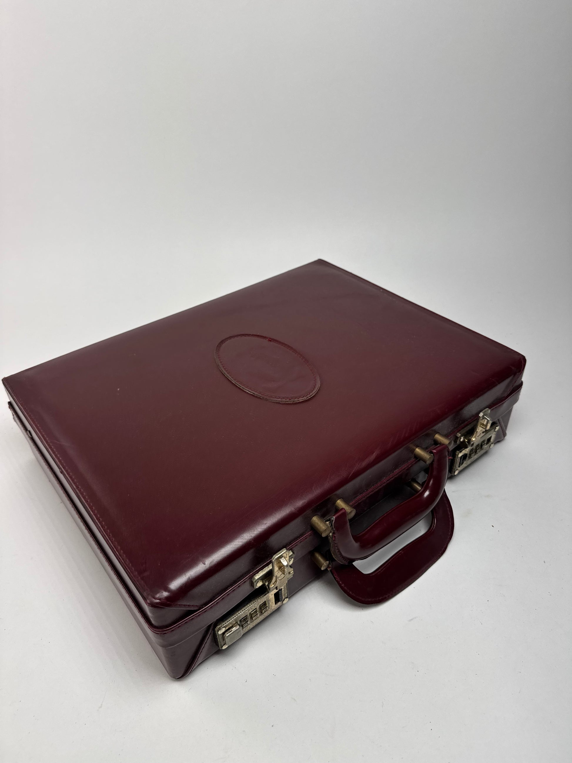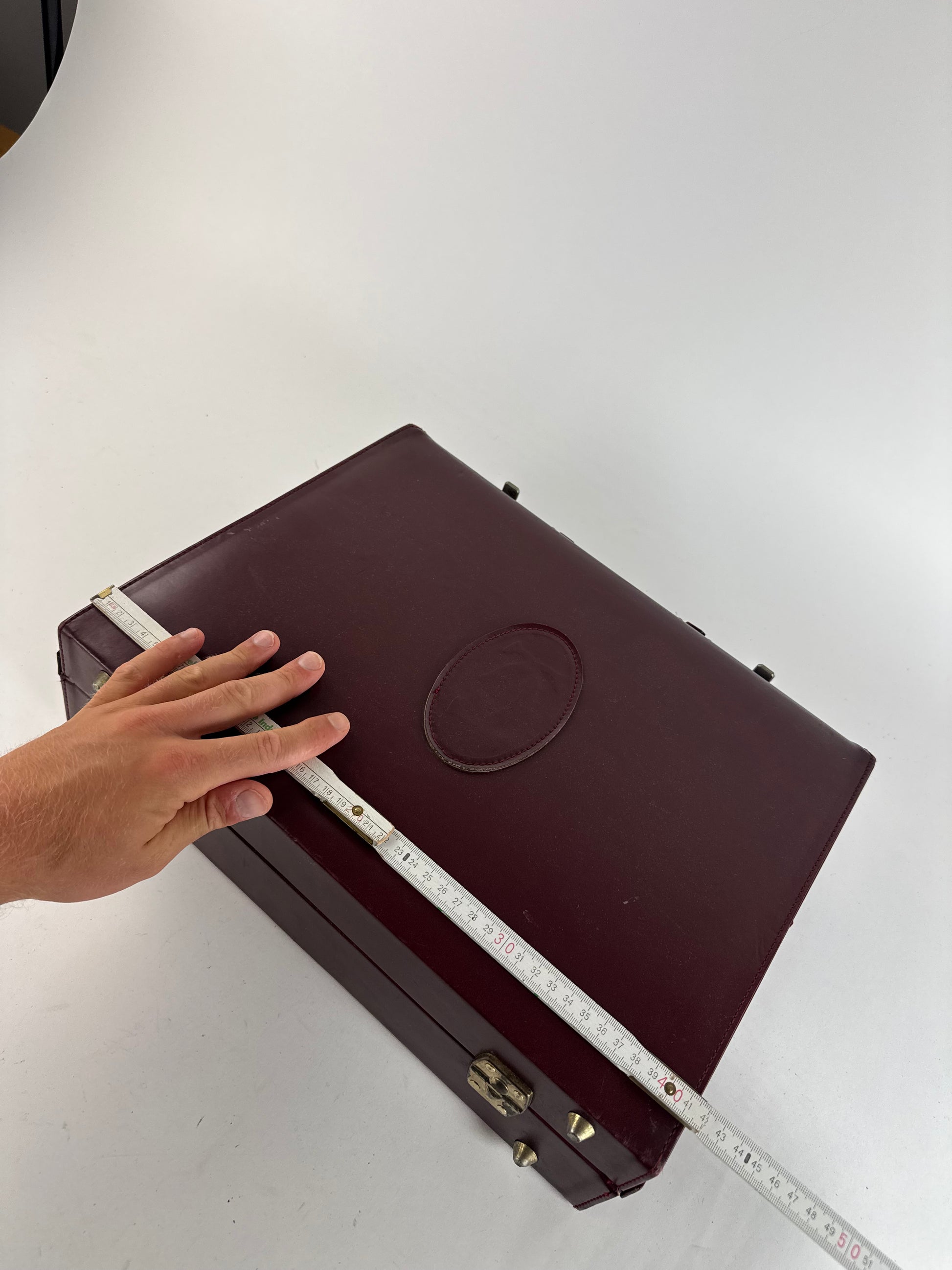 Coffret de voyage vintage CARTIER en cuir bordeaux. Cet étui vintage de collection est confectionné en cuir bordeaux et doté de deux poignées supérieures en cuir assorti, d'accessoires en acier doré et d'un logo Cartier embossé sur le devant. L'intérieur est doublé de toile orange et de cuir bordeaux. Si son design reste saisissant, les poignées et les fermoirs sont inutilisables et nécessiteraient une réparation ou un remplacement. L'étui peut également servir d'objet décoratif.