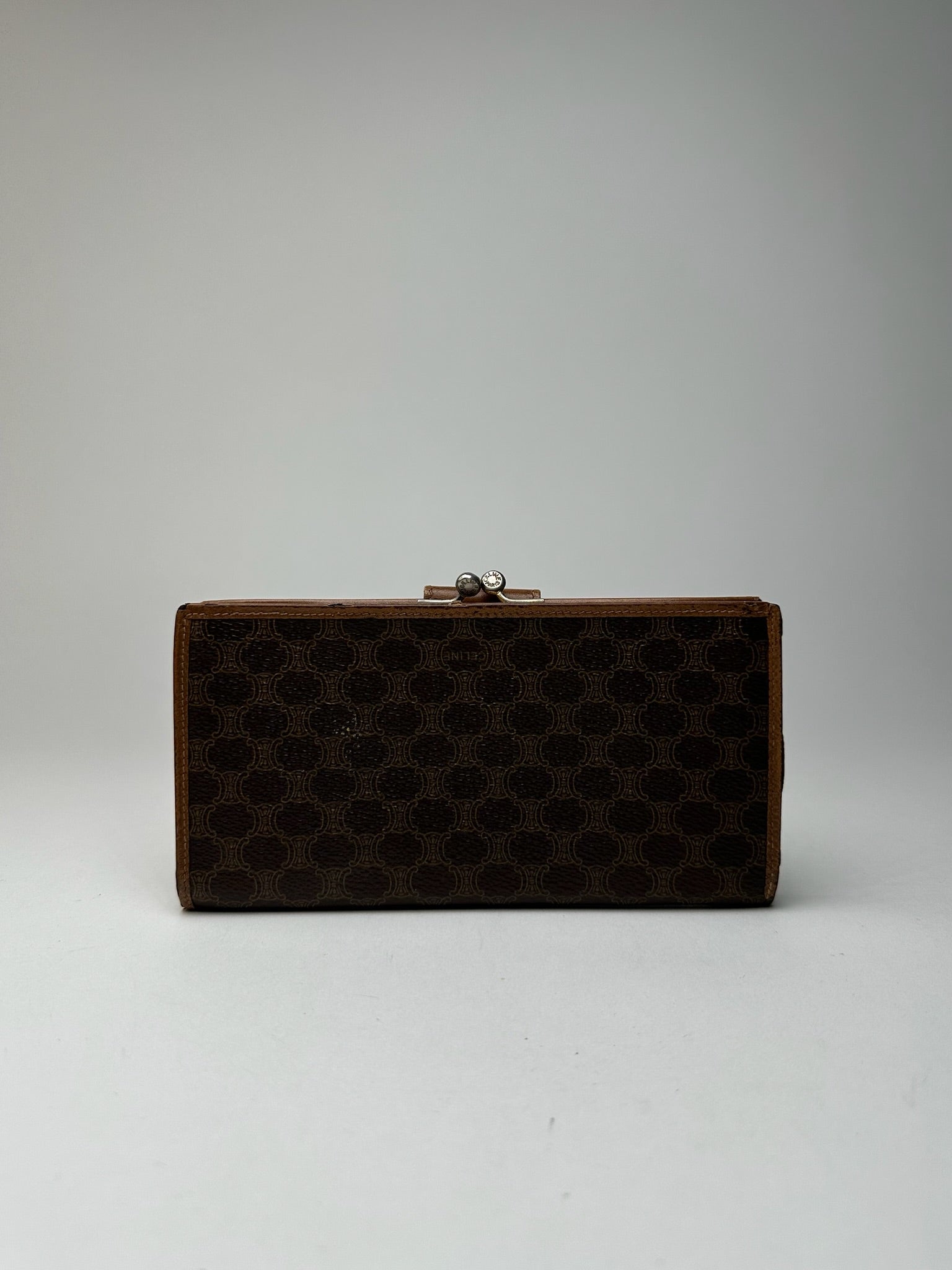 Portefeuille CELINE PARIS en cuir monogrammé vintage. Ce portefeuille chic est finement confectionné en cuir monogrammé CELINE marron foncé avec des finitions en cuir beige. Il est doté d'accessoires en acier inoxydable argenté et d'une plaque logo CELINE sur le devant. Il se ferme par un bouton-pression d'un côté et par un rabat de l'autre. L'intérieur est doublé de cuir marron clair.