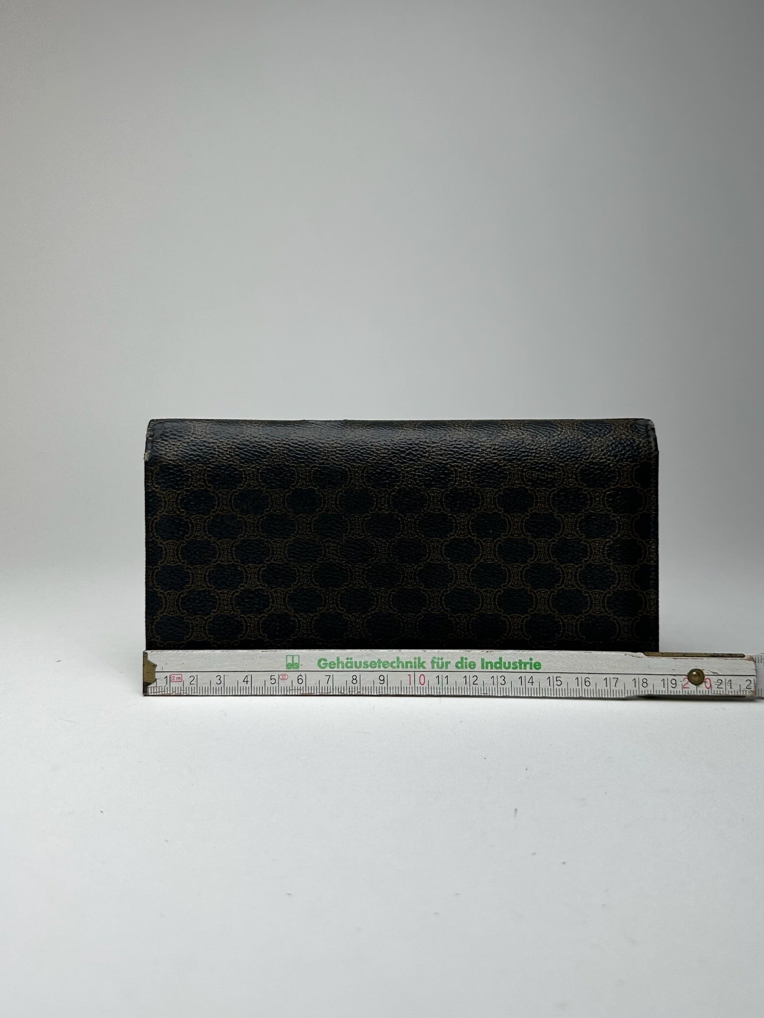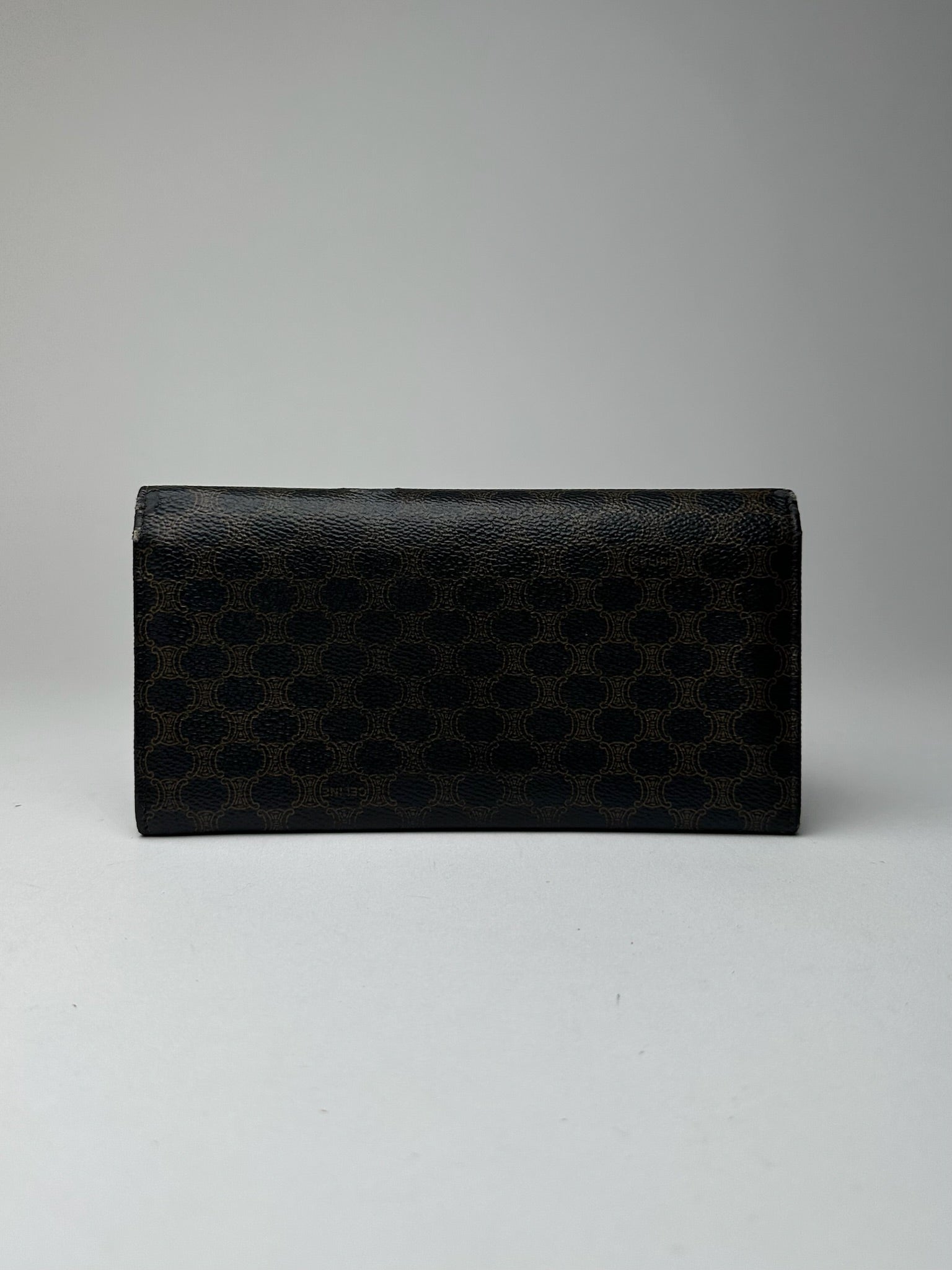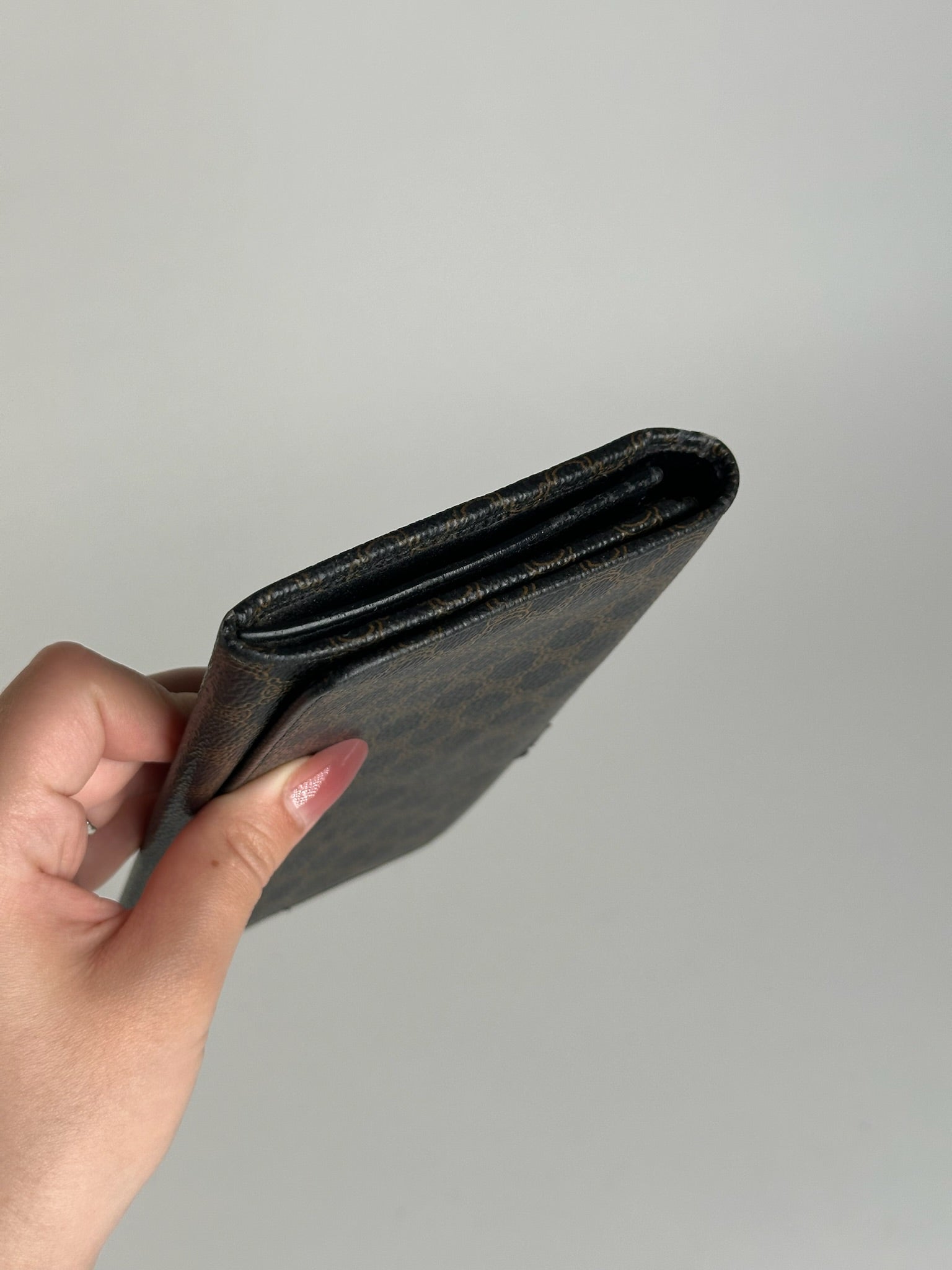 Portefeuille CELINE PARIS Vintage Triomphe Monogram. Ce portefeuille chic est finement confectionné en cuir monogrammé CELINE marron foncé. Il est doté d'accessoires en acier inoxydable argenté et d'une plaque logo CELINE sur le devant. Il se ferme par un bouton-pression et s'ouvre sur un intérieur en cuir noir.