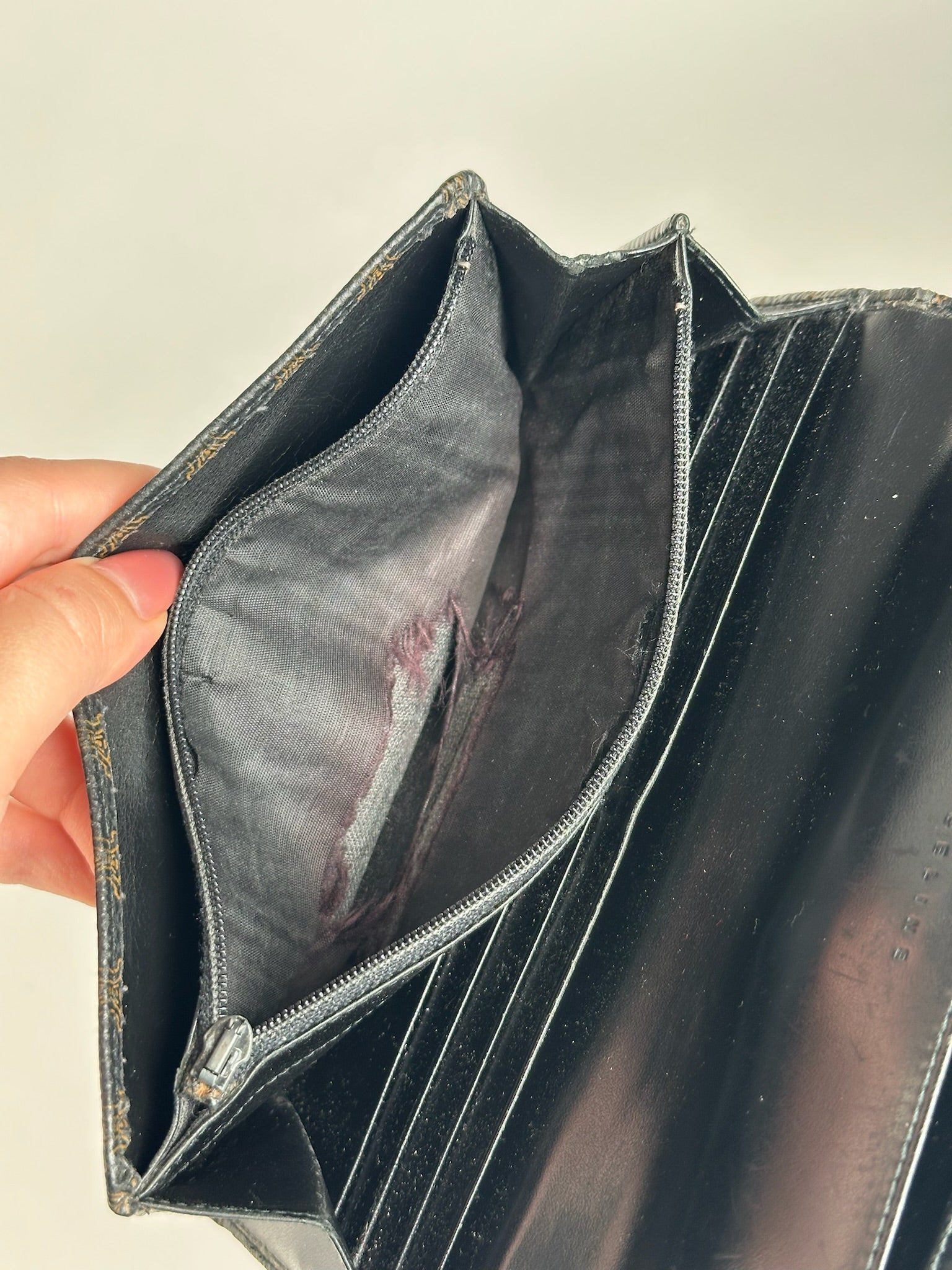 État : L'extérieur en cuir est en bon état, avec un léger usure. L'intérieur présente des traces d'usure, notamment une tirette de fermeture éclair manquante et un compartiment à monnaie endommagé. La quincaillerie est en acier inoxydable argenté avec des traces d'usure superficielles.