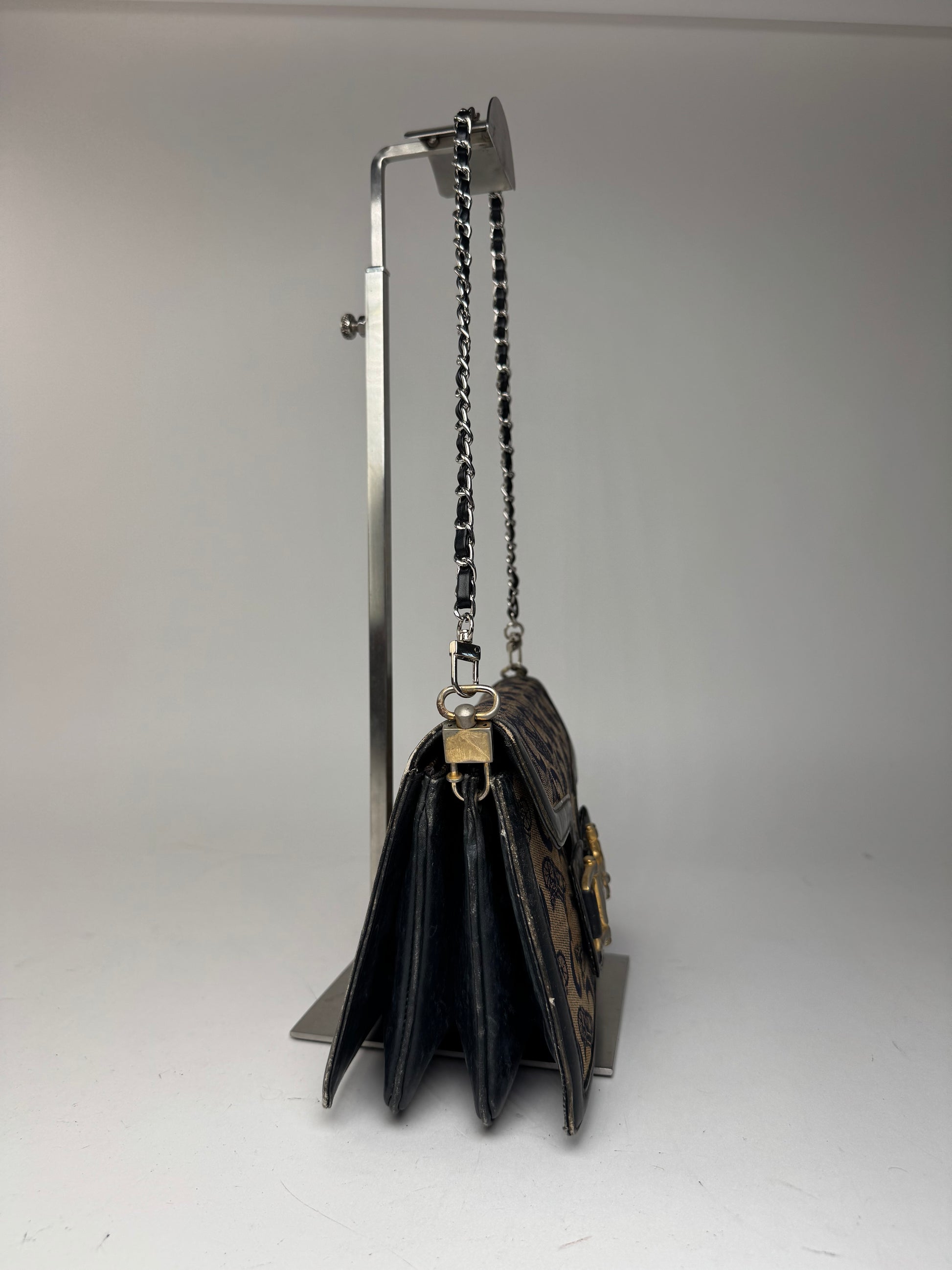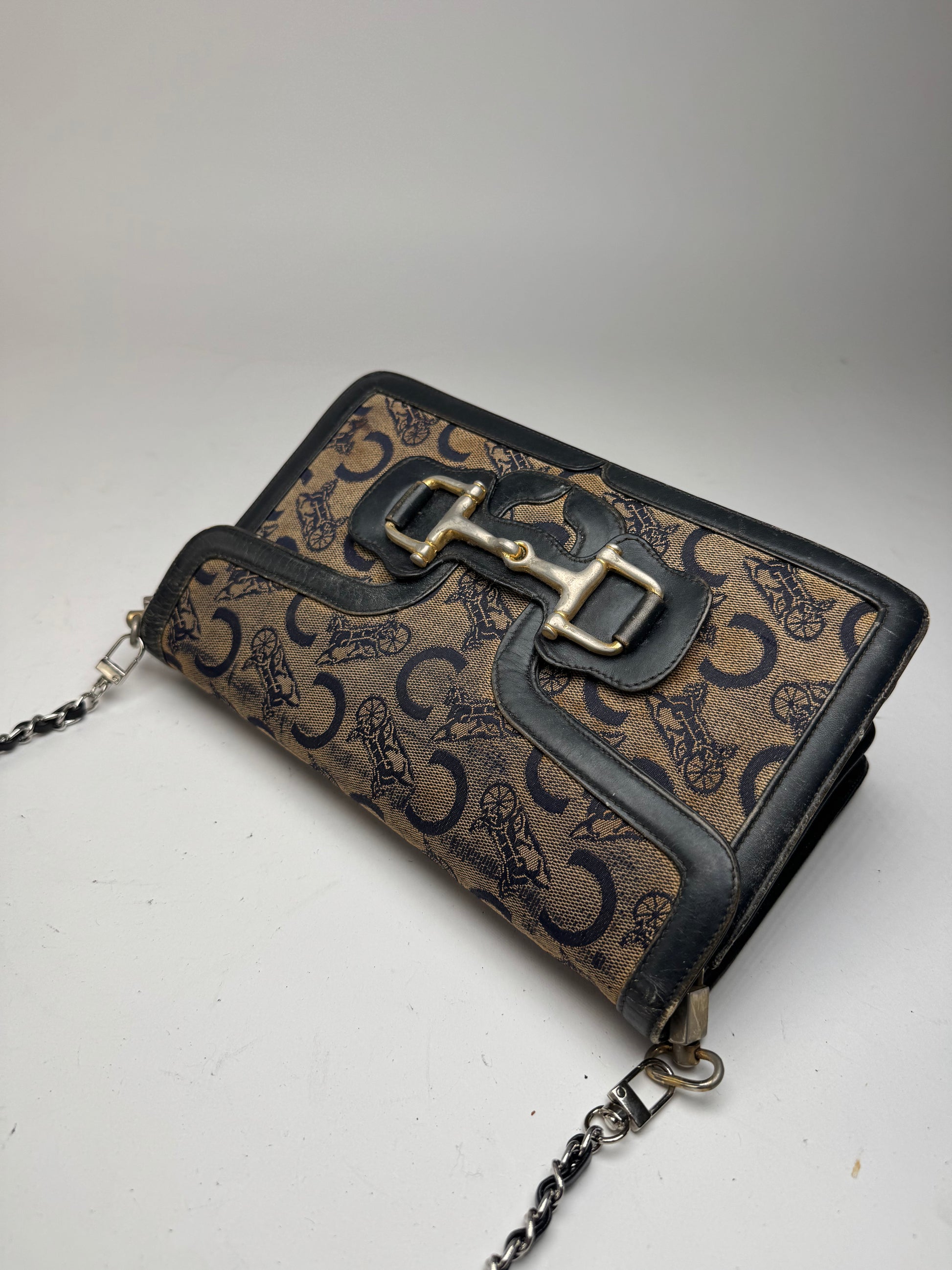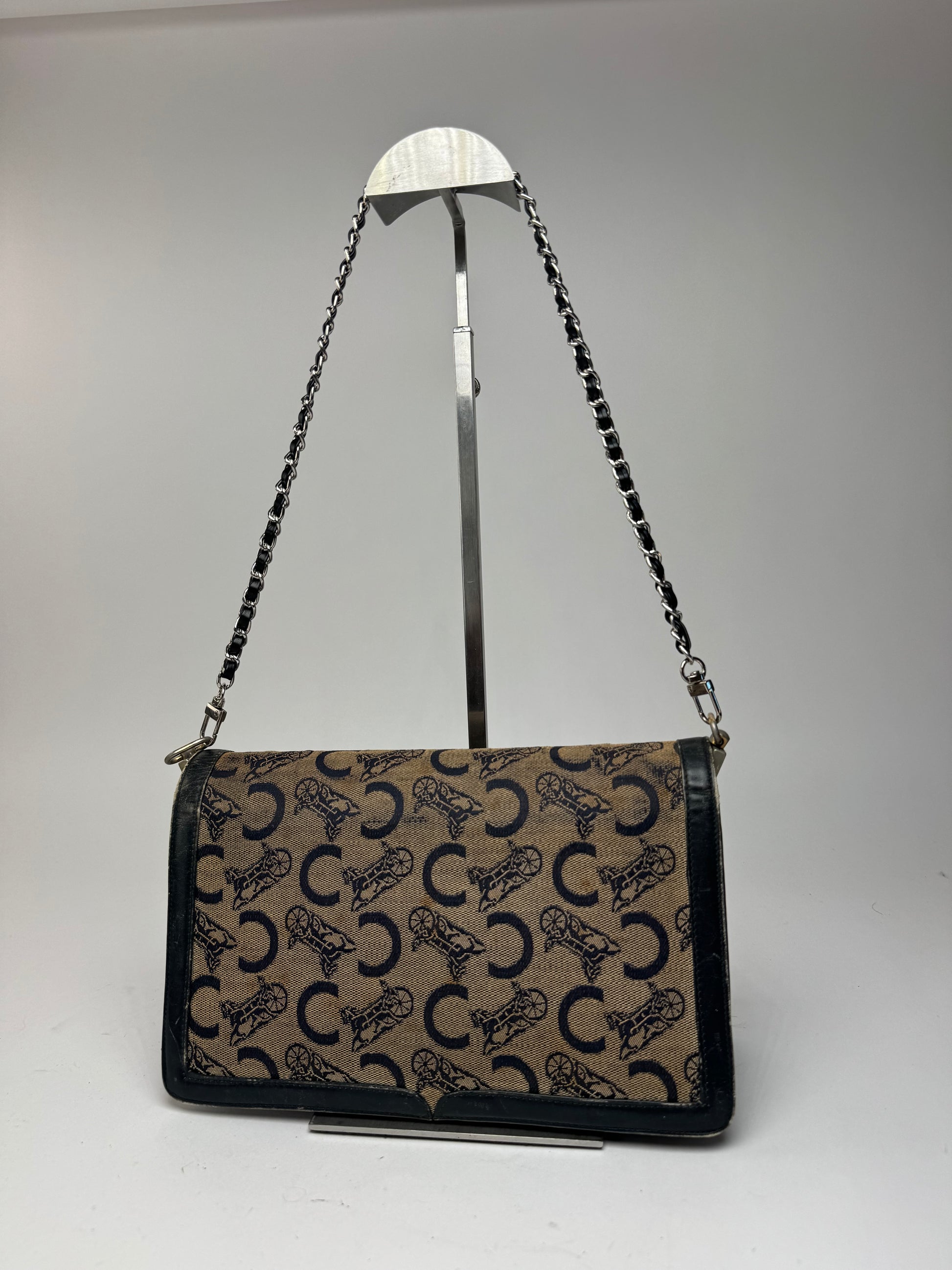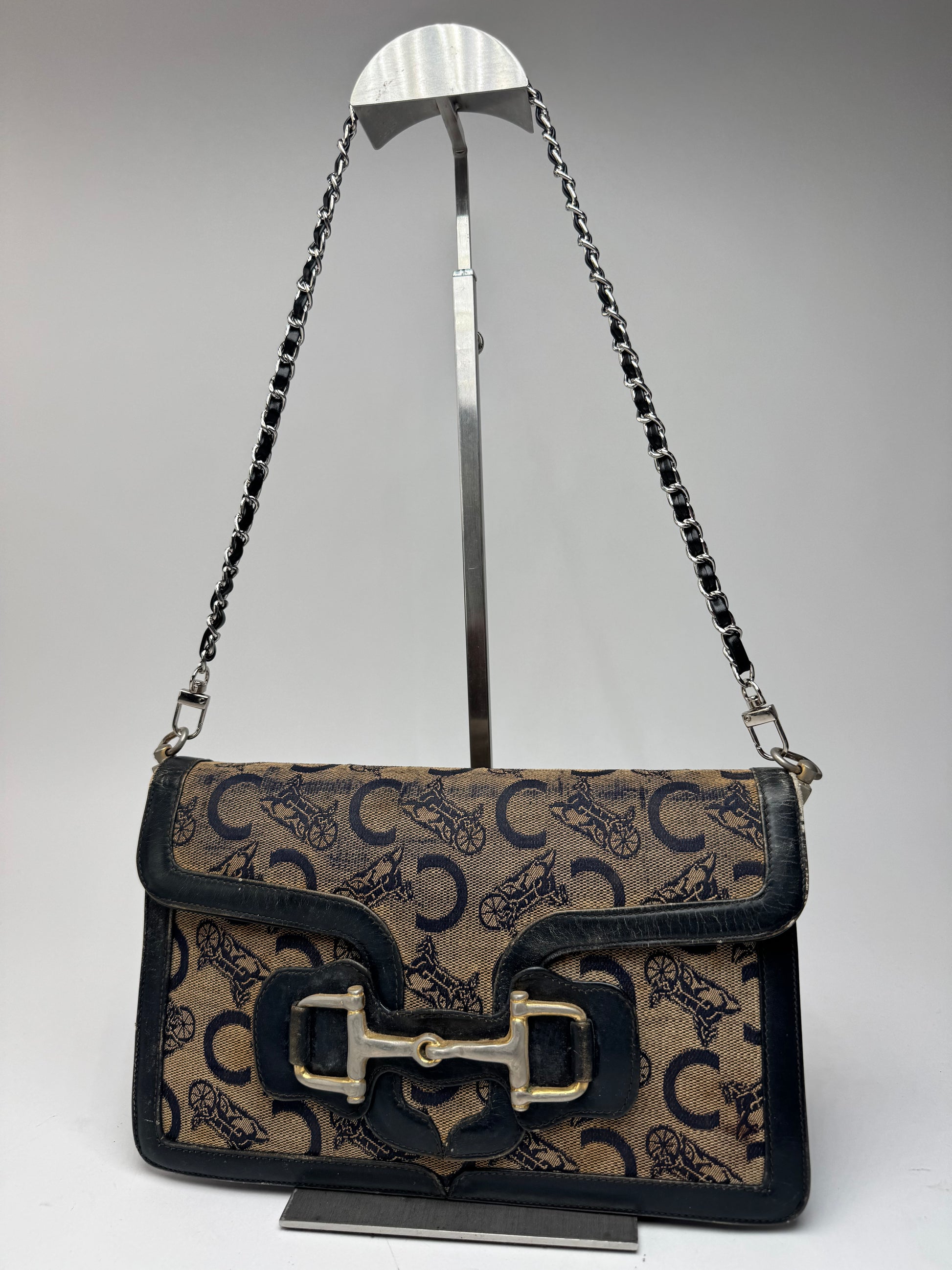 Ce sac à main chic est confectionné en toile marron finement imprimée des monogrammes Carrosse et C CELINE noirs. Il est rehaussé d'une finition en cuir bleu marine et d'un logo fer à cheval en acier argenté sur le devant. L'intérieur est doublé de cuir bleu marine et comporte quatre compartiments pour une organisation optimale. Le modèle Grecy, lancé au milieu du XXe siècle, est réputé pour sa silhouette structurée et ses motifs d'inspiration équestre, ce qui en fait un véritable objet de collection vintage.