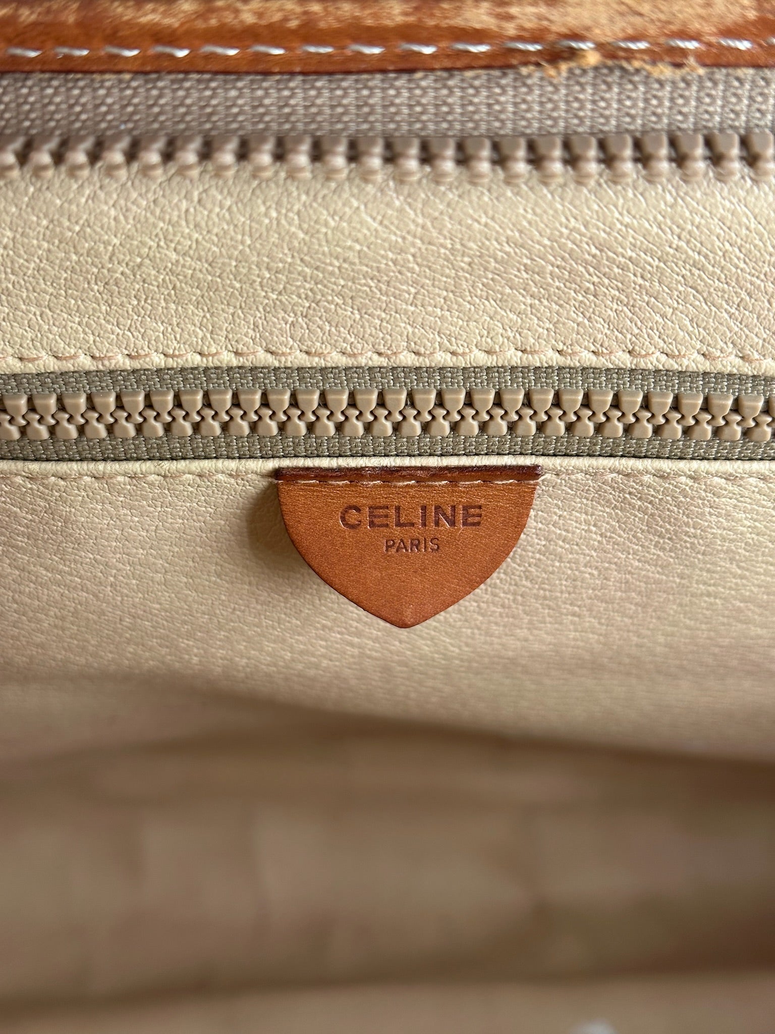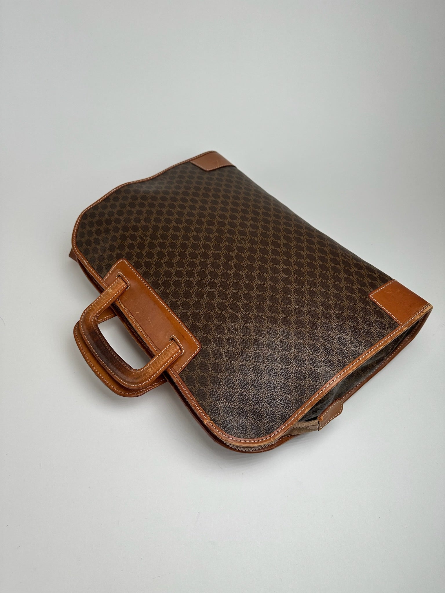 Trousse de voyage CELINE PARIS Vintage Monogram. Cette élégante trousse de voyage est confectionnée en cuir monogrammé CELINE marron foncé avec des finitions en cuir marron clair. Elle est dotée de poignées en cuir rétractables, permettant de la porter comme une pochette ou un bagage à main, ainsi que d'une fermeture zippée sur le dessus. Le dessus s'ouvre sur un intérieur spacieux doublé de cuir marron.