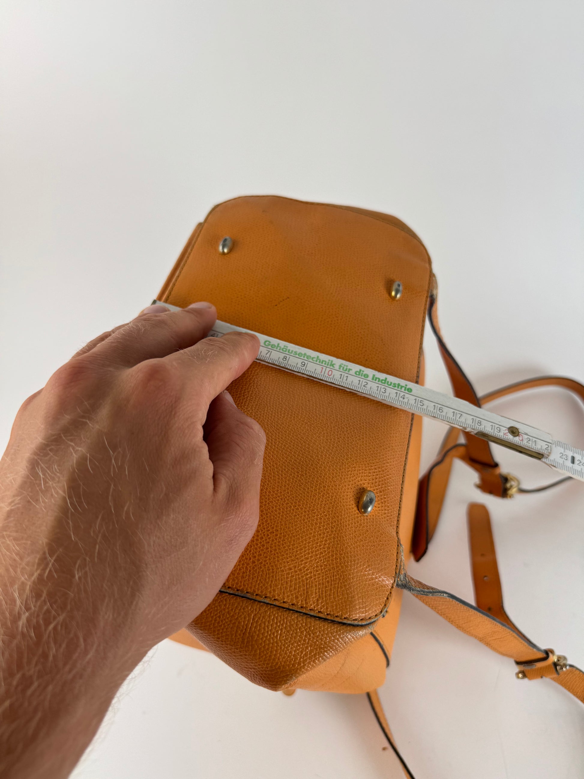Sac à dos en cuir vintage CELINE PARIS. Cet élégant sac à dos de 1996 est confectionné en cuir couleur mangue et doté de finitions en acier doré. Il est doté d'un cordon de serrage et d'un fermoir tourniquet signature. Les bretelles sont réglables pour un confort optimal.