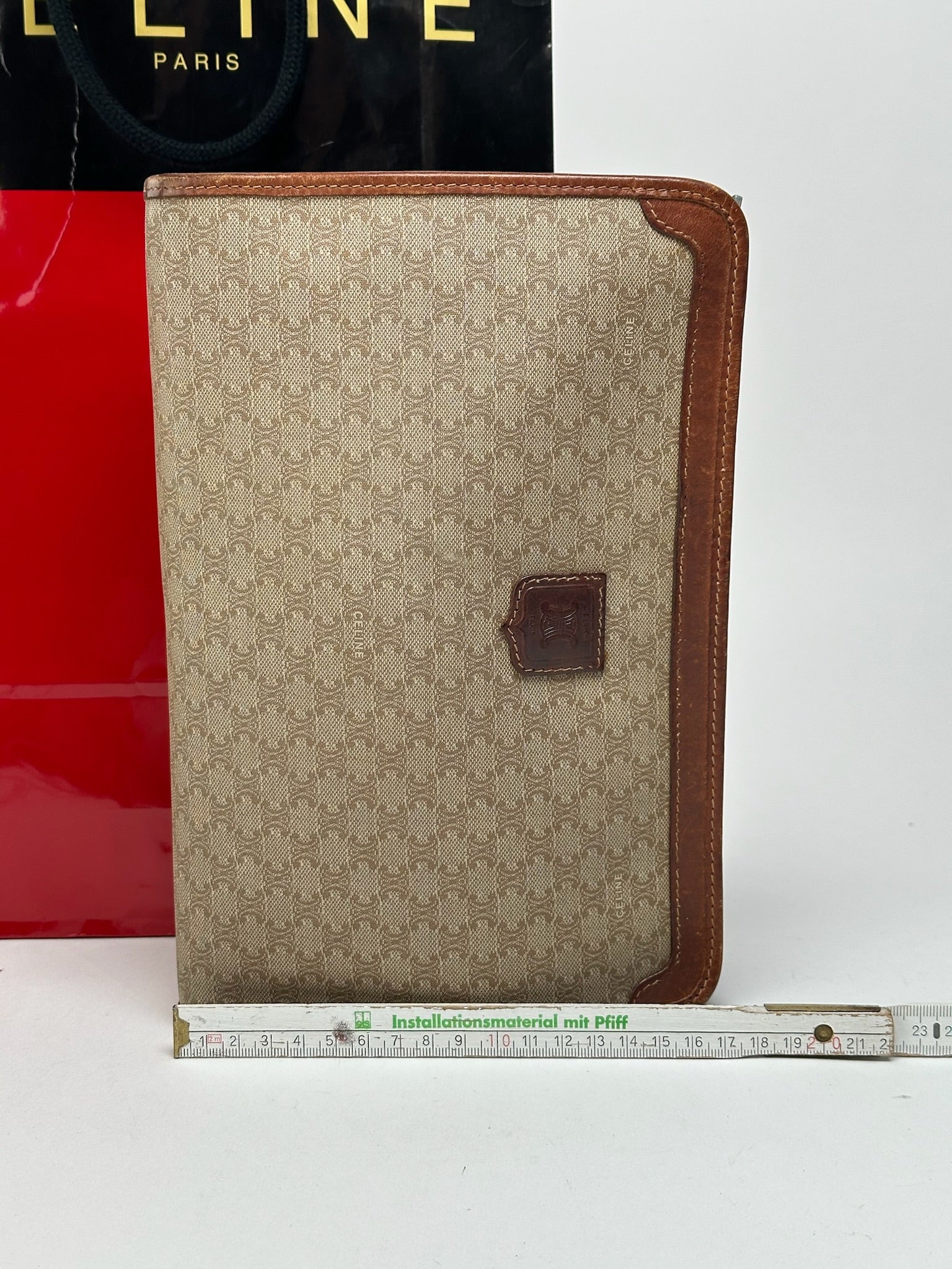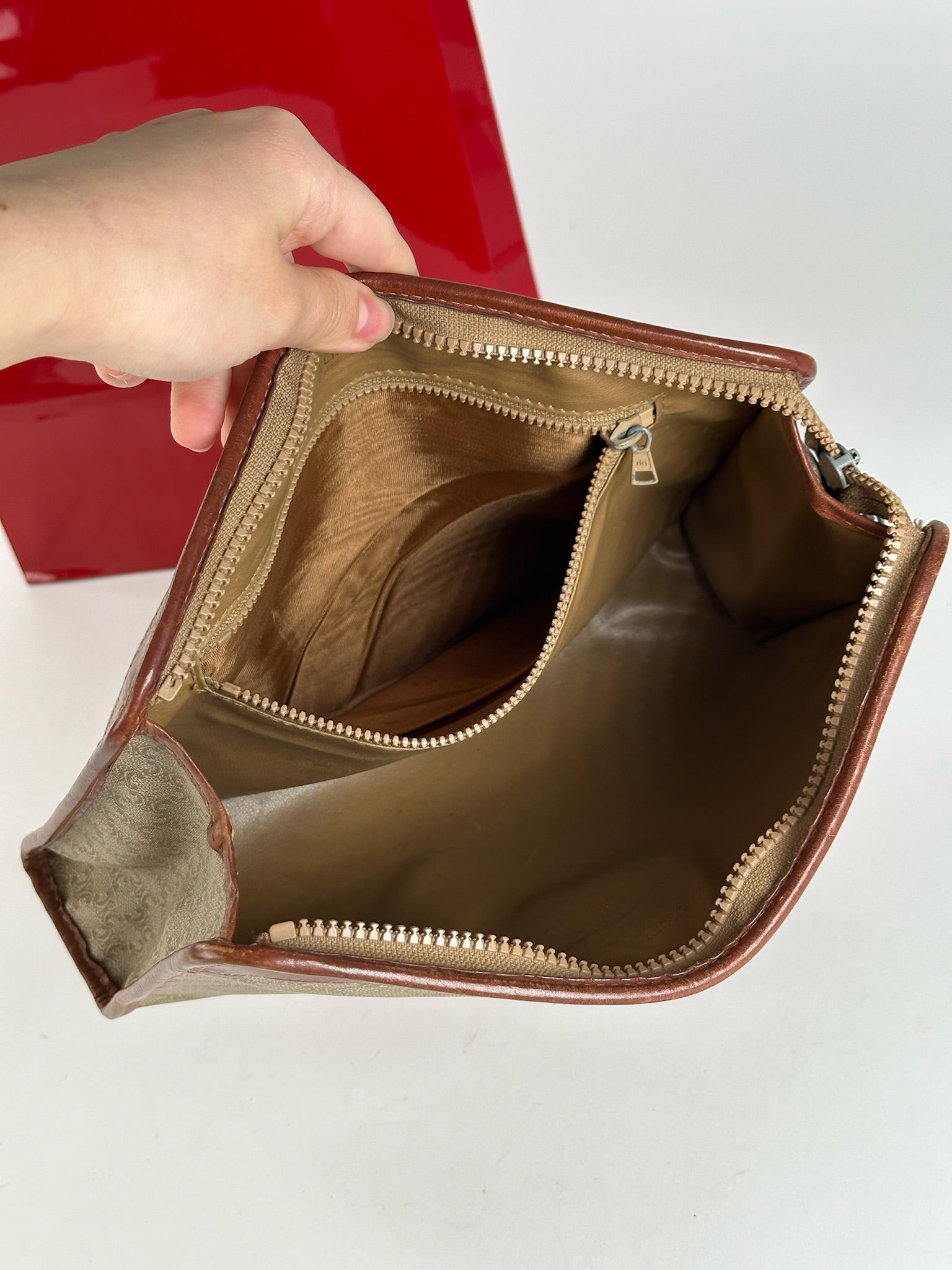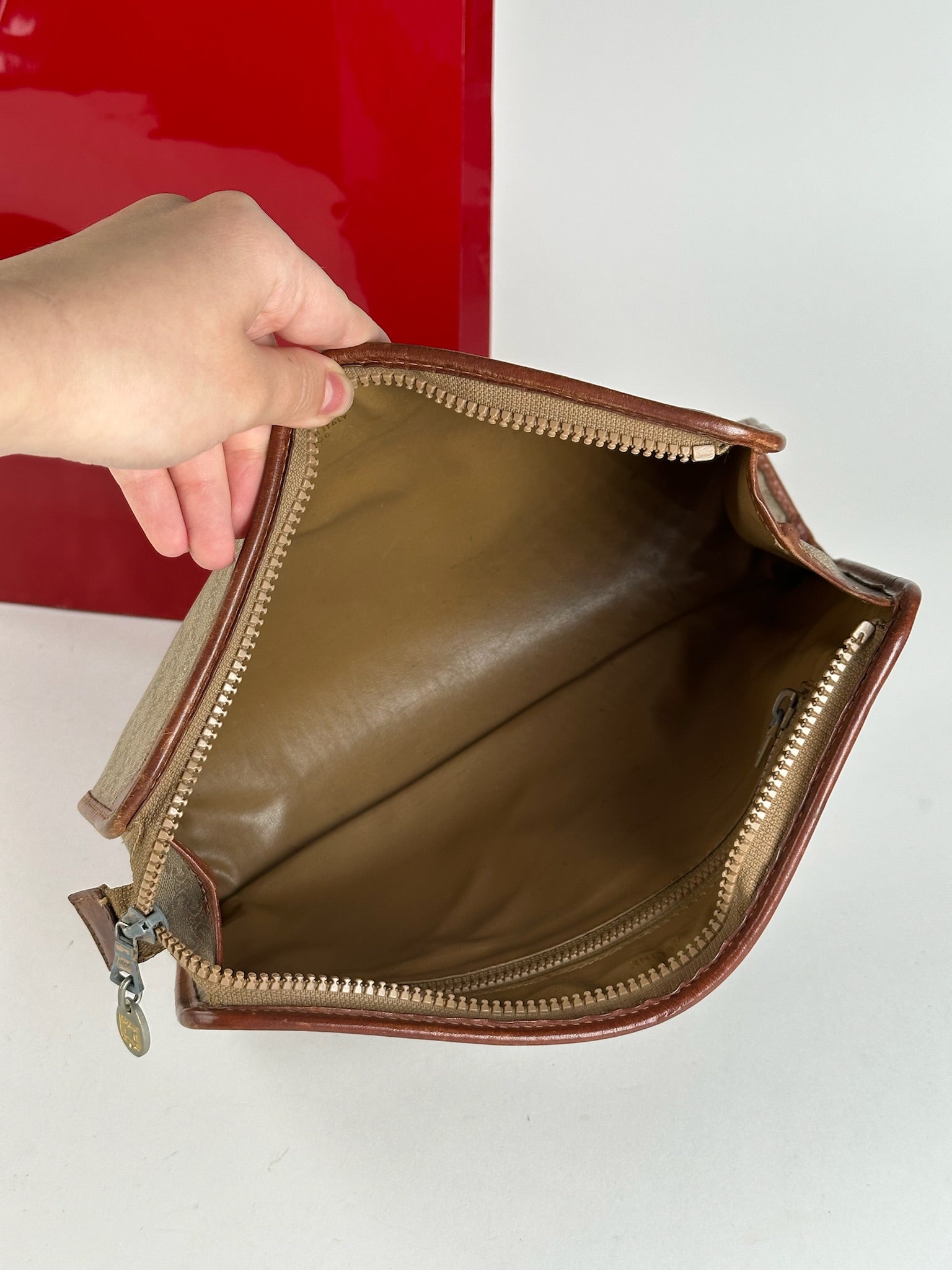 Pochette CELINE PARIS en cuir monogramme vintage. Cette pochette chic est finement confectionnée en cuir beige orné du monogramme CELINE. Le devant est orné d'un patch logo CELINE en cuir marron, avec une bordure en cuir marron. Introduit dans les années 1970, le logo CELINE, orné de « C » entrelacés, s'inspire des maillons de la chaîne qui entoure l'Arc de Triomphe et demeure un symbole de sophistication parisienne. Le sac est doté d'une fermeture zippée sur le dessus et s'ouvre sur un intérieur en cuir beige.