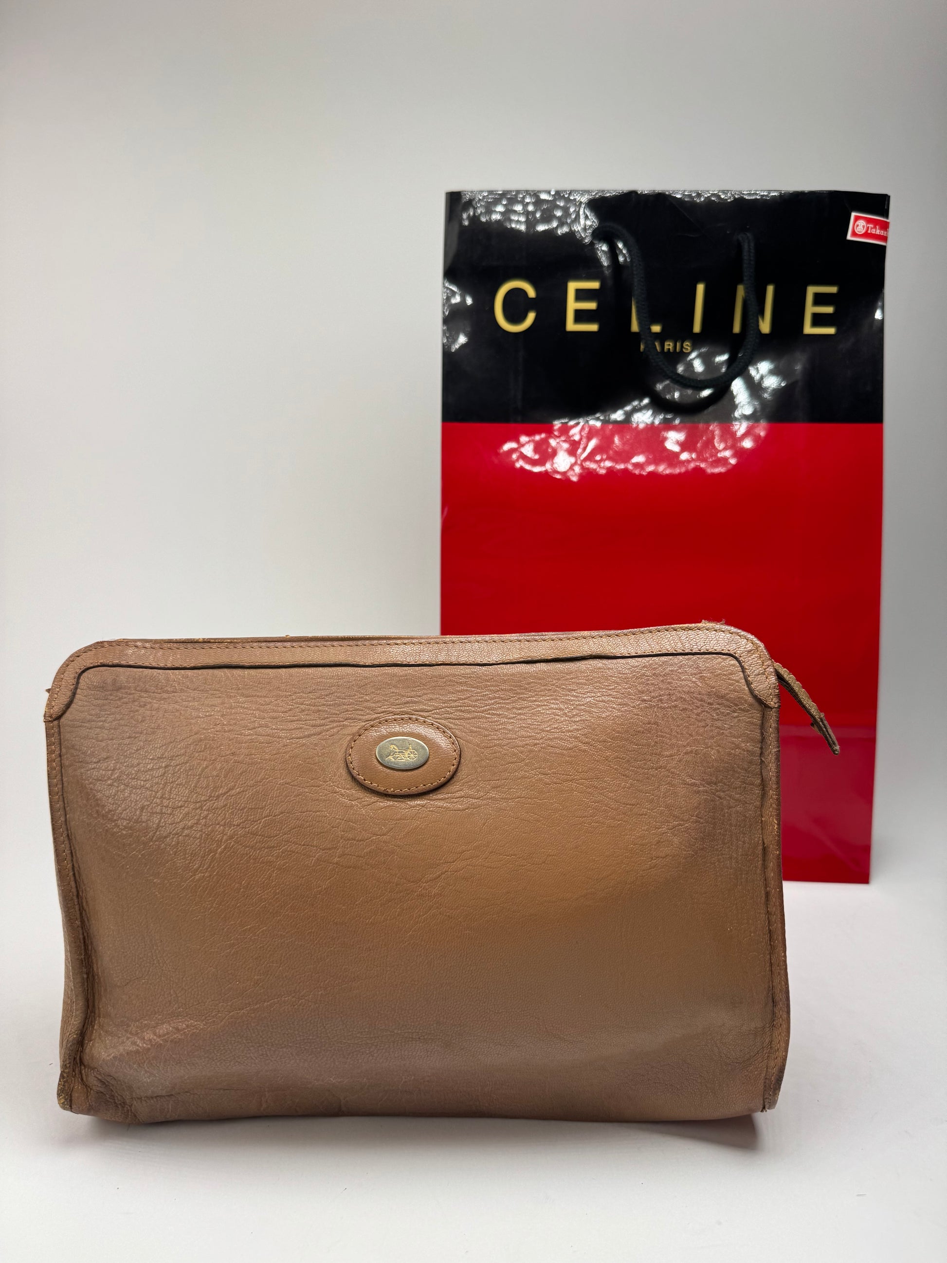 Pochette Triomphe en cuir vintage CELINE PARIS. Cette pochette chic est finement confectionnée en cuir marron clair et ornée d'un logo CELINE en forme de calèche en acier inoxydable doré. Cet accessoire est doté d'un fermoir mousqueton doré.
