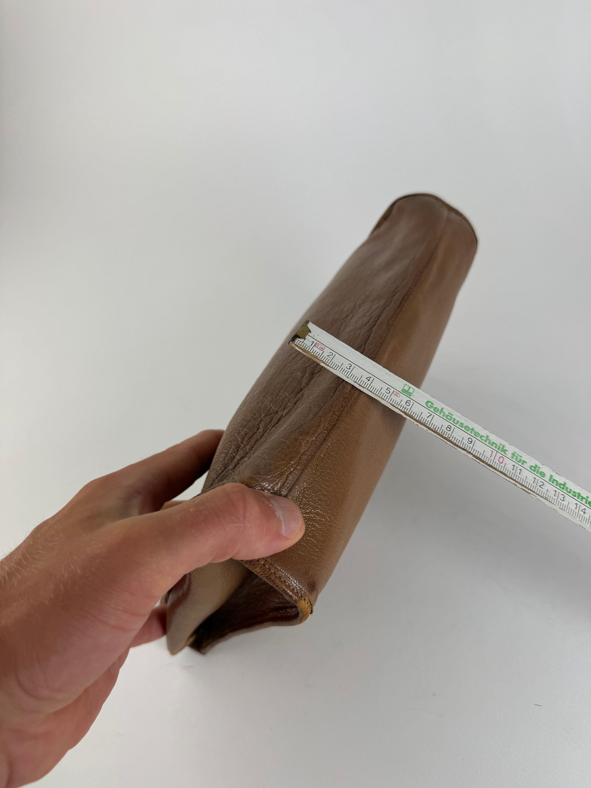 État : Le cuir extérieur est en très bon état, avec de légères taches. La quincaillerie est en acier inoxydable doré brillant, présentant de légères traces d'usure.