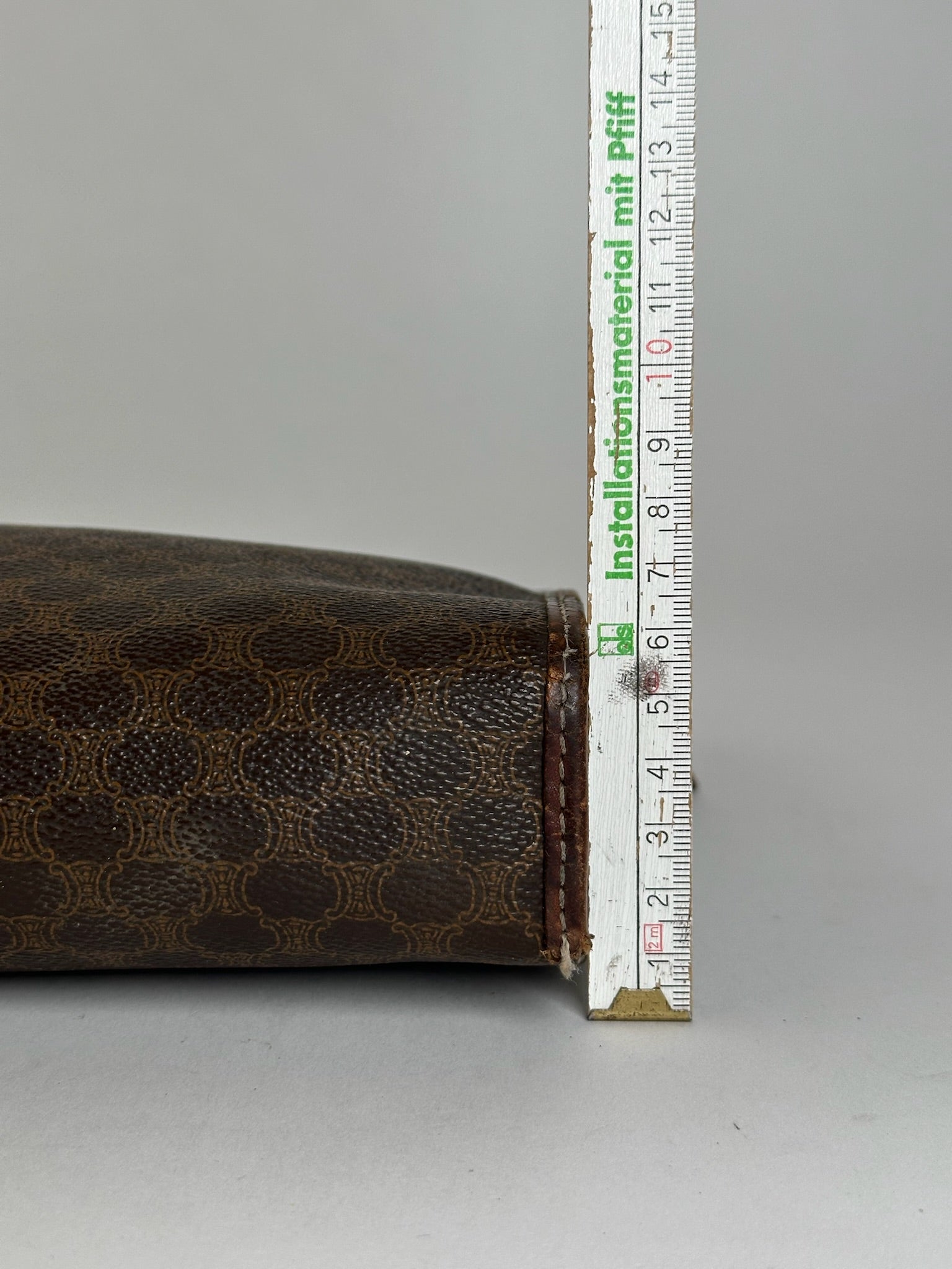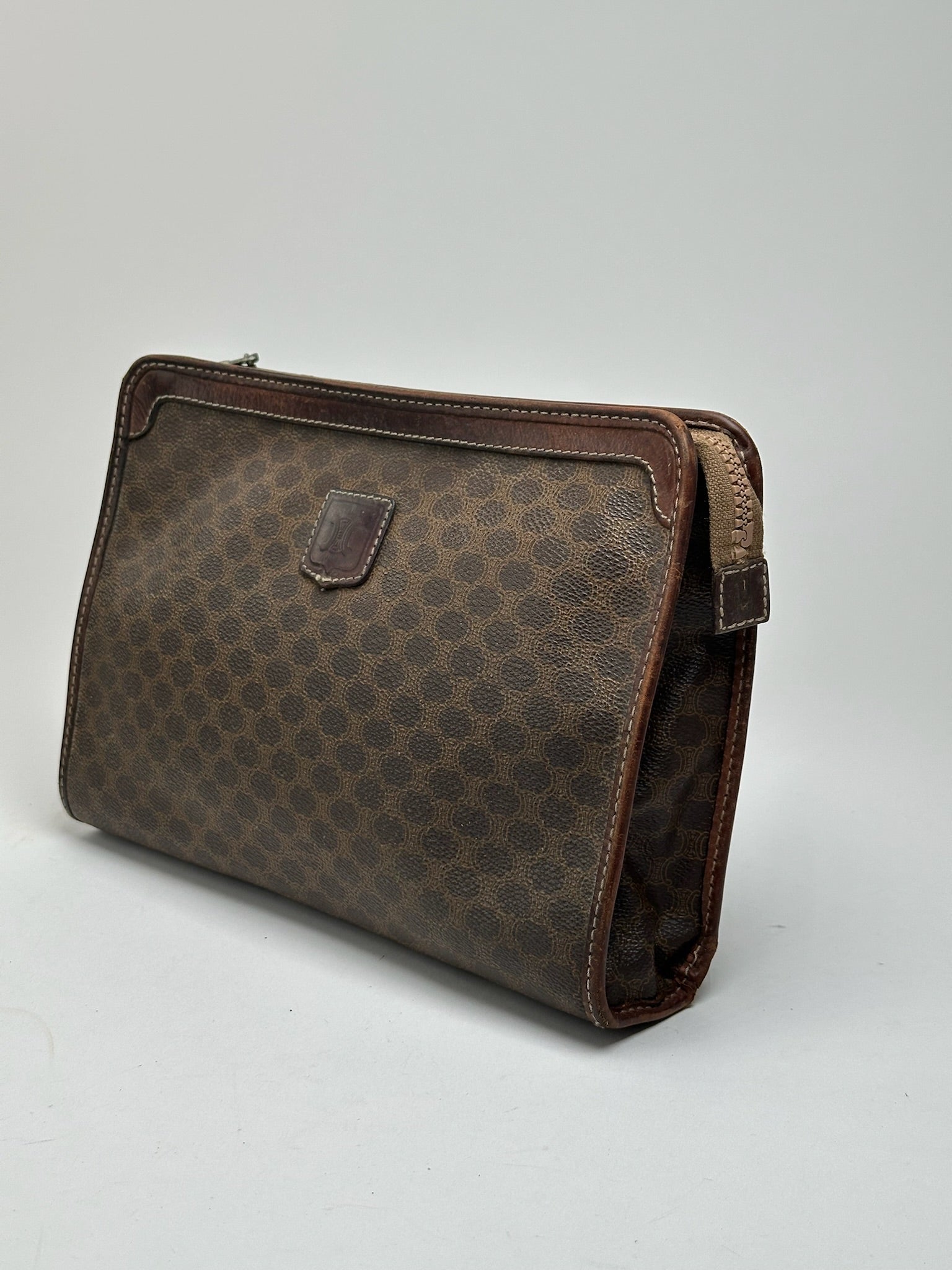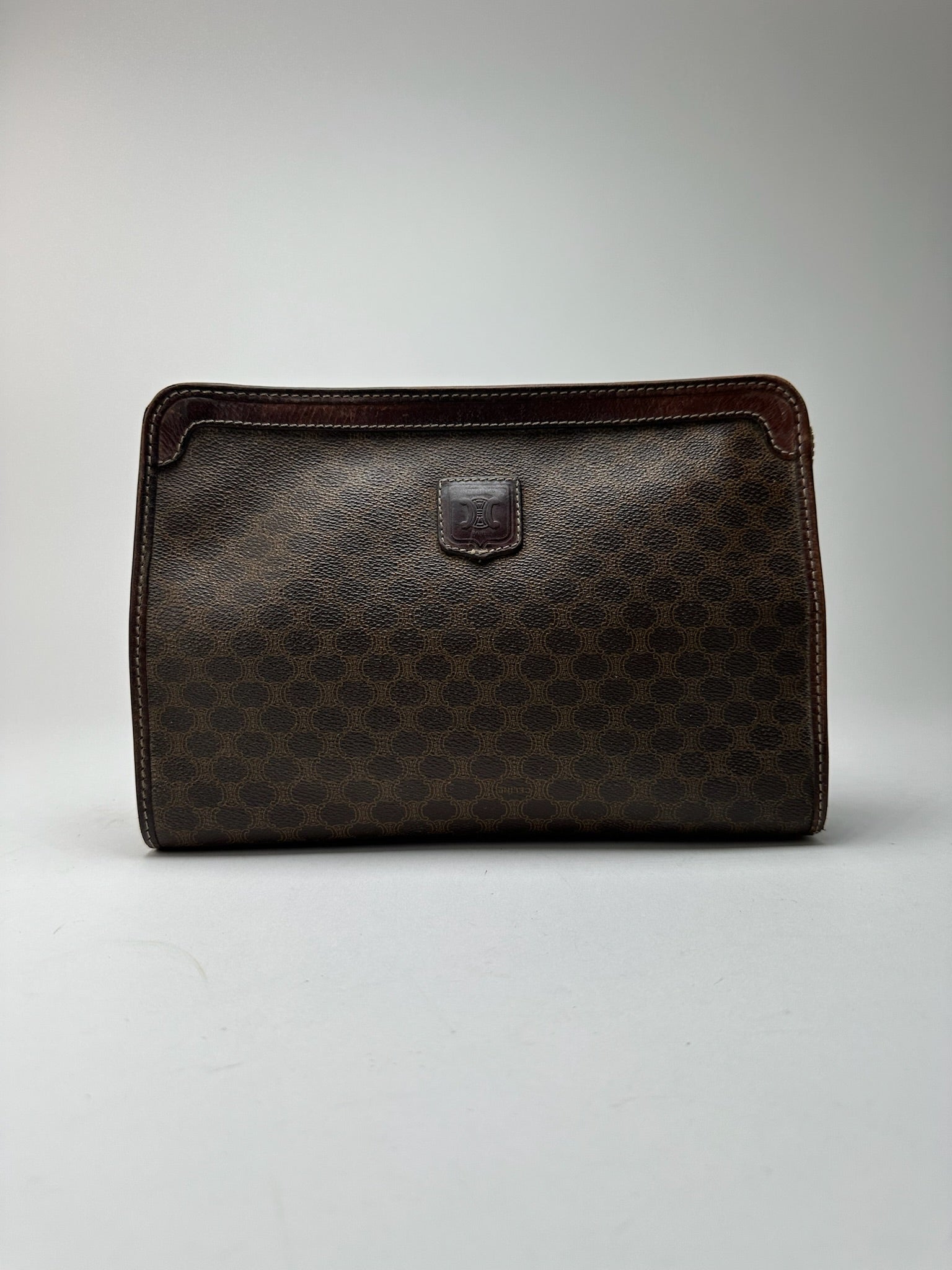 Pochette Céline Paris Vintage Macadam Monogram. Cette pochette chic est confectionnée en toile monogrammée en cuir et mousseline marron foncé. Le devant arbore le logo CELINE classique. Inspiré par les ferronneries complexes de l'Arc de Triomphe, le logo CELINE a été introduit dans les années 1970 et est depuis devenu un emblème intemporel de la maison. Ce sac possède une fermeture zippée sur le dessus et s'ouvre sur un intérieur spacieux.