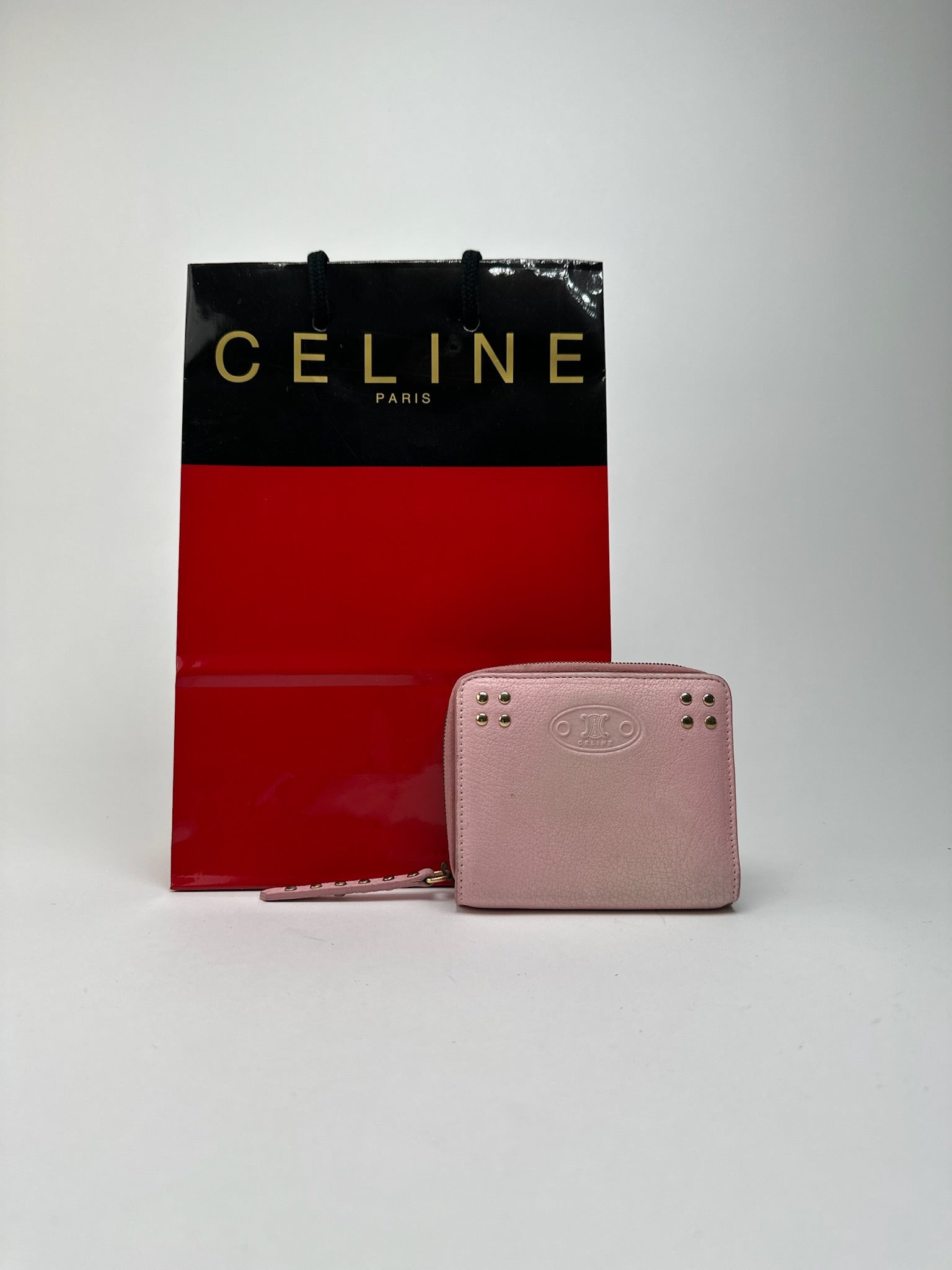 Portefeuille CELINE PARIS en cuir rose vintage. Ce portefeuille chic est finement confectionné en cuir rose, orné du logo CELINE sur le devant et de surpiqûres dorées décoratives de chaque côté. Il est doté d'une fermeture zippée sur le dessus.
