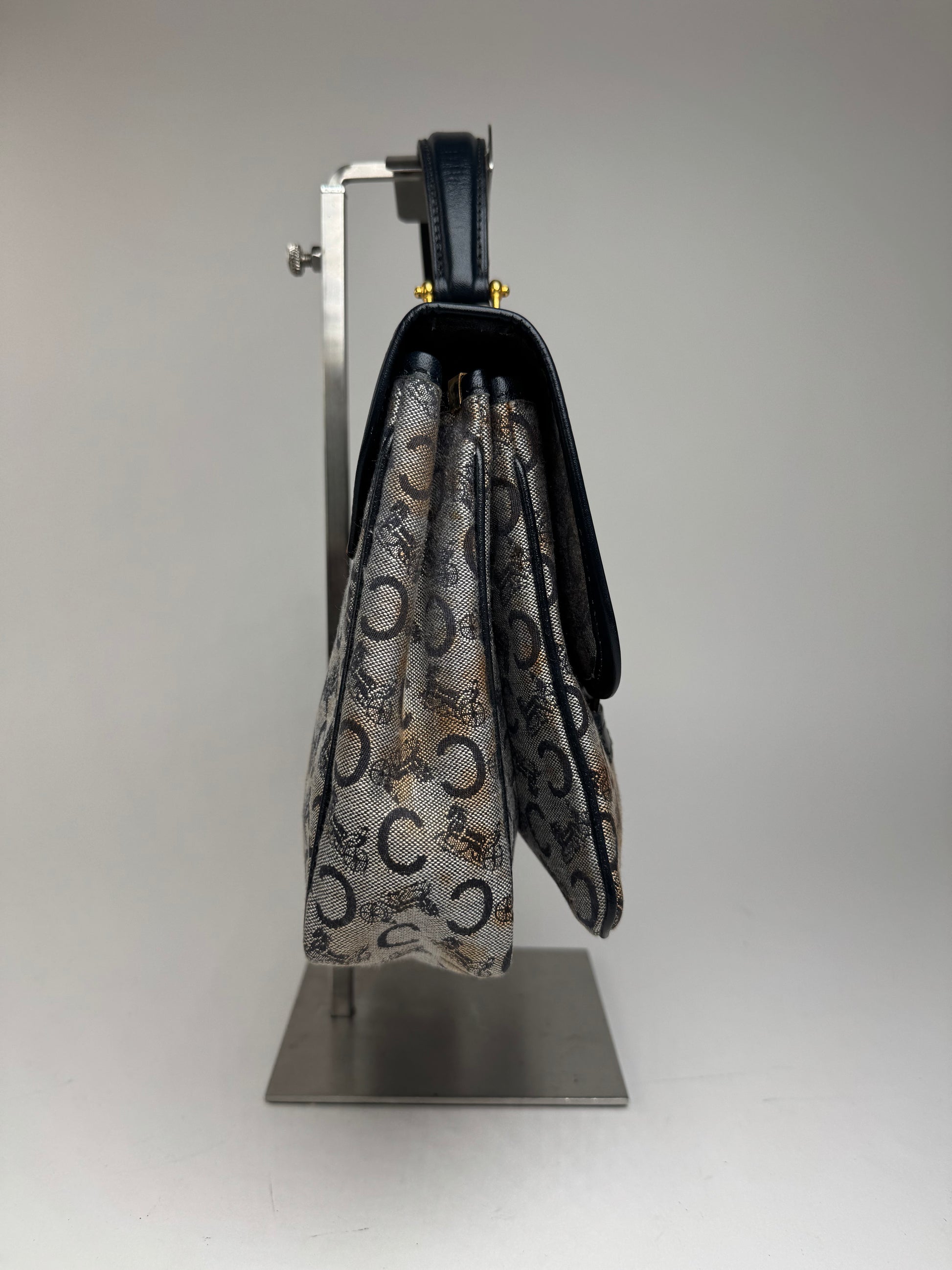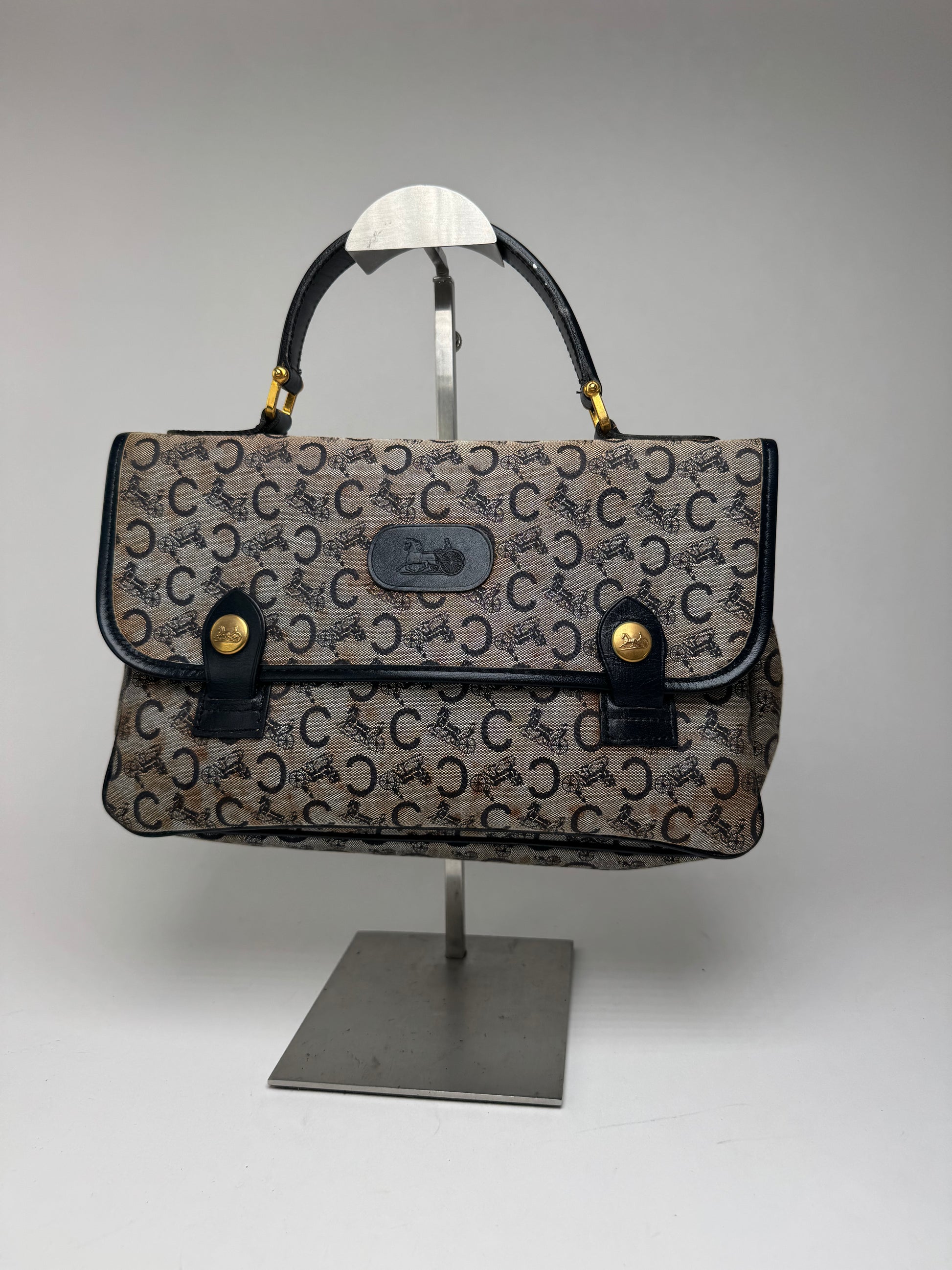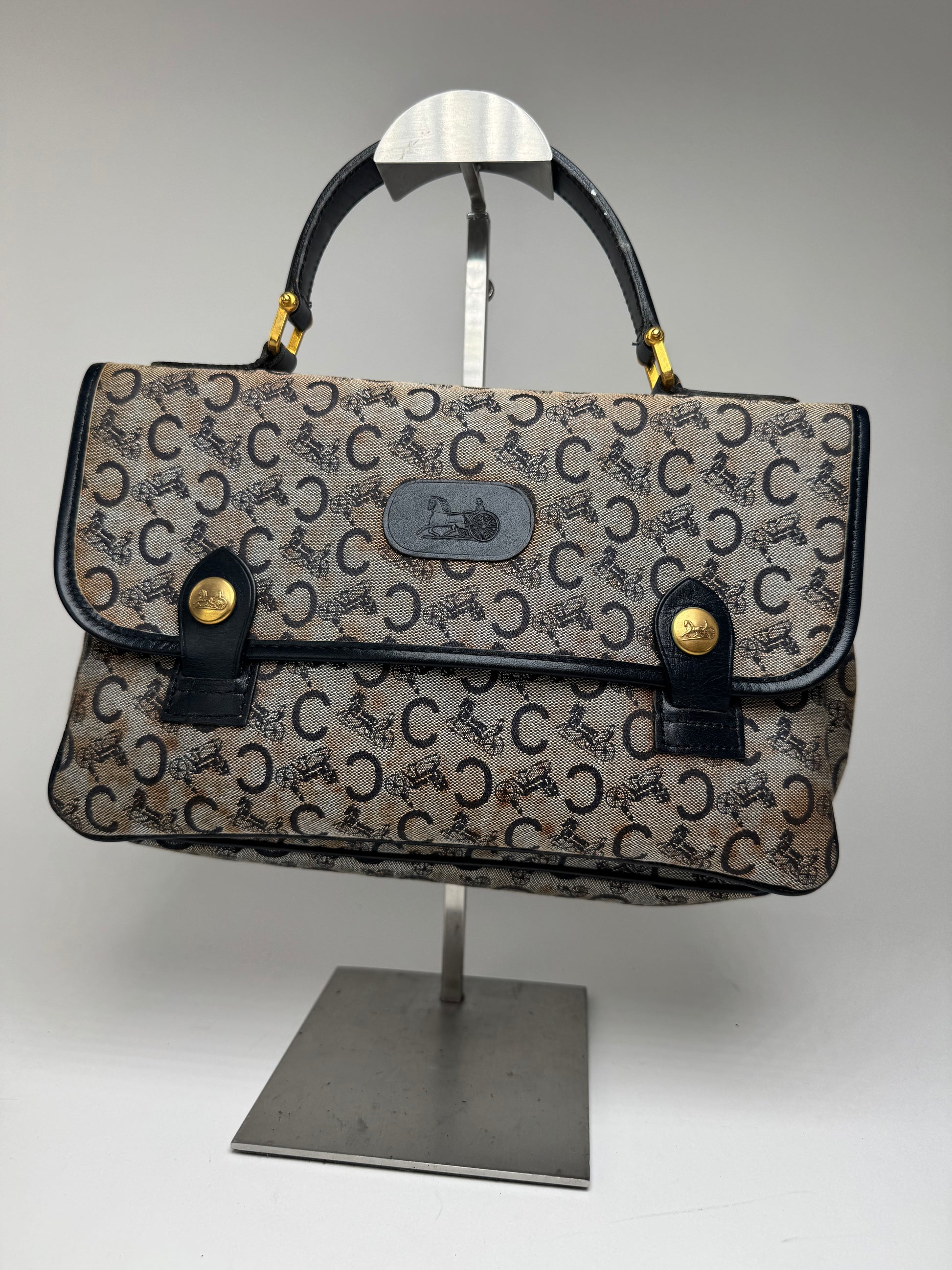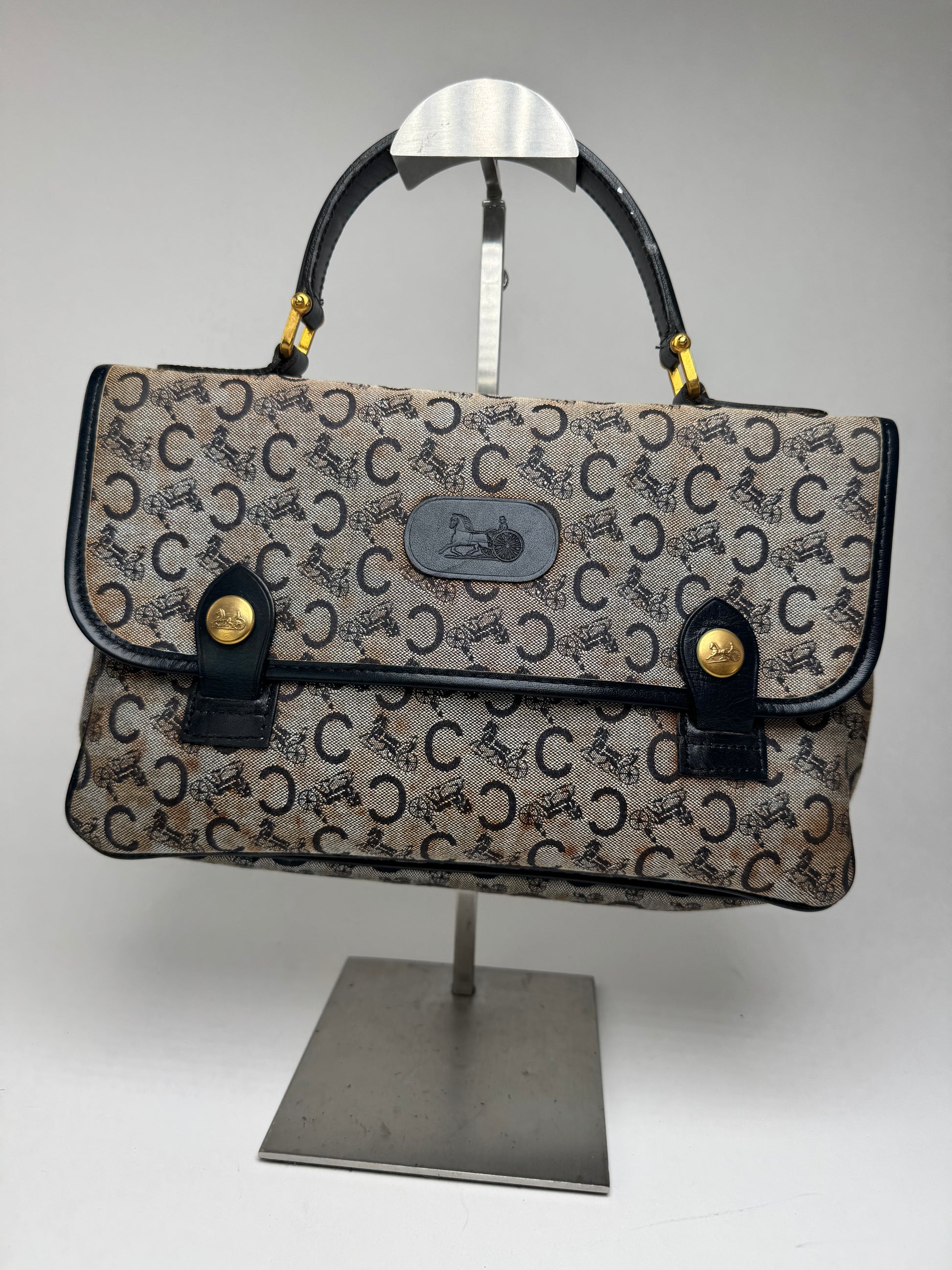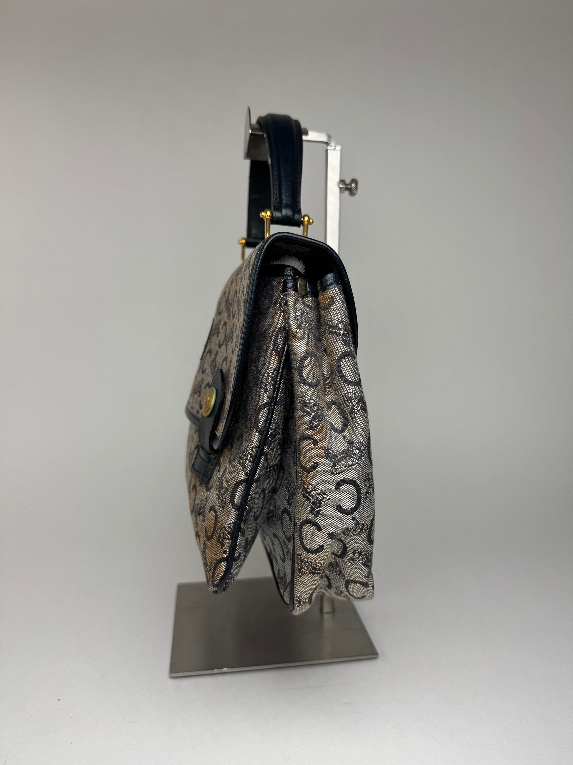 Sac à main vintage CELINE PARIS en toile gris-noir avec monogramme C. Ce sac à main vintage rare est confectionné en toile gris-noir ornée du monogramme « C » classique de Céline. Il est doté d'une poignée structurée en cuir noir, d'accessoires en acier doré et de deux boutons-pression ornés de l'emblématique logo carrosse Celine. Des touches de cuir noir viennent encadrer le modèle. L'intérieur est doublé de cuir beige-marron. Fabriqué en France et datant probablement des années 1980, ce modèle allie héritage et style parisien intemporel. Introduit dans les années 1970, le monogramme « C » Céline est devenu un symbole du minimalisme élégant et de la sophistication graphique de la marque.