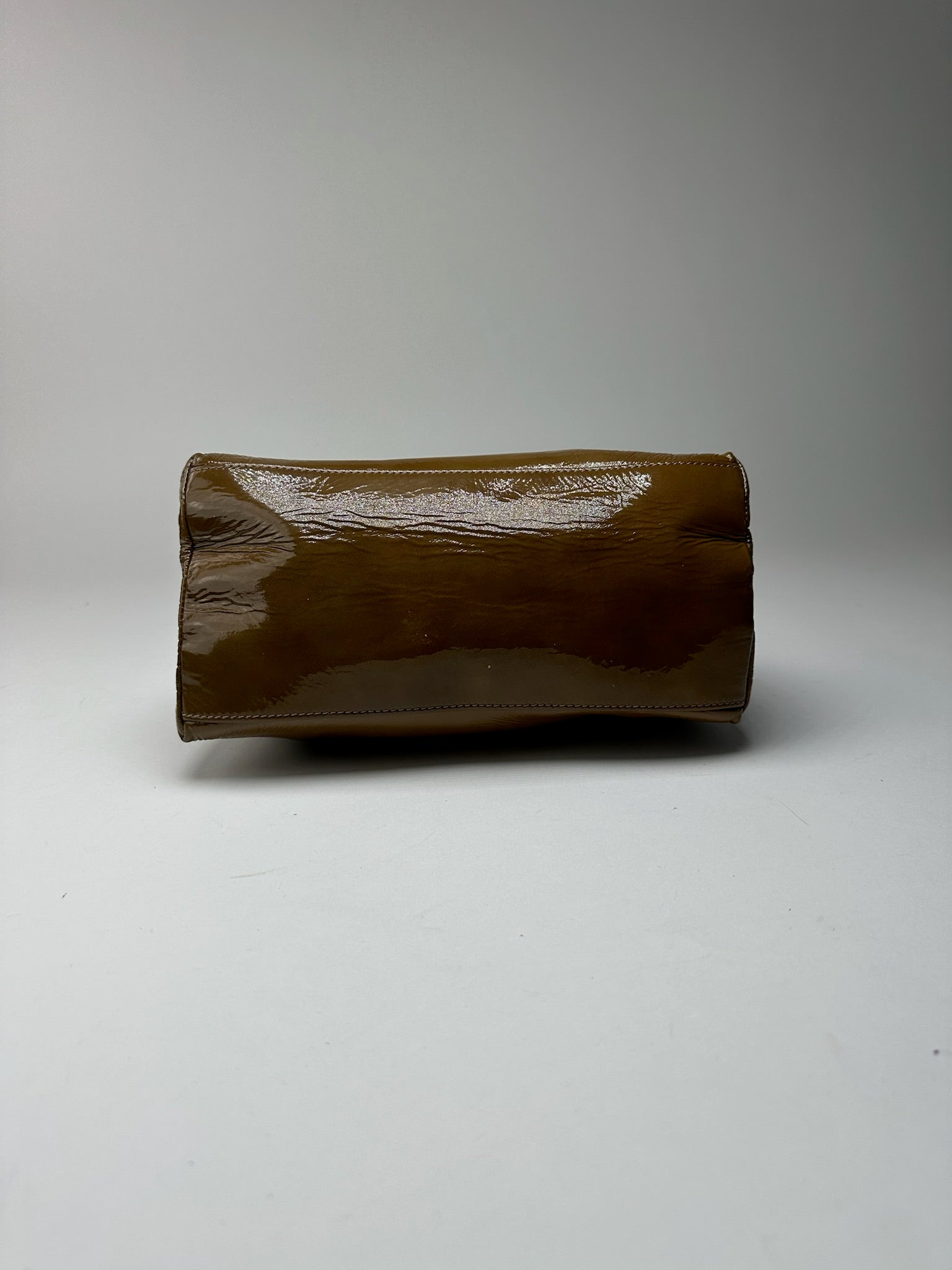 État : L'extérieur en cuir verni est propre et en très bon état, avec de légères taches. Les poignées sont solides et présentent peu de traces d'usure. La doublure intérieure est en excellent état.