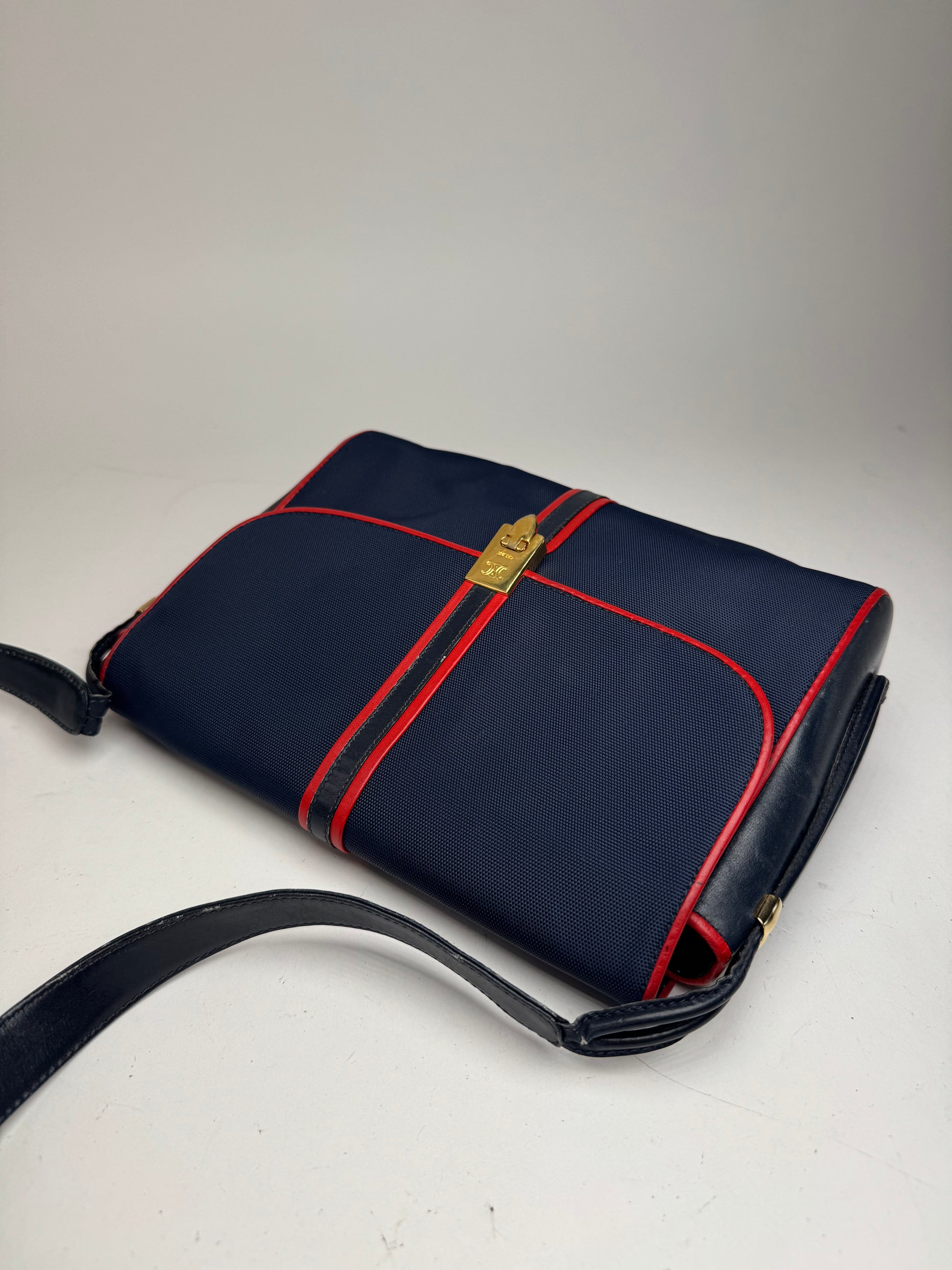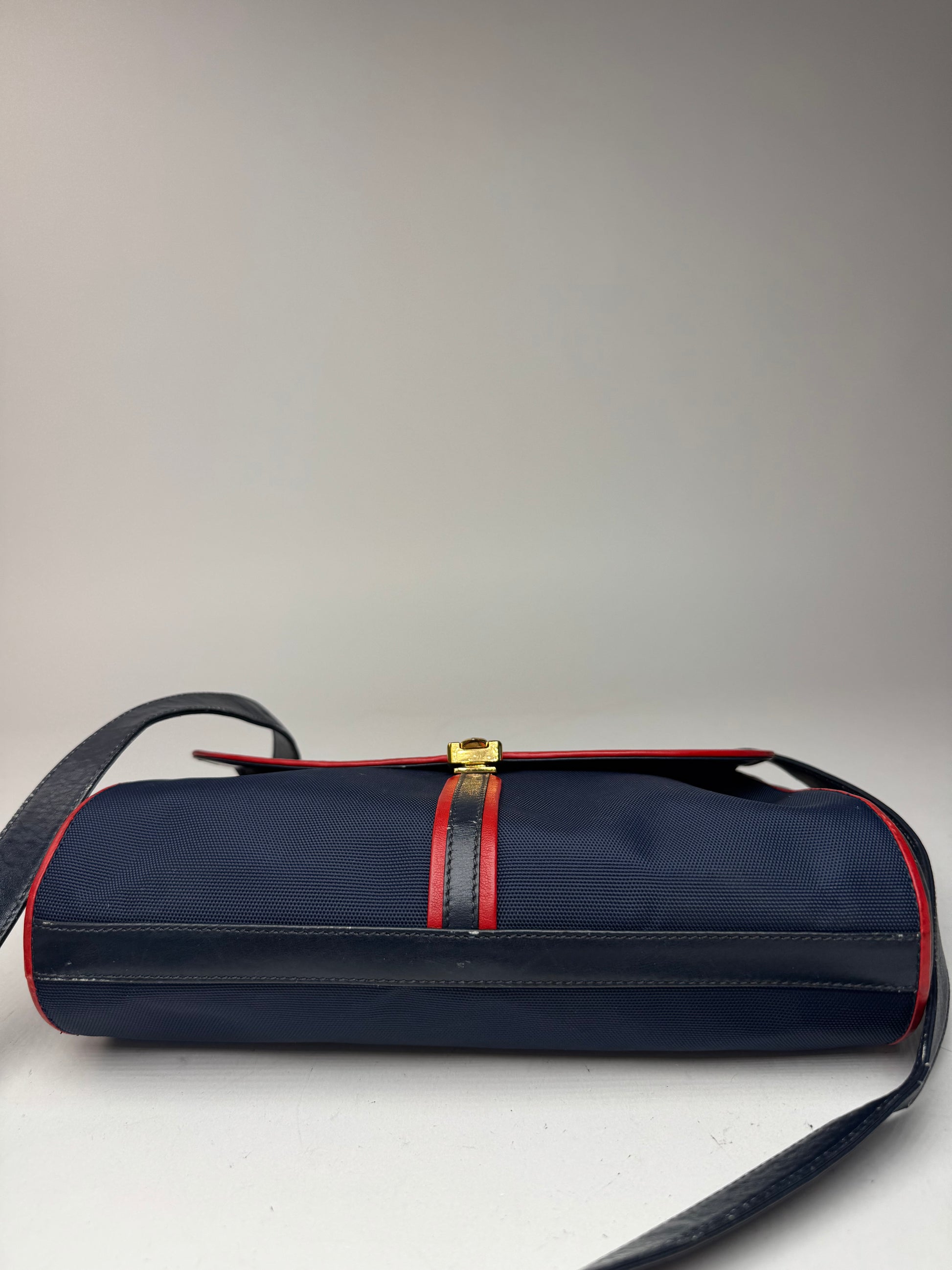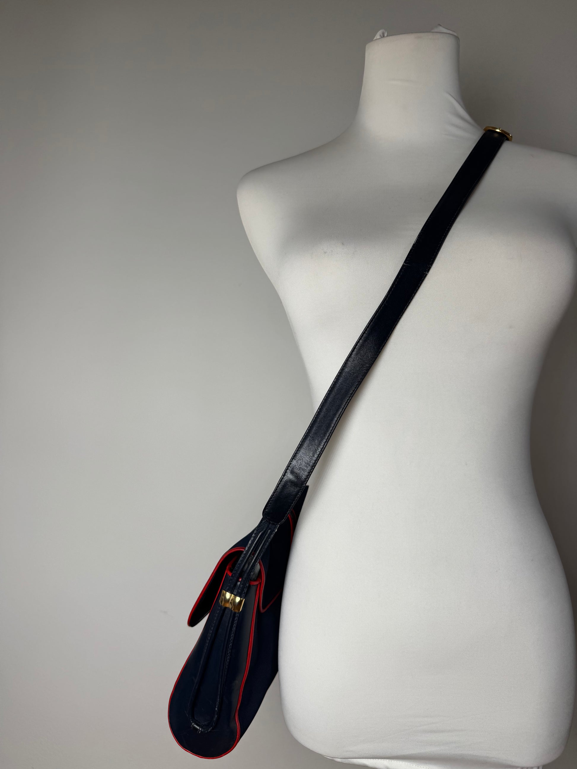 Ce sac bandoulière chic est finement confectionné en toile bleu marine avec des finitions en cuir bleu marine et rouge. Il est doté d'un rabat, d'une longue bandoulière réglable en cuir bleu marine et de finitions dorées. L'intérieur est doublé de cuir bleu marine assorti. Fabriqué en Italie.