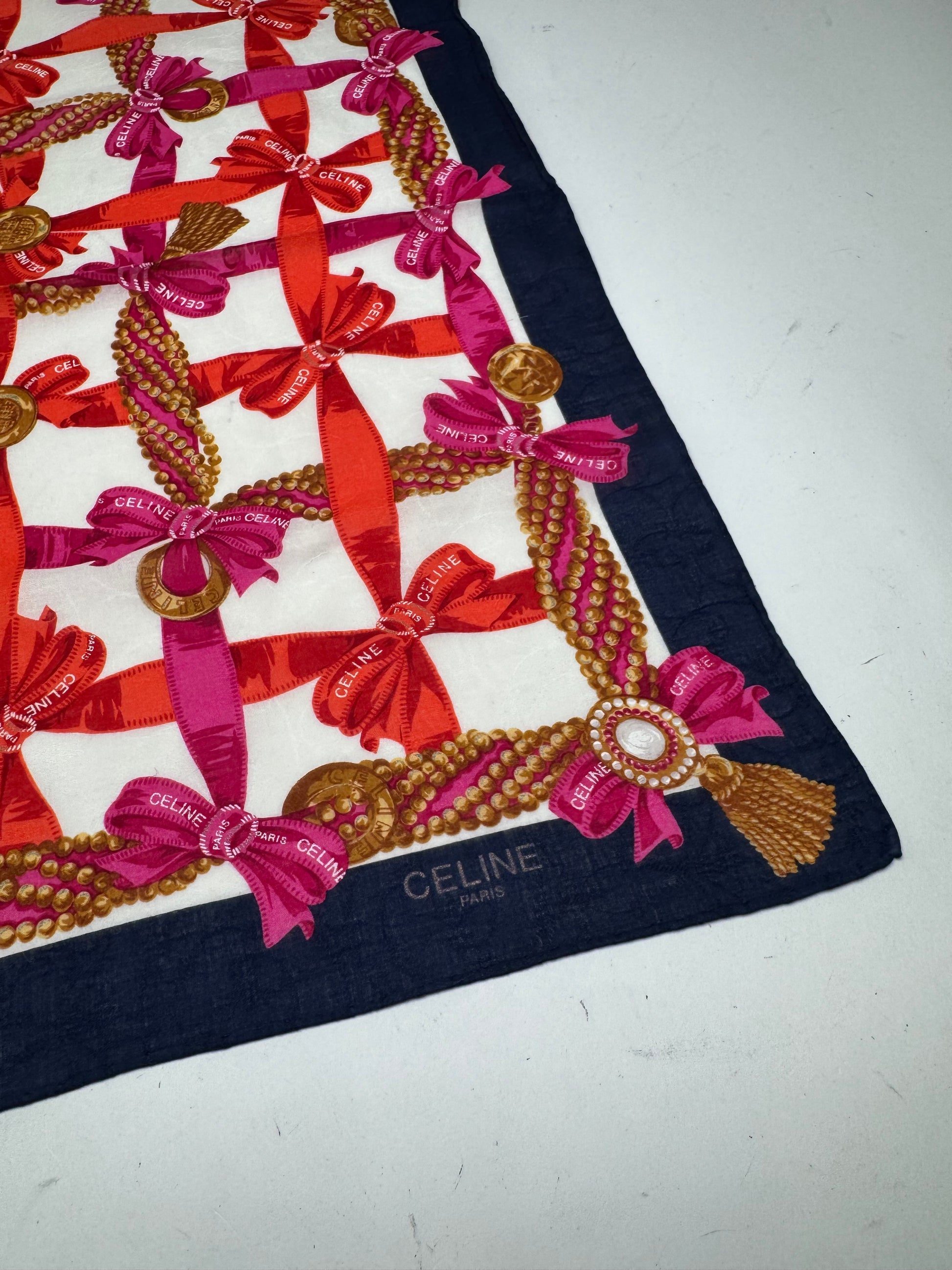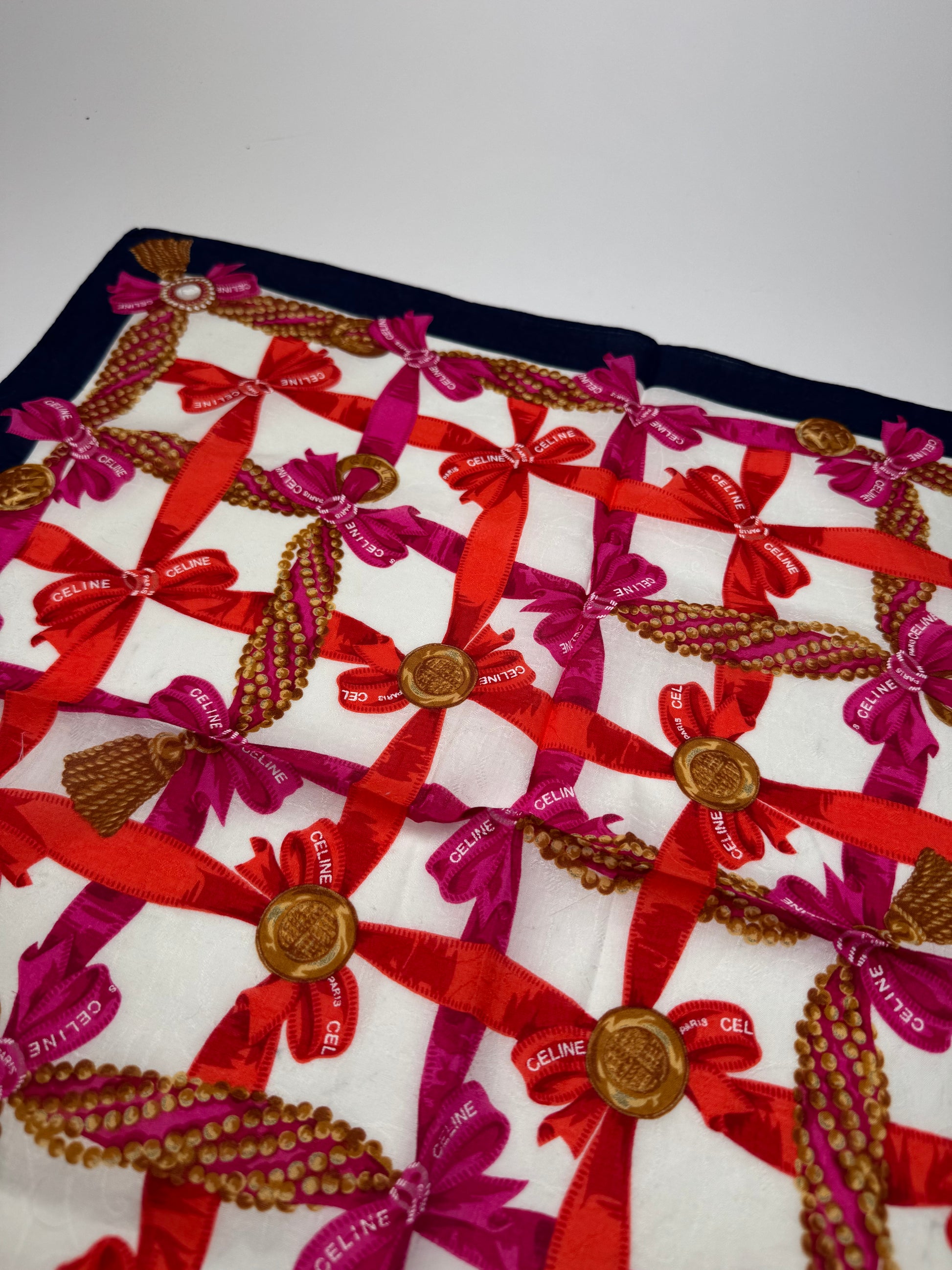 Cet accessoire chic présente une base blanche ornée de boucles rouges et violettes, rehaussée de motifs de bijoux dorés. Le bord bleu marine est subtilement encadré.