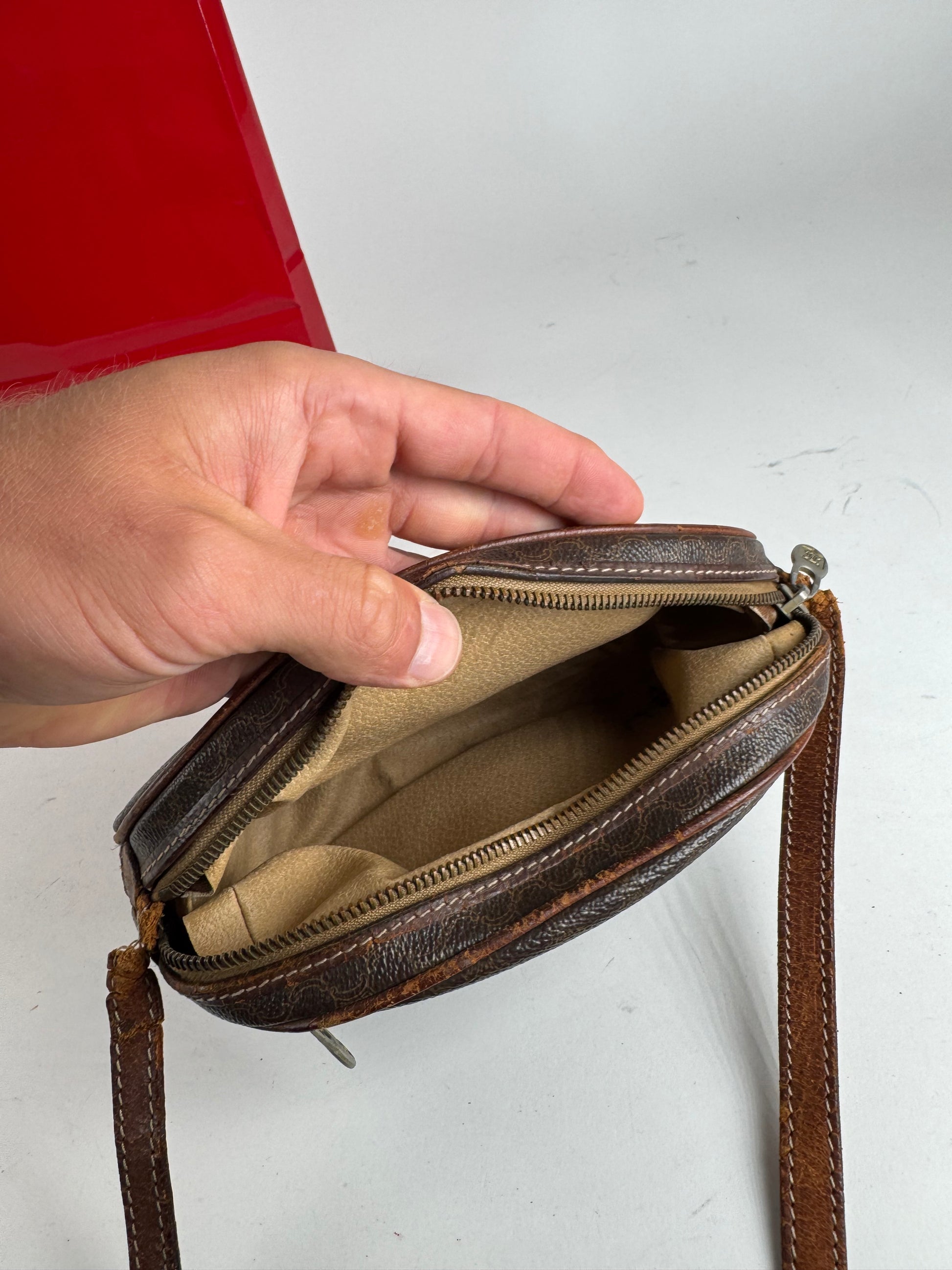 Ce sac bandoulière vintage est confectionné en cuir marron foncé et arbore le monogramme Triomphe emblématique, ainsi que le logo Triomphe emblématique sur le devant. Initialement présenté dans les années 1970 et inspiré des maillons de l'Arc de Triomphe à Paris, cet emblème reflète l'élégance intemporelle de la maison. Ce sac est doté d'accessoires en acier doré et argenté et d'une bandoulière réglable pour un porté polyvalent.