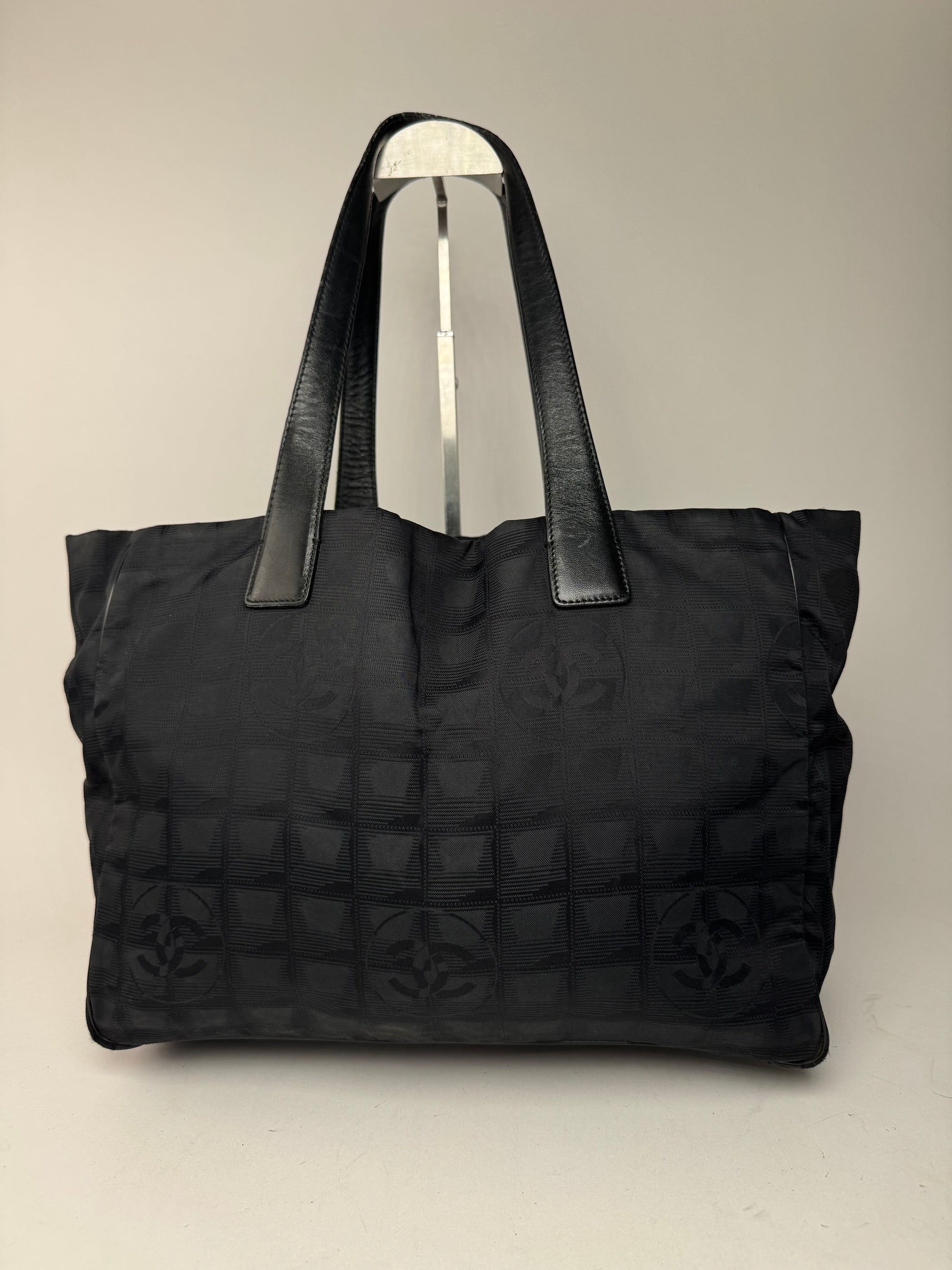 Sac cabas vintage Chanel Monogram. Ce sac cabas vintage est confectionné en toile noire finement travaillée, ornée du monogramme Chanel. Il est doté d'anses en cuir noir et s'ouvre sur un intérieur en polyester noir.