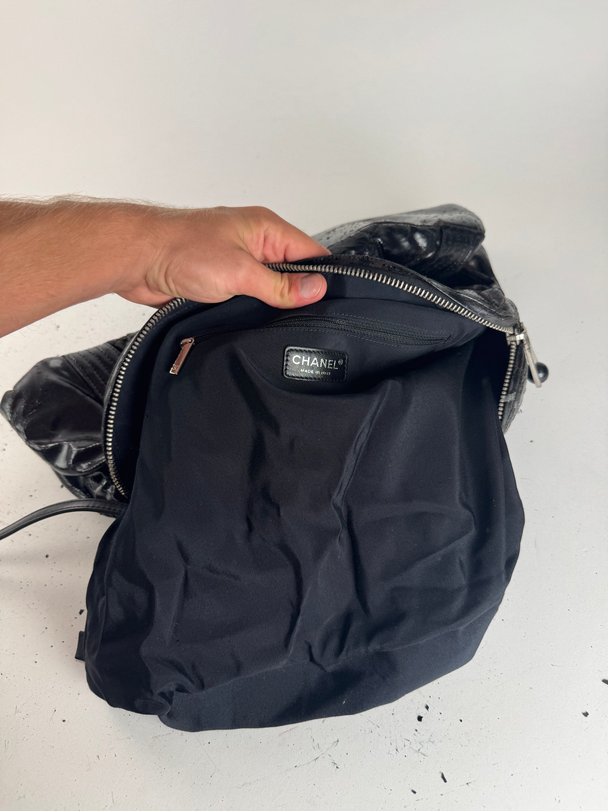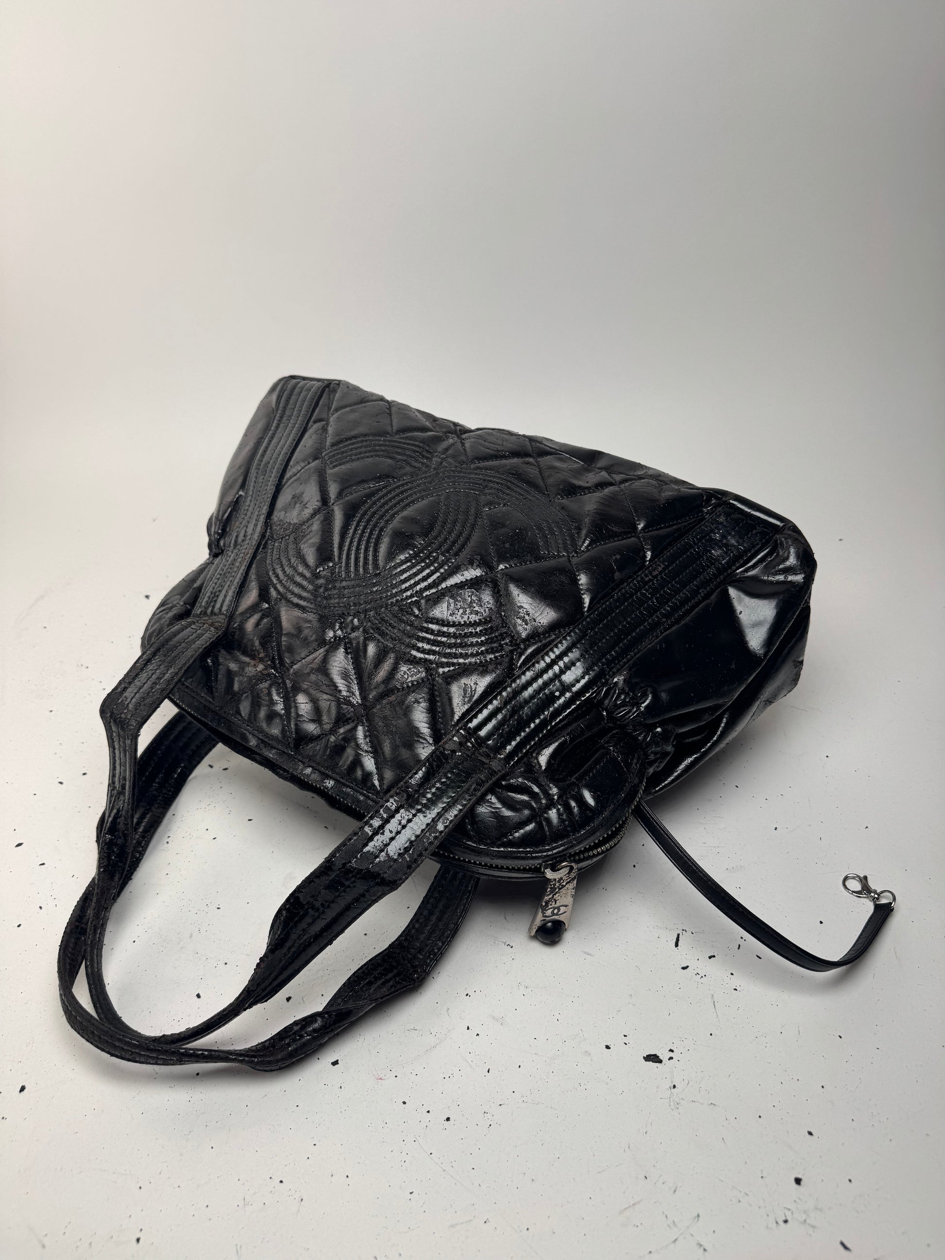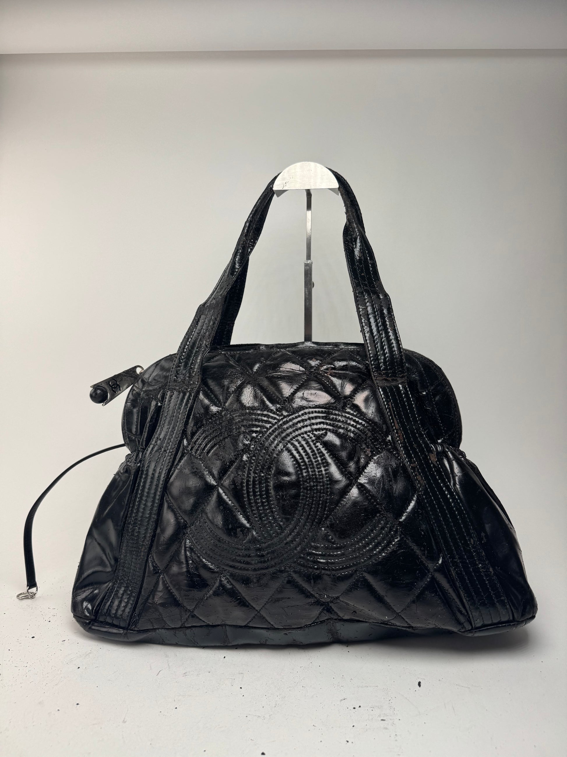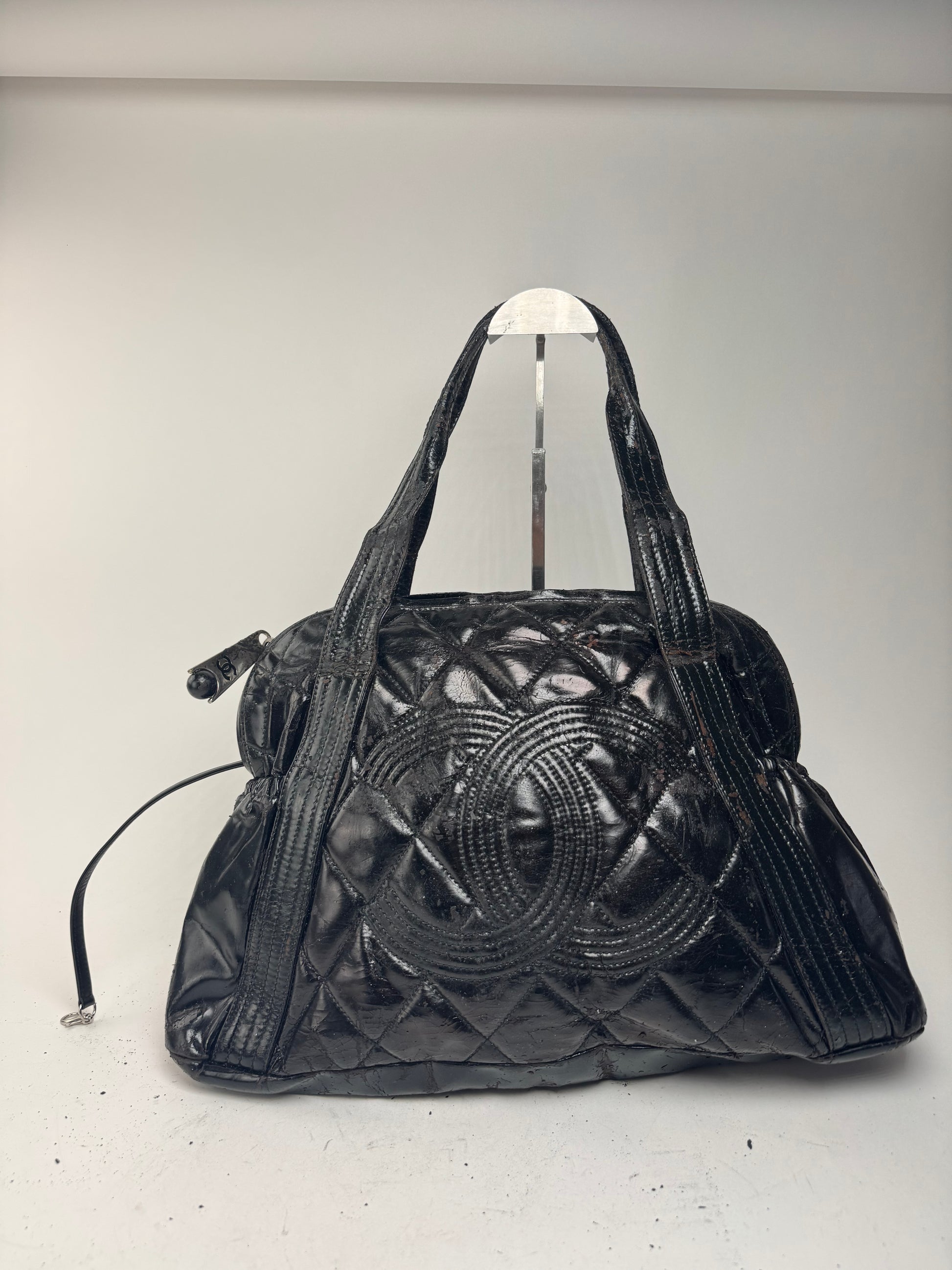 Ce sac à main sophistiqué est finement confectionné en cuir verni noir. Il est doté de deux poignées en cuir, d'une fermeture zippée en acier argenté et du logo CC emblématique de Chanel sur le devant. Il s'ouvre sur un intérieur en polyester noir.