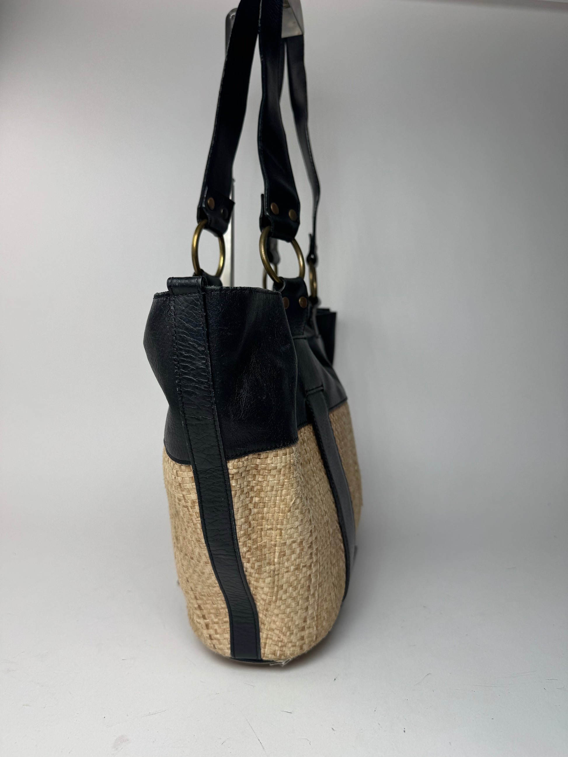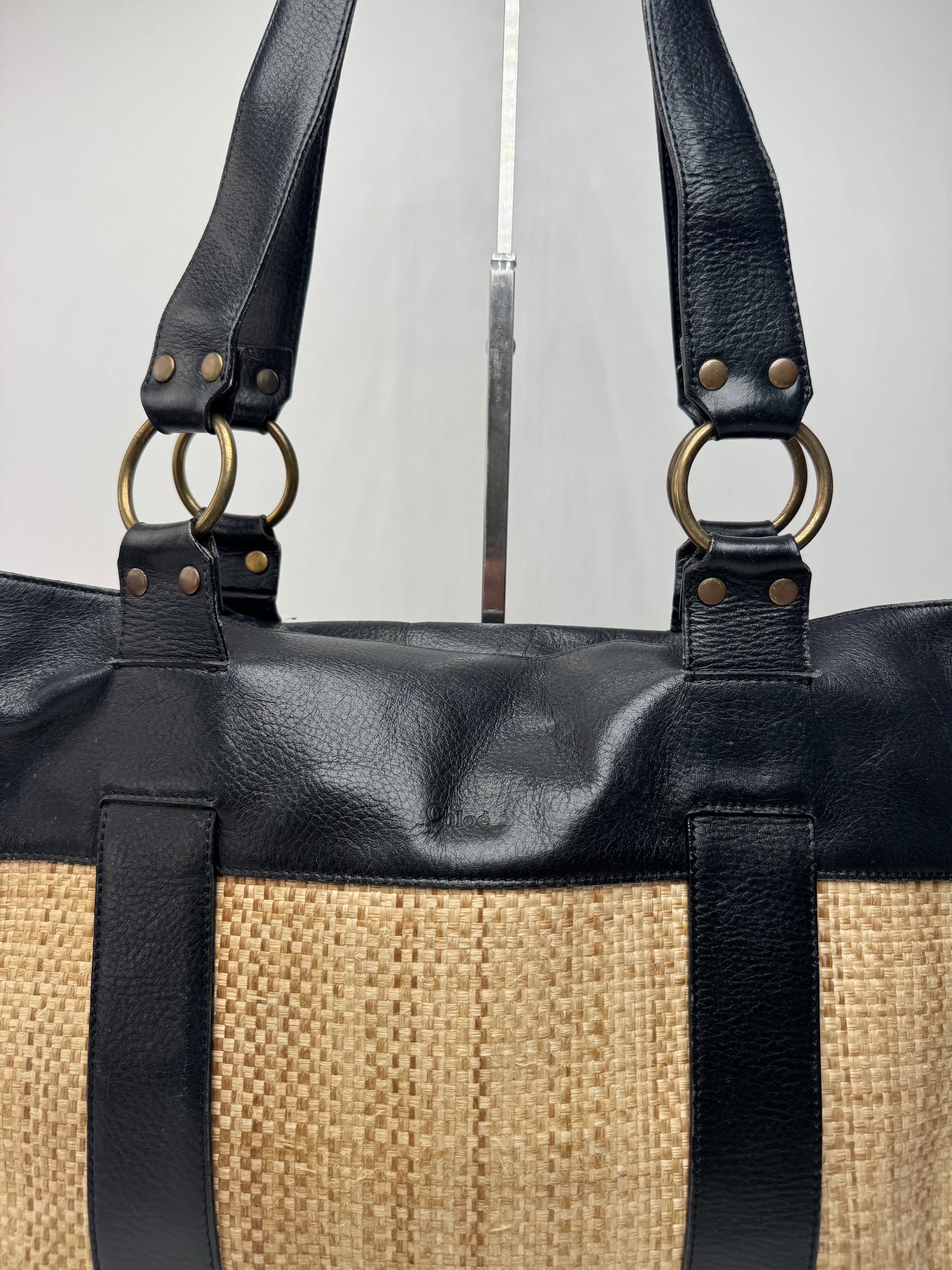 Ce sac à main élégant est finement confectionné en cuir noir associé à une matière beige effet paille. Il est doté de longues anses, d'accessoires en acier bronze et d'une fermeture magnétique légère. L'intérieur est doublé de toile noire.