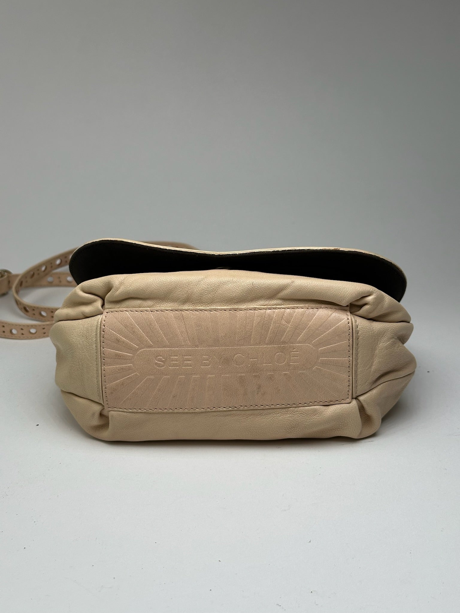 Sac bandoulière en cuir vintage bohème CHLOÉ. Ce sac à main chic est finement confectionné en cuir beige et rosé à la finition bohème. Il est doté d'une finition en acier doré, d'une bandoulière en cuir réglable (en option) et d'un rabat à fermeture magnétique. Le rabat s'ouvre sur un intérieur en toile noire.