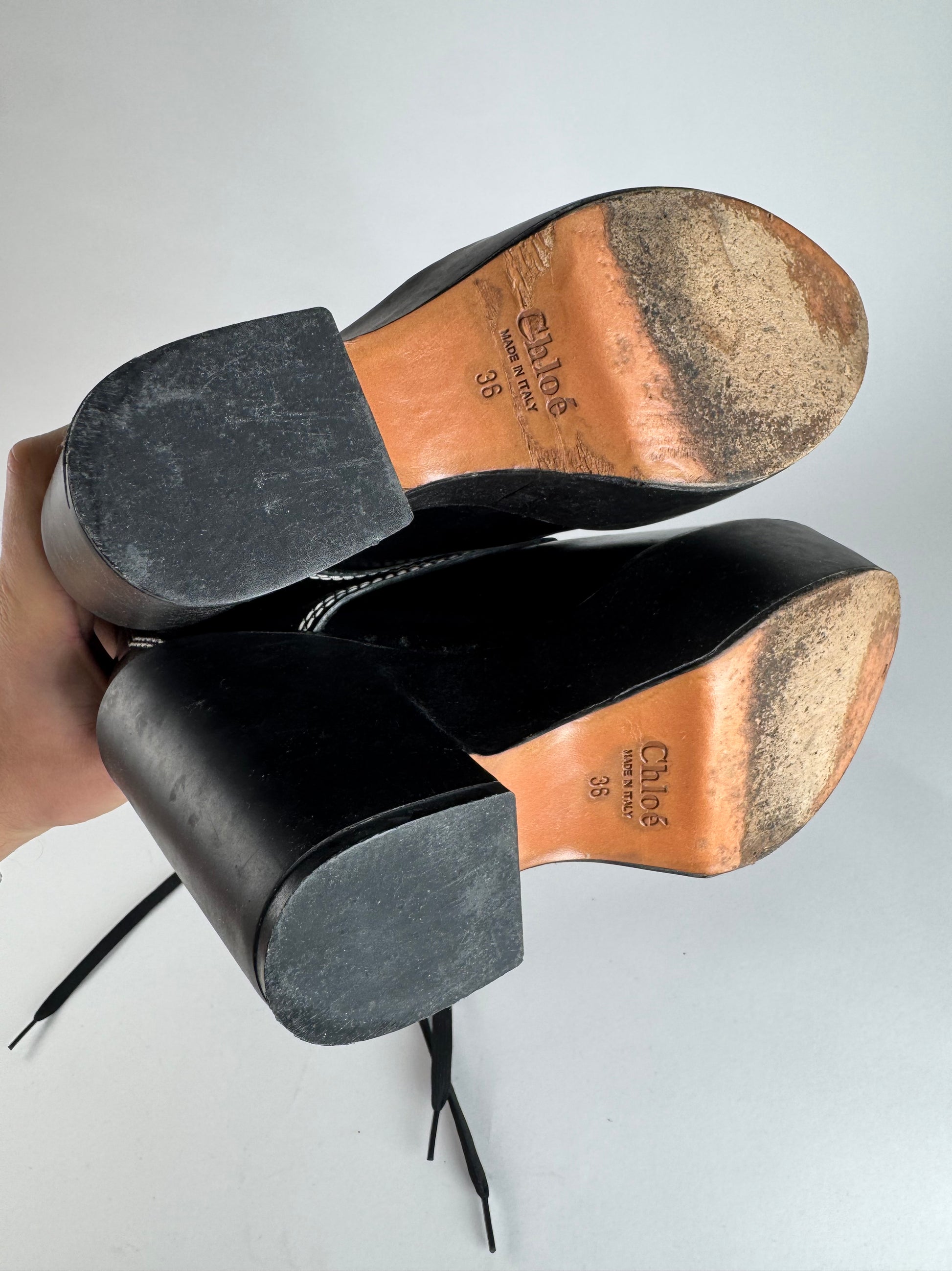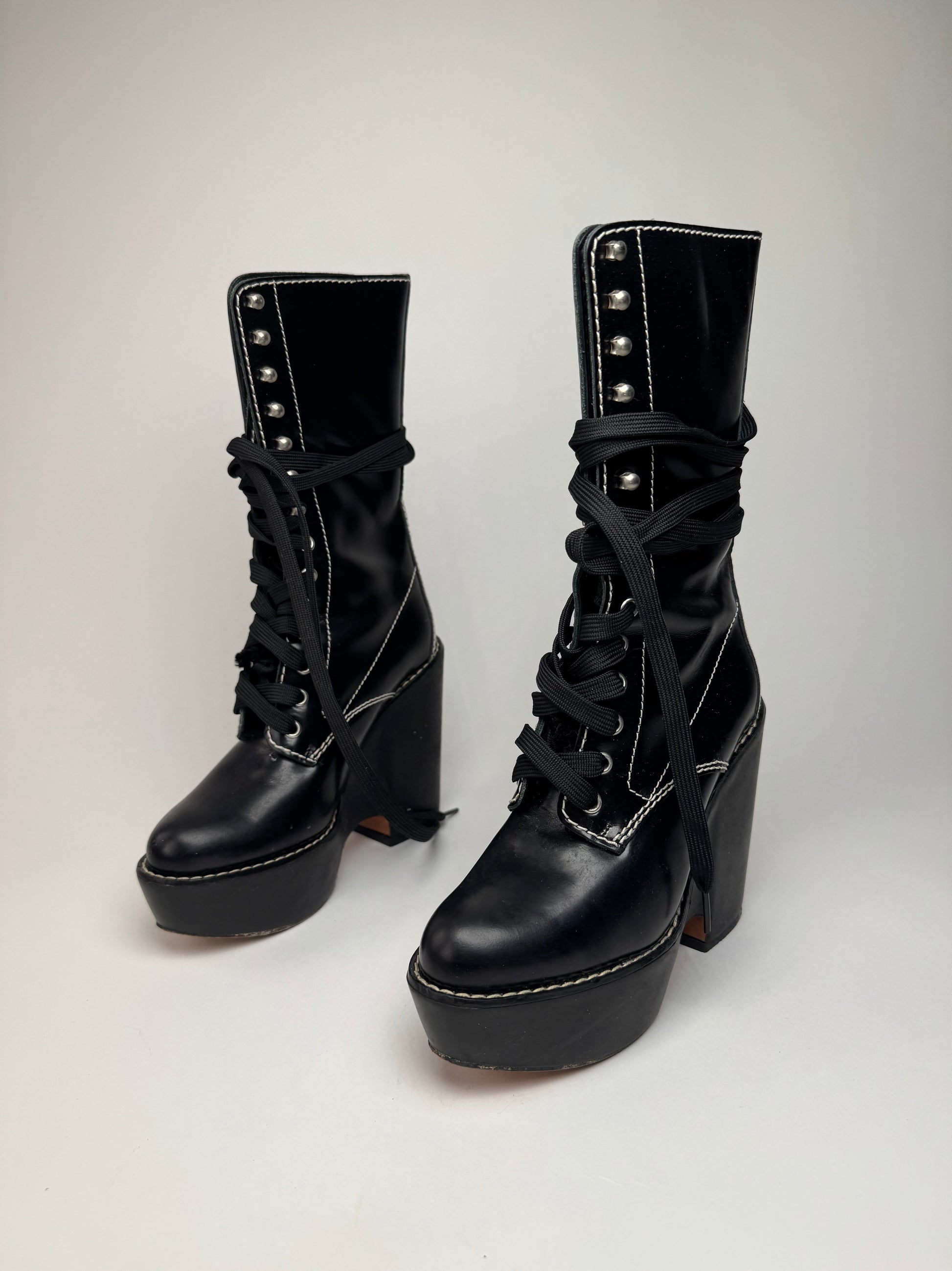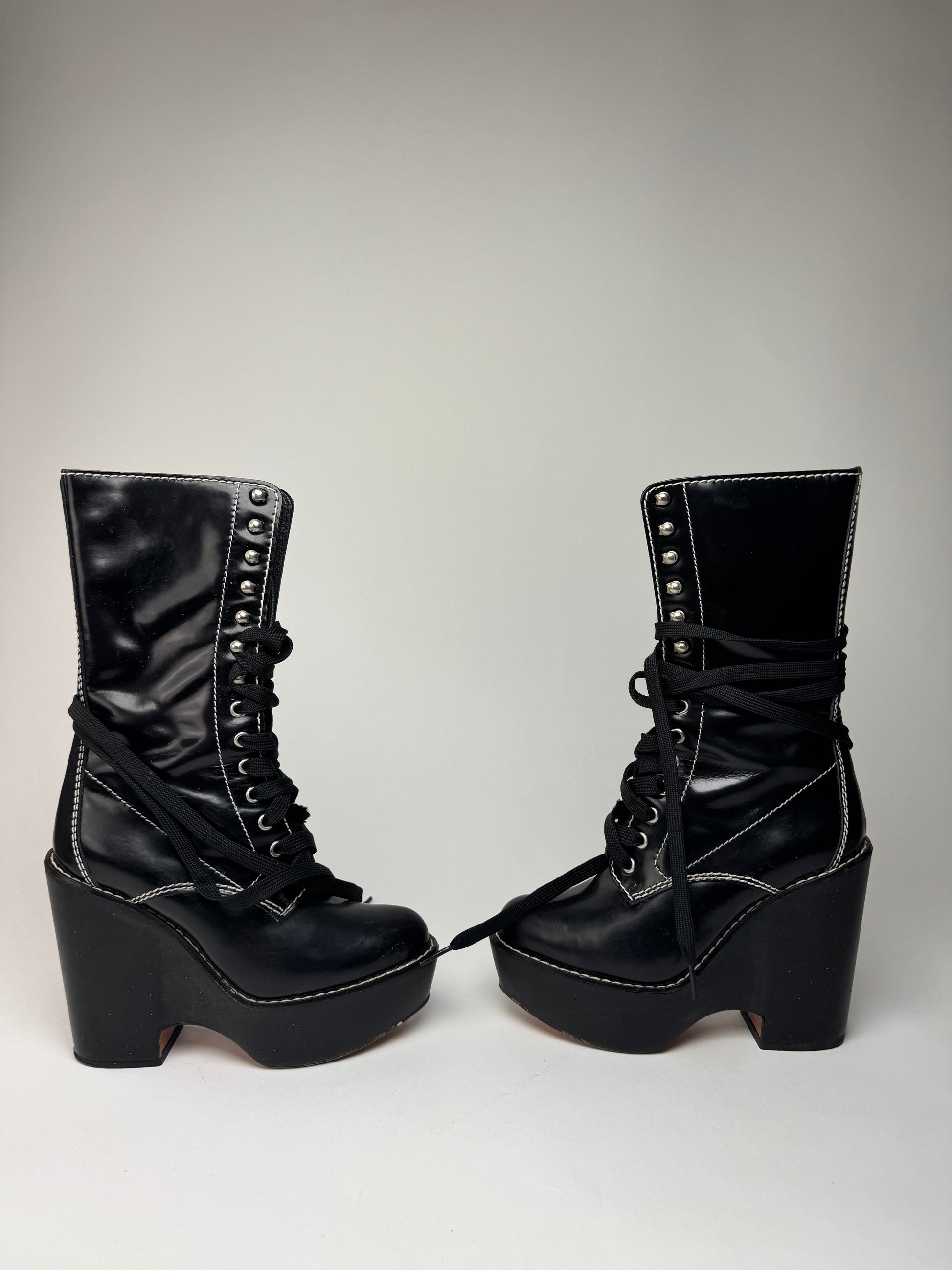 CHLOÉ Vintage Boots. These striking vintage boots are crafted of black patent leather with contrasting white stitching. They feature black canvas laces and silver-tone steel hardware. The sole is crafted of brown wood with a black synthetic base, creating a bold and elevated silhouette. Made in Italy, these boots combine refined craftsmanship with statement design.