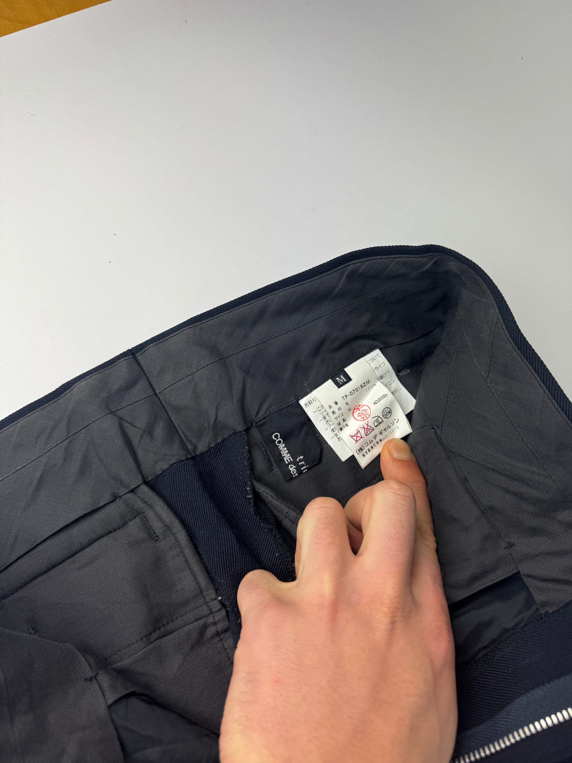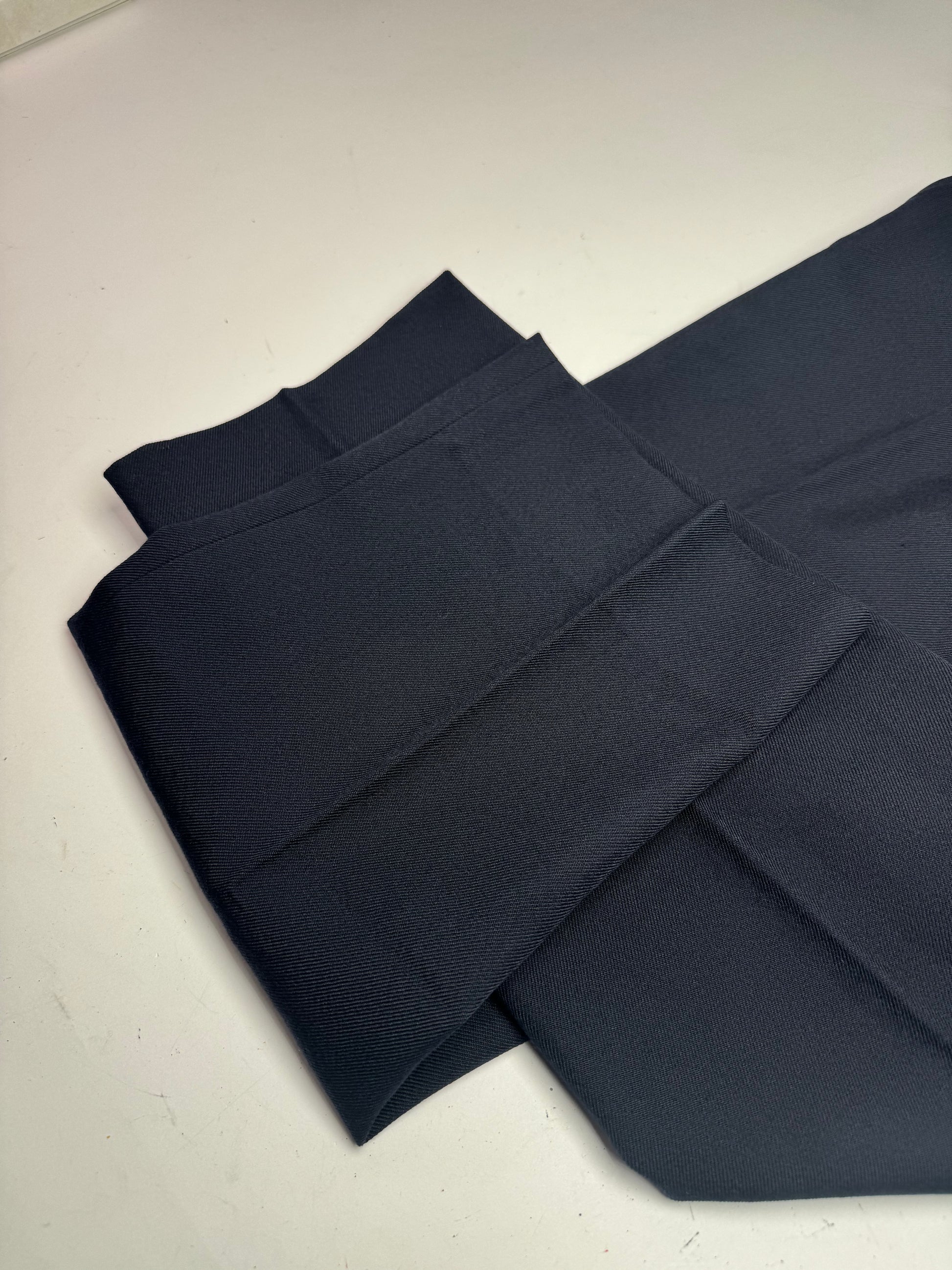 These sophisticated vintage trousers are crafted from 100% navy wool and feature a high-waist design — a signature of Comme des Garçons’ avant-garde yet timeless tailoring. The clean silhouette and refined fabric reflect the brand’s dedication to innovative structure and minimalist Japanese craftsmanship.