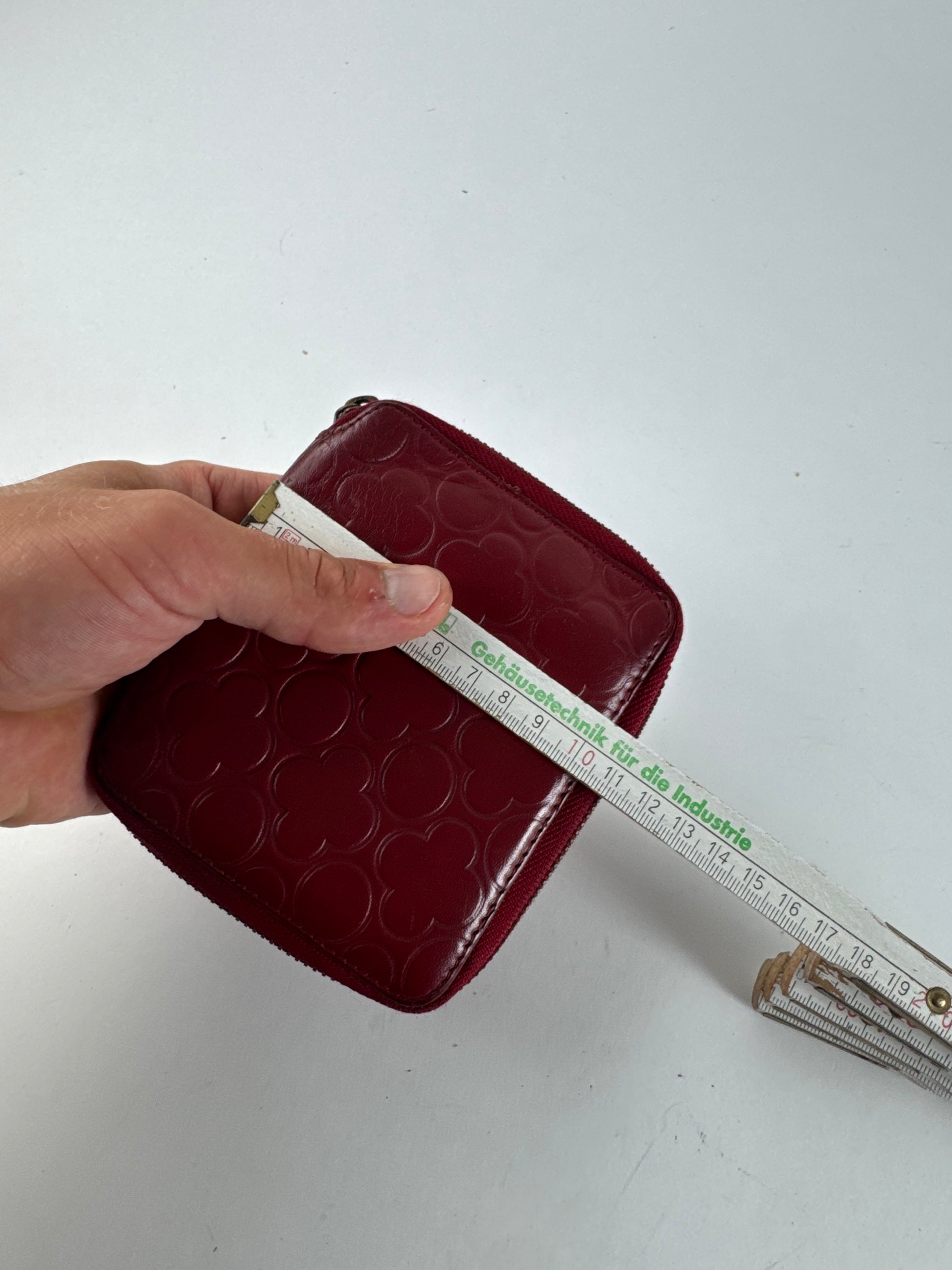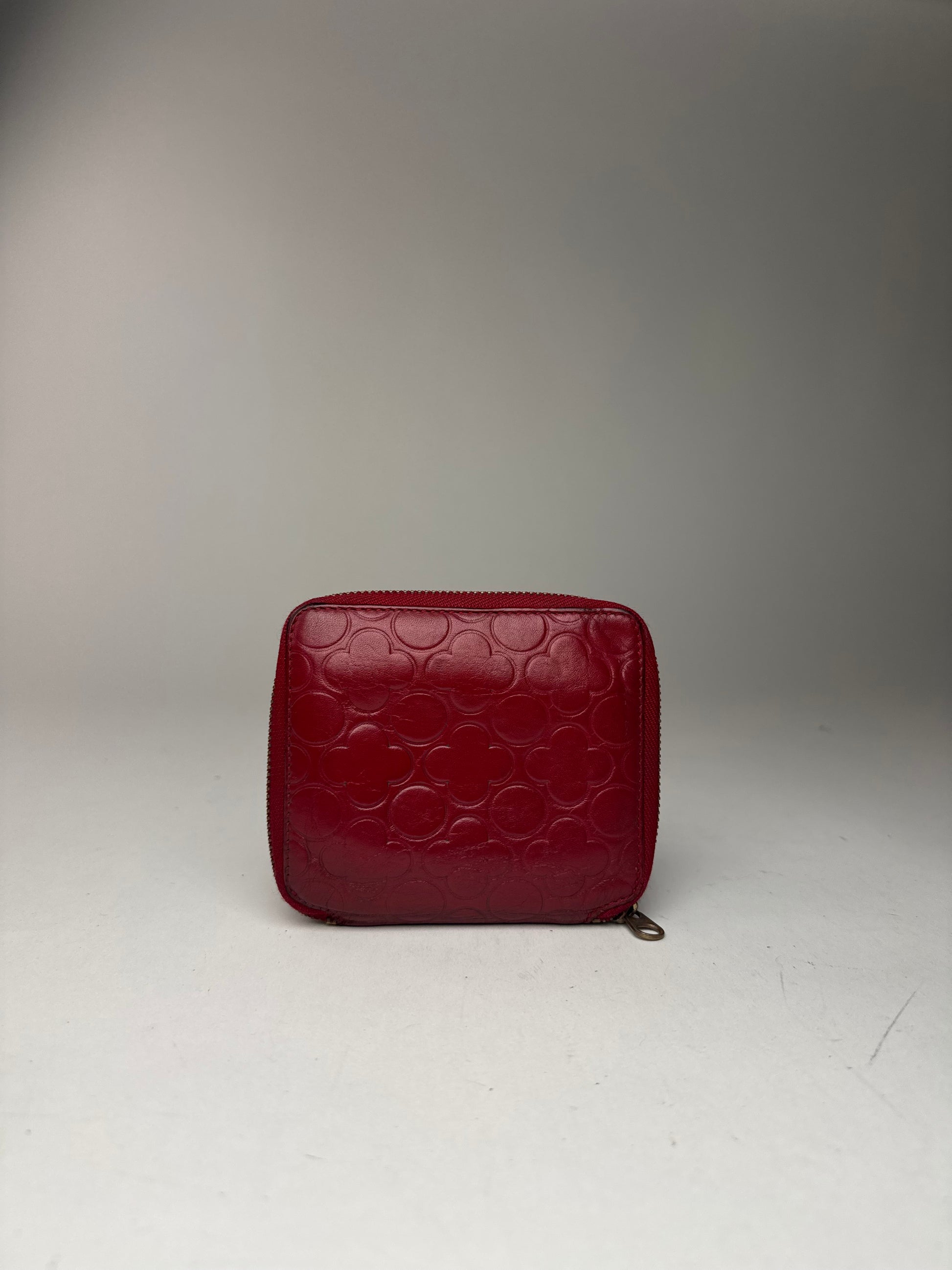 Portefeuille vintage COMME DES GARÇONS en cuir verni. Ce portefeuille vintage est finement confectionné en cuir verni rouge, orné d'un subtil motif croix et cercles. L'intérieur est doublé de cuir rouge uni et comprend des compartiments pour la monnaie, les cartes et les billets.